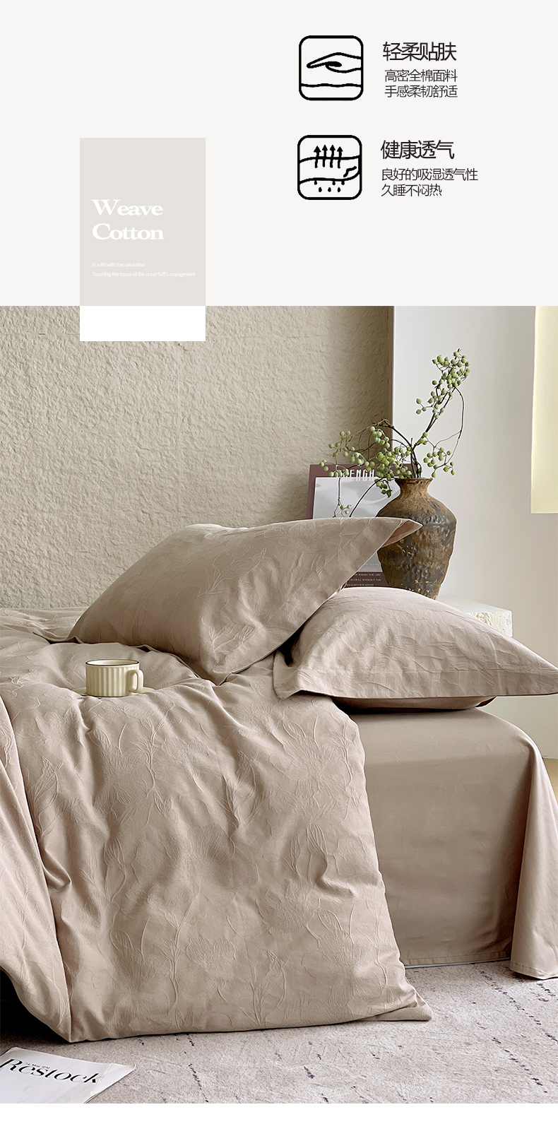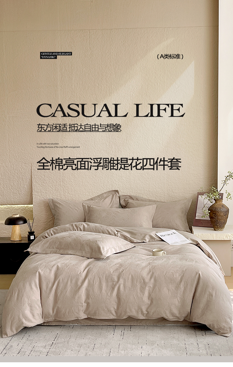 商品名称:麦田家纺 2026新款A类全棉亮面浮雕提花四件套 花柔玉净-金属灰