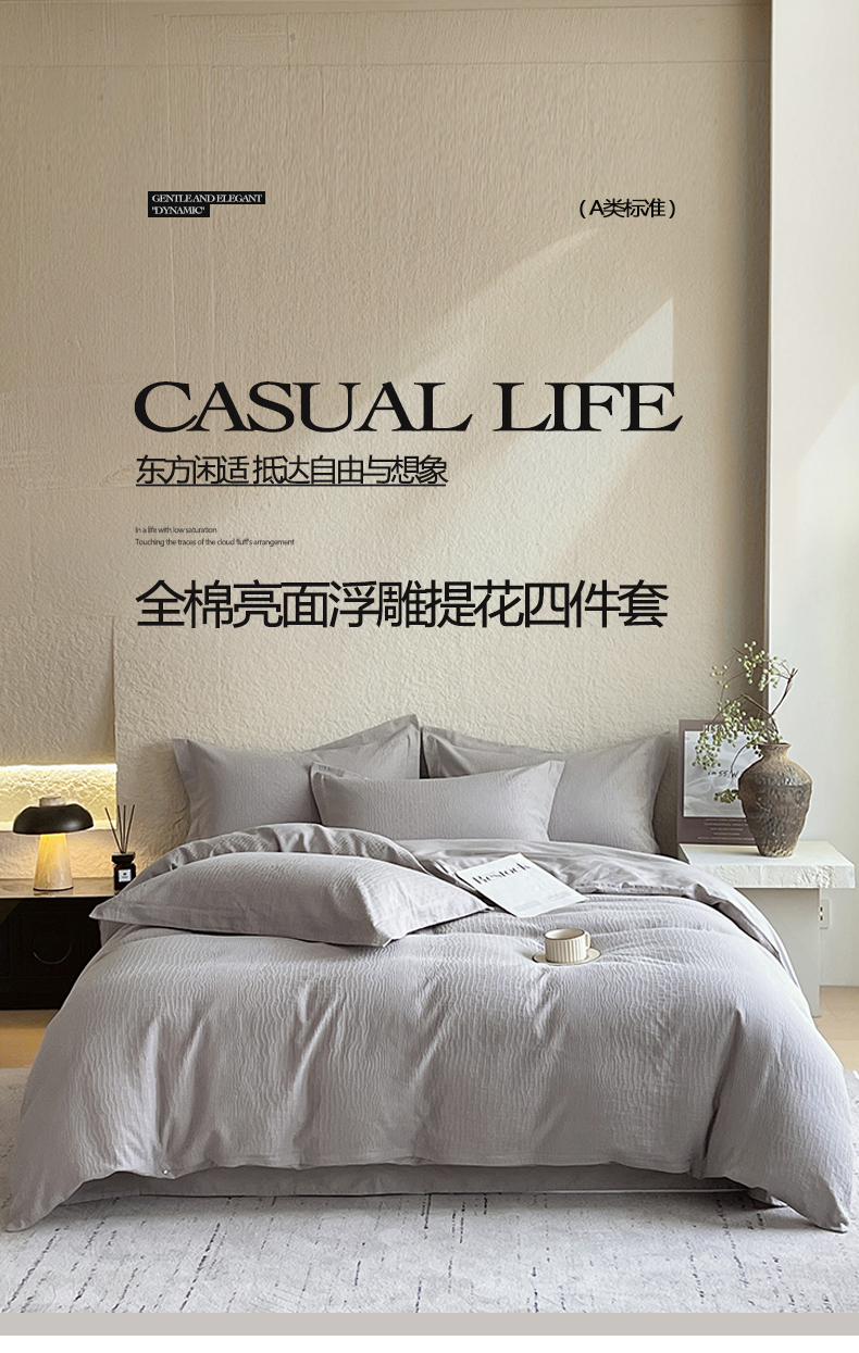 商品名称:麦田家纺 2026新款A类全棉亮面浮雕提花四件套 石烁-太空灰