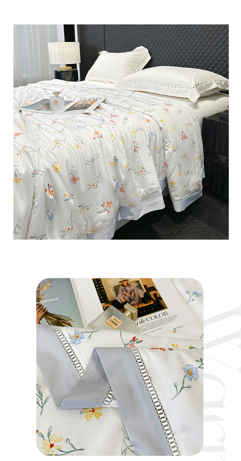 商品名称:薇玛仕 2026新款茶小纤60S长绒棉印花镂空款蚕丝夏凉被空调被 红袖添香-白