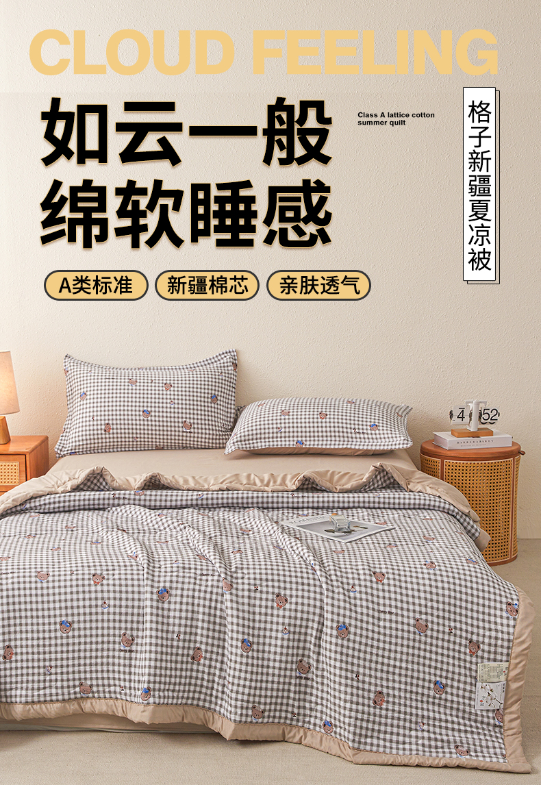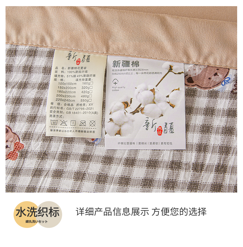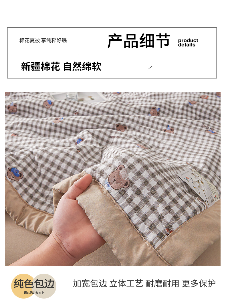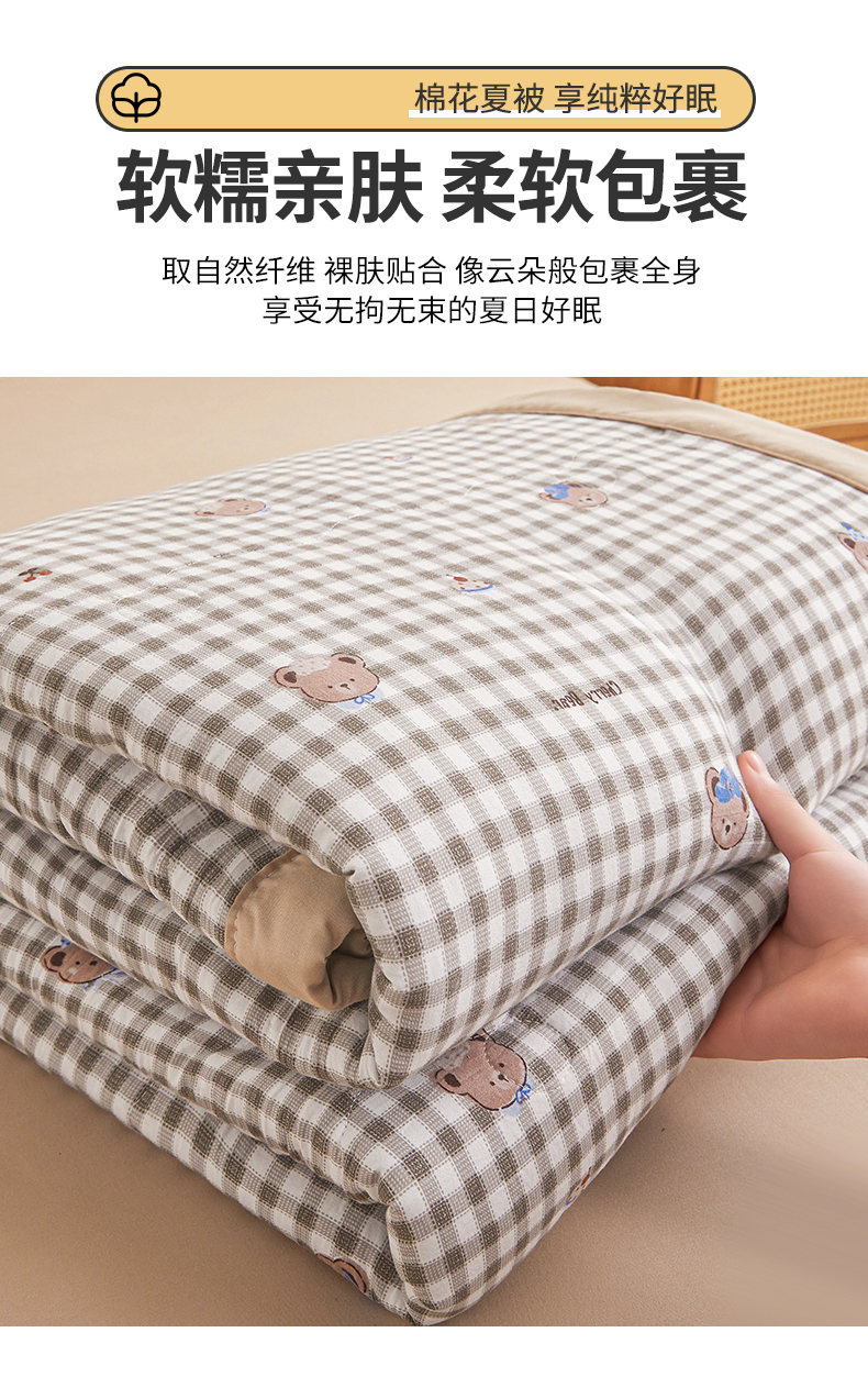 商品名称:西域种棉人·千百笠 2026新款A类新疆棉花夏凉被加宽包边水洗棉无印格子印花吸湿透气棉花夏被空调被 格子熊