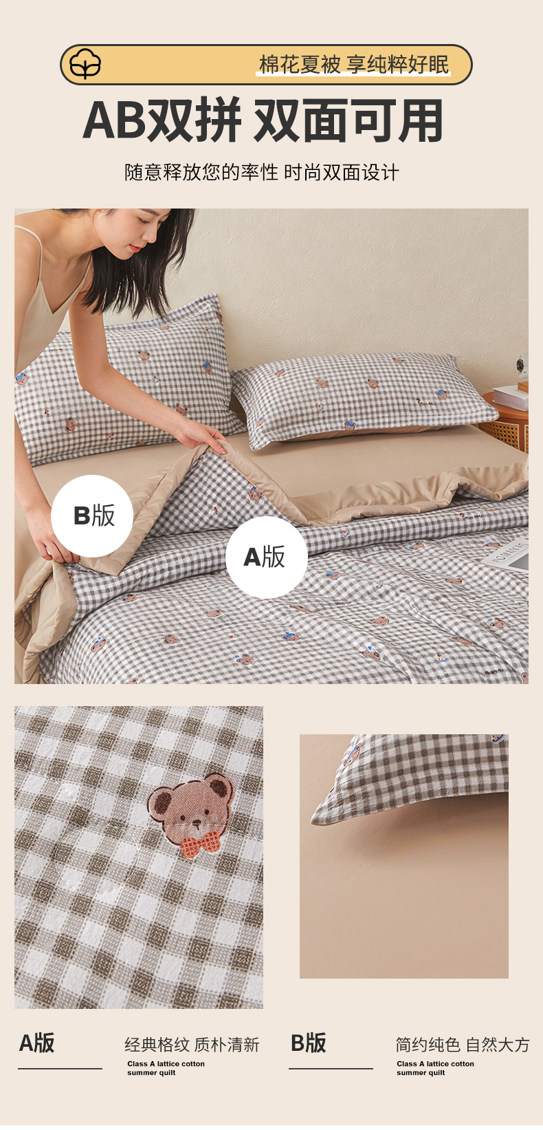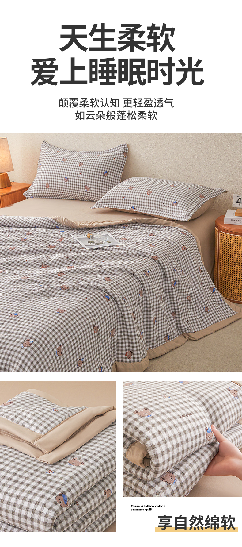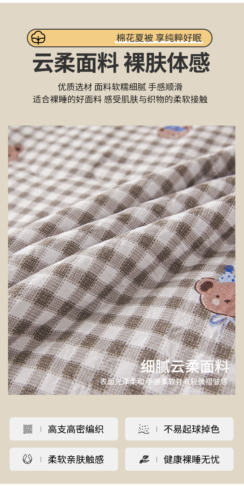 商品名称:西域种棉人·千百笠 2026新款A类新疆棉花夏凉被加宽包边水洗棉无印格子印花吸湿透气棉花夏被空调被 格子熊