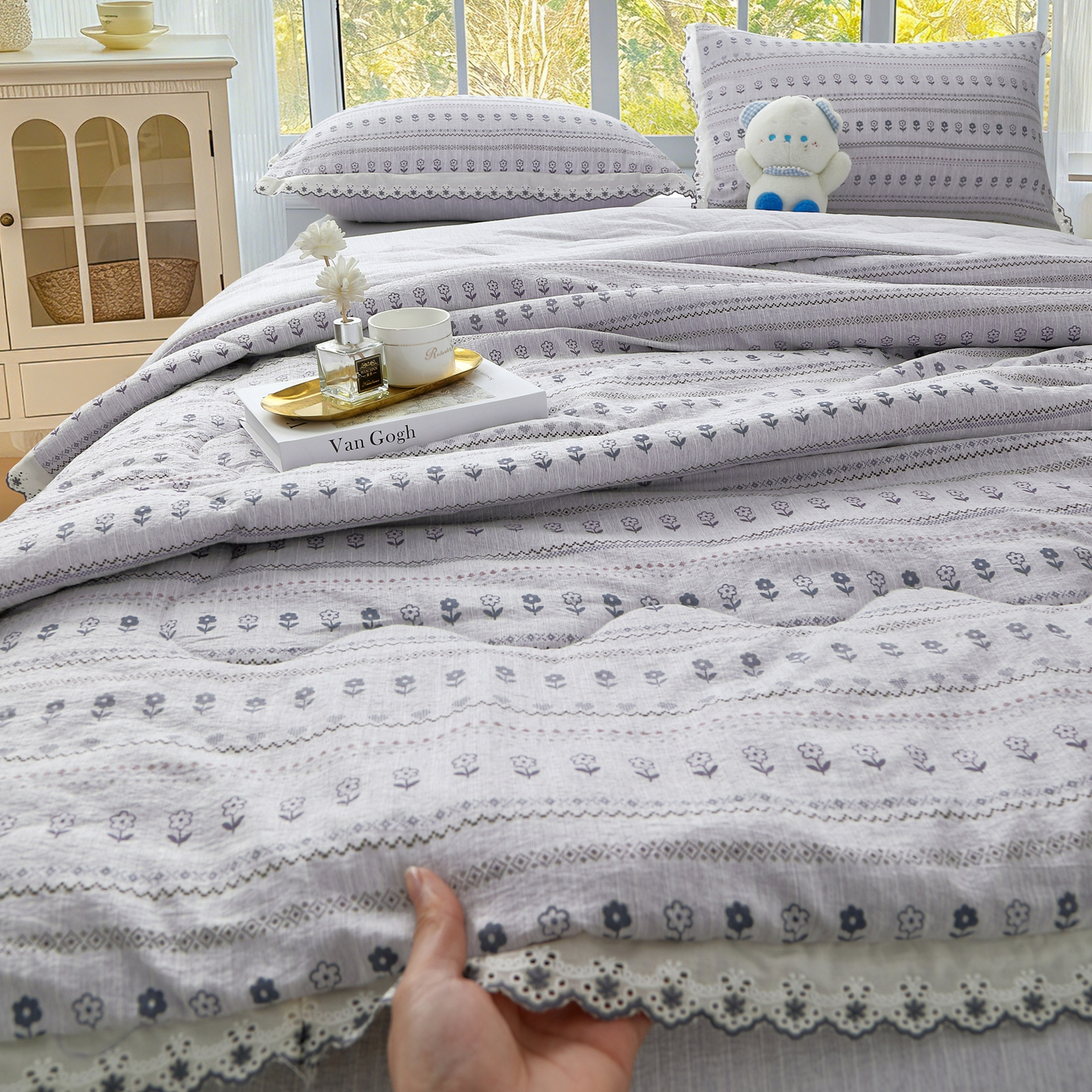 商品名称:恋之语 2026新款爆款花边色织水洗棉夏被夏凉被空调被四件套 浅蓝萌宠
