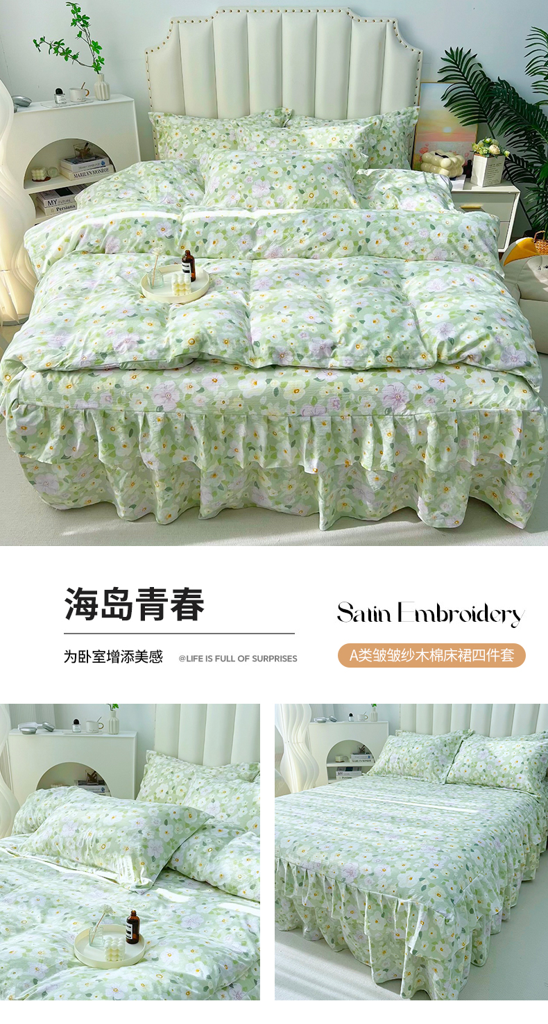 (总)九诺家纺 2025新款活性印花ins风小碎花软糯皱皱棉床盖款四件套双花边款被套,繁花似锦,心相印,花仙子,梦露,爱丽丝-蓝,薄荷之约,流金豹纹