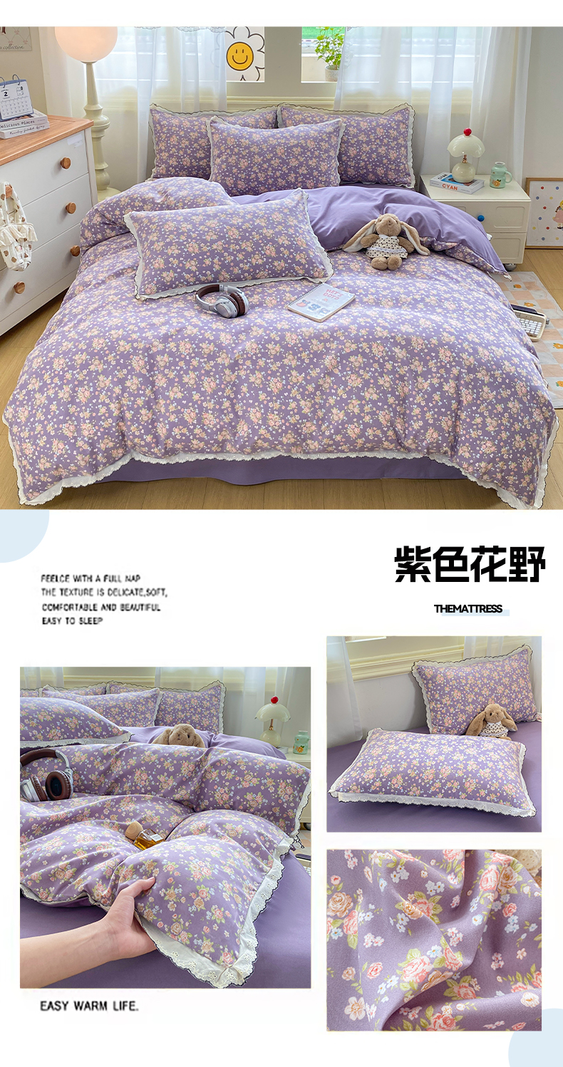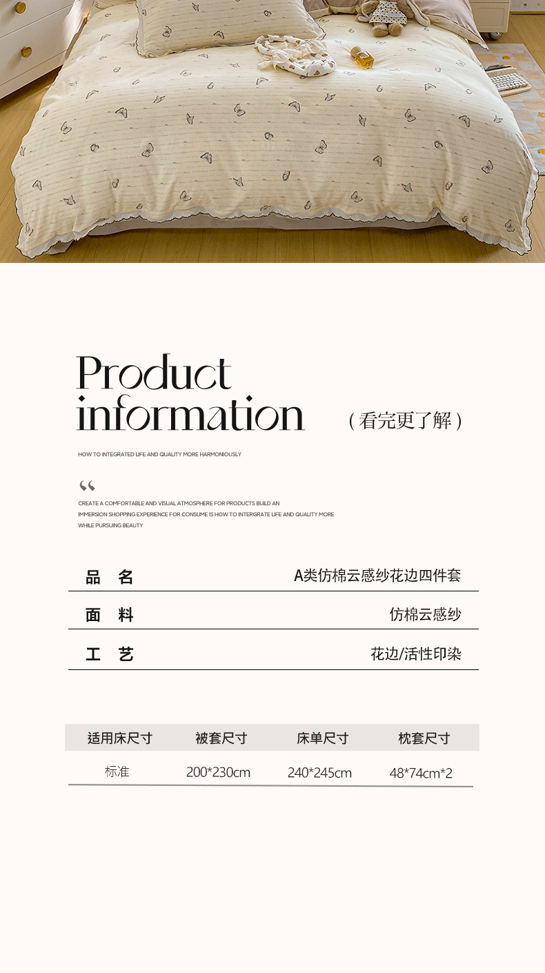 (总)豫见家纺 2026新款A类仿棉云感纱花边四件套,浪漫花叙,梦境之间,芊芊花海,碎花眠语,暗香,草莓多多,春风里,梵高印象,粉豹纹,狗狗家族,蝴蝶梦,琥珀流光,花漫漫,花影如梦,浪漫蔷薇,栗色木马纹,木马乐园,年华,日光漫游,赛琳娜,山茶左岸,线条表情狗,小鱼心事,雨沫蝴蝶结,紫色花野,紫藤花开