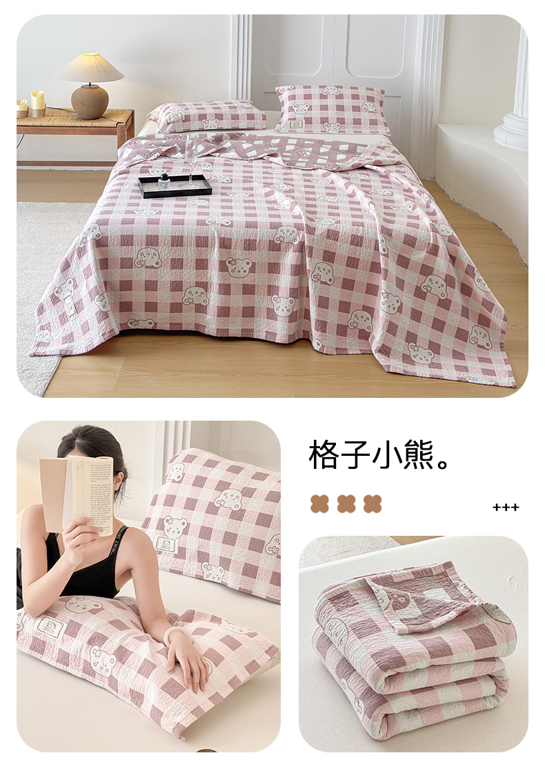 (总)乐家毛巾被(工厂自产自销) 2026新款A类新疆长绒棉色织提花双层纱千鸟格系列夏被,粉色,咖色,玫红,棕红