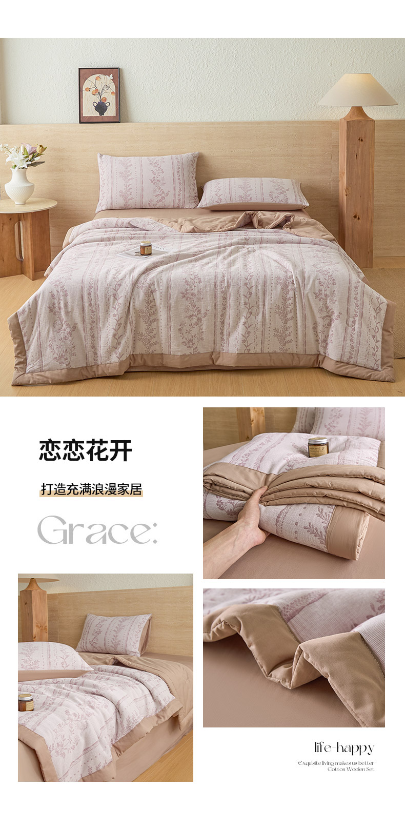 • 91家纺网 家纺一手货源 找家纺 吾诺家居 2026新款全棉色织提花三层纱夏被夏凉被空调被-华美 恋恋花开