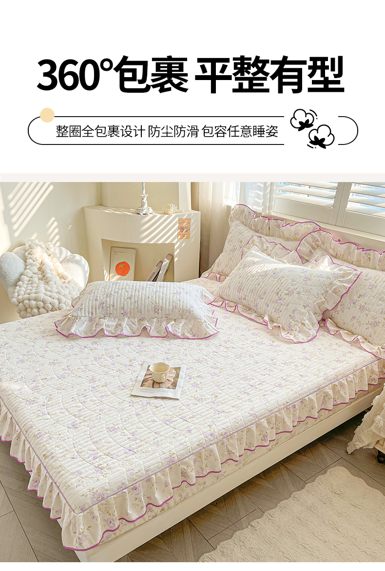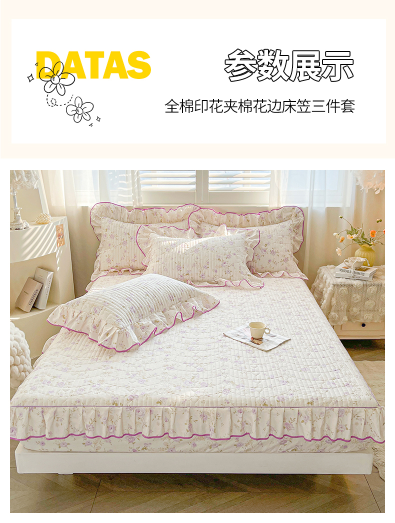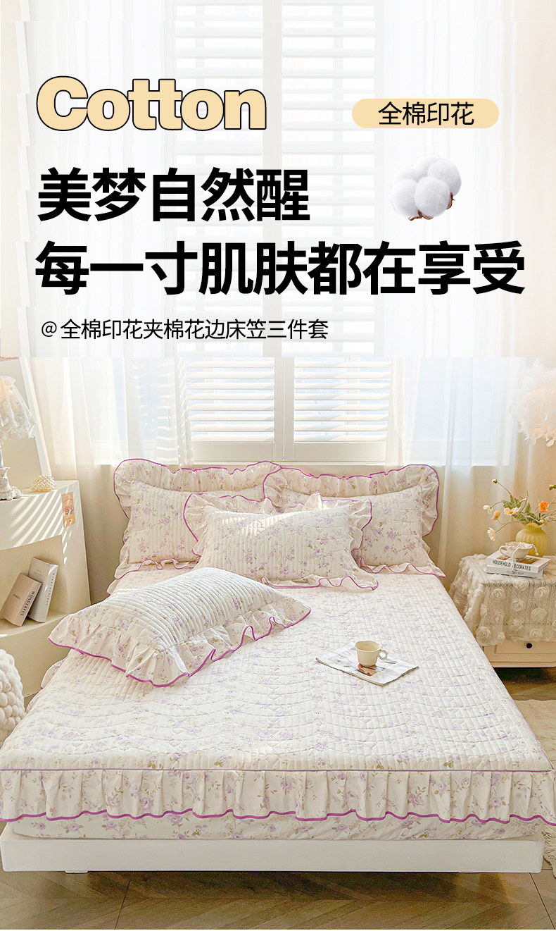 (总)宜凡家纺 2026新款全棉印花夹棉花边床笠三件套,海棠之恋,镜花映月,水苏栀清,玉容昭婉
