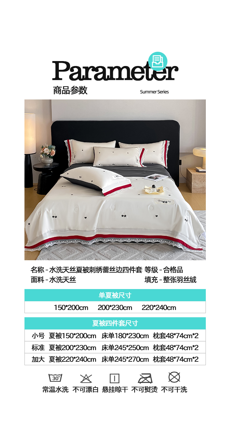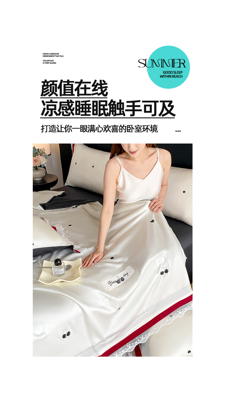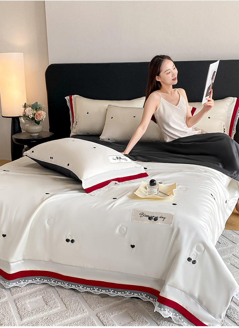• 91家纺网 家纺一手货源 找家纺 置顶家纺 22026新款水洗天丝夏被刺绣樱桃四件套 克洛伊-白+黑