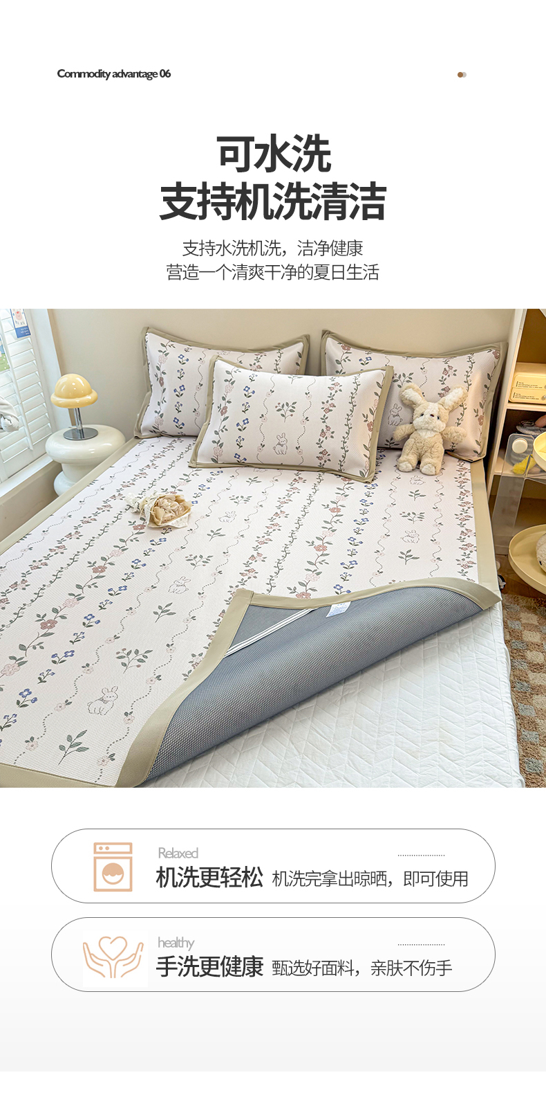 商品名称:懒猫家纺 2026春夏新款600D数码印花冰藤凉席席子-床席款 兔兔花开