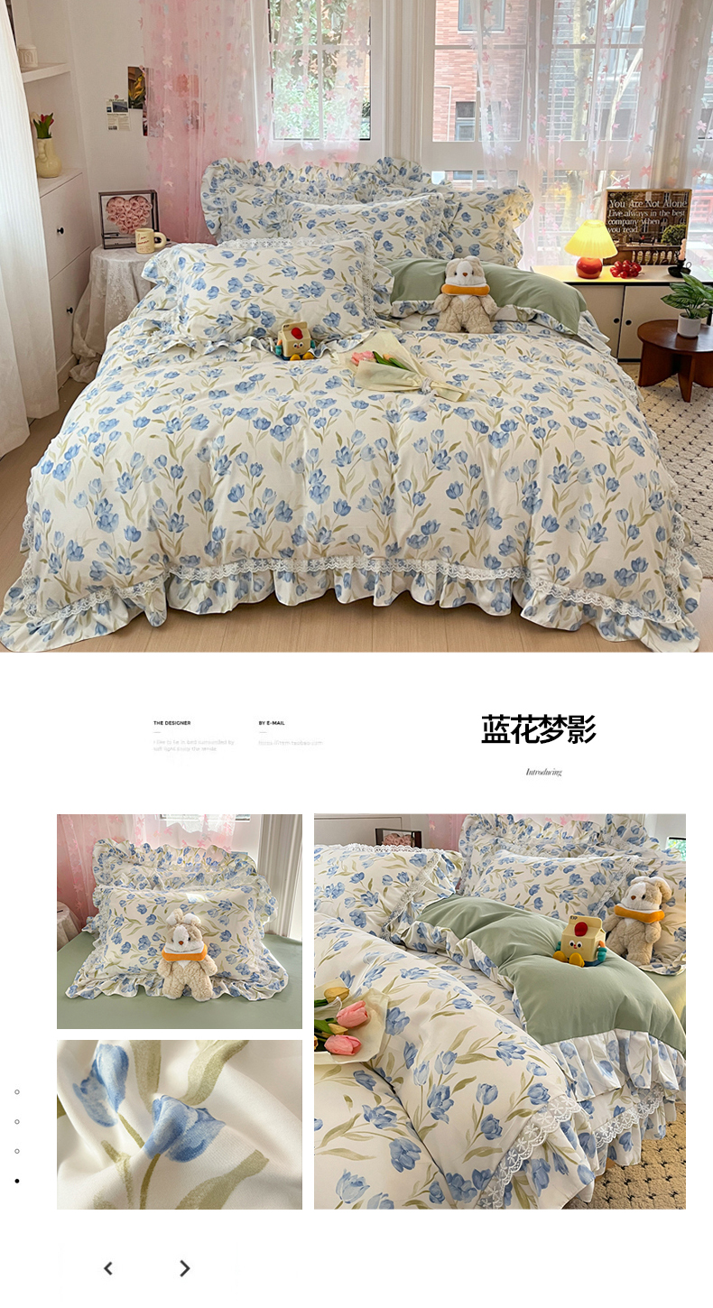 商品名称:畅畅家纺 2026新款春秋韩版A类公主风云柔棉工艺款花边四件套 珍珠蓝花境