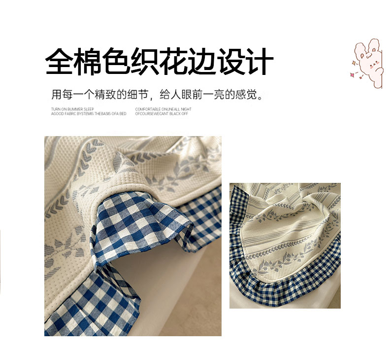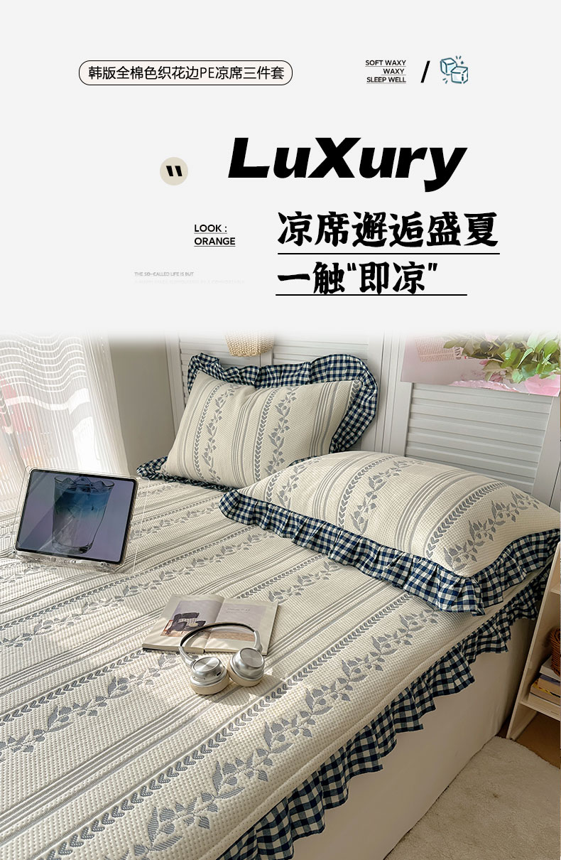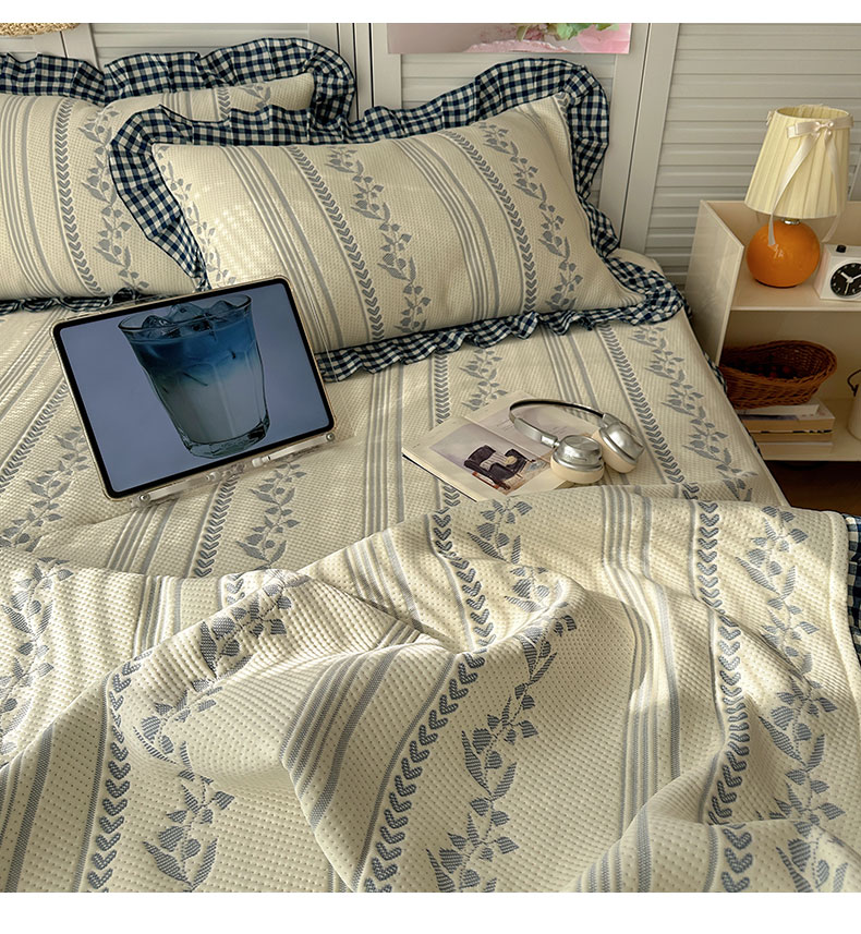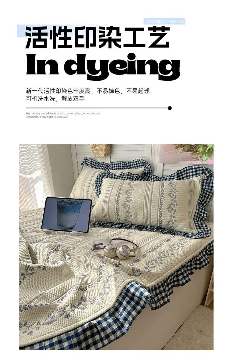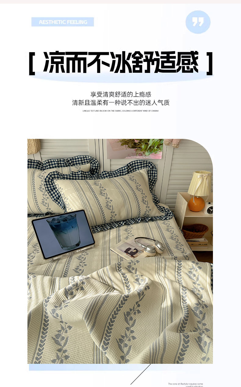 当前位置: 91家纺网 > 商品网购 > 床上用品 > 凉席 > 其他凉席 > 桃子家居 2026新款A类韩版全棉色织花边工艺提花PE凉感凉席席子凉席三件套系列 PE花边席-花西子蓝