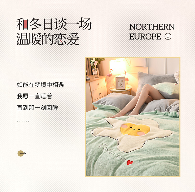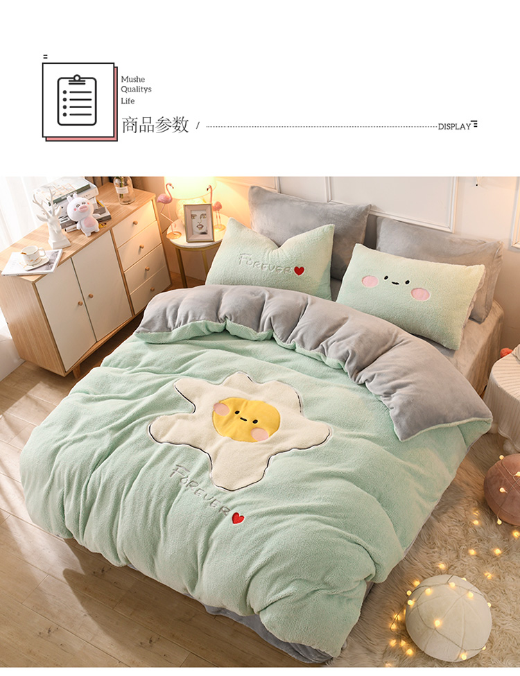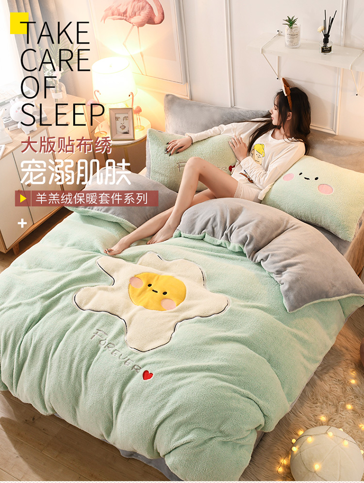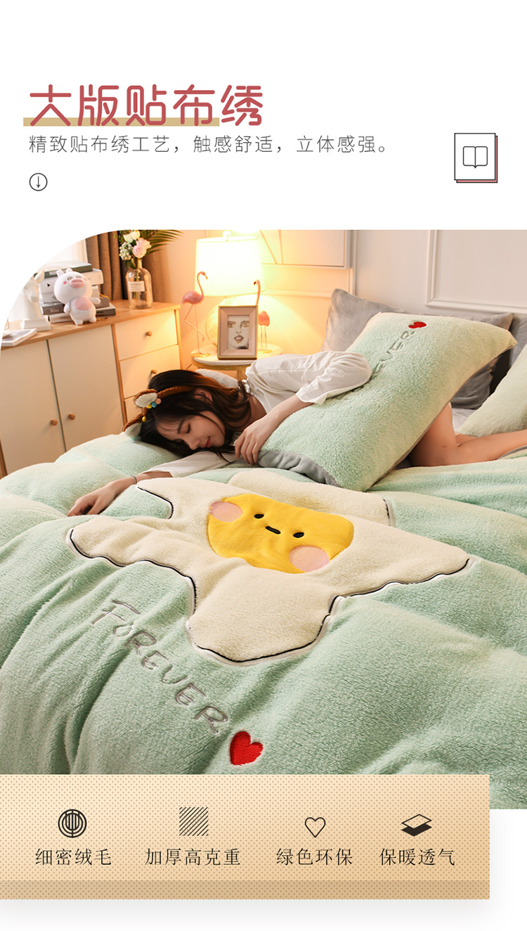 商品名称:朗莎家纺 2019新款大版贴布绣羊羔绒保暖四件套 荷包蛋抹茶绿