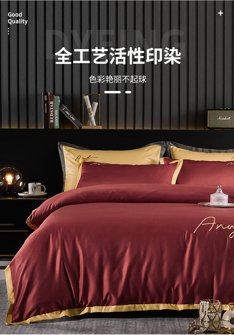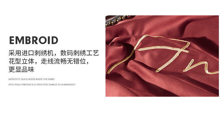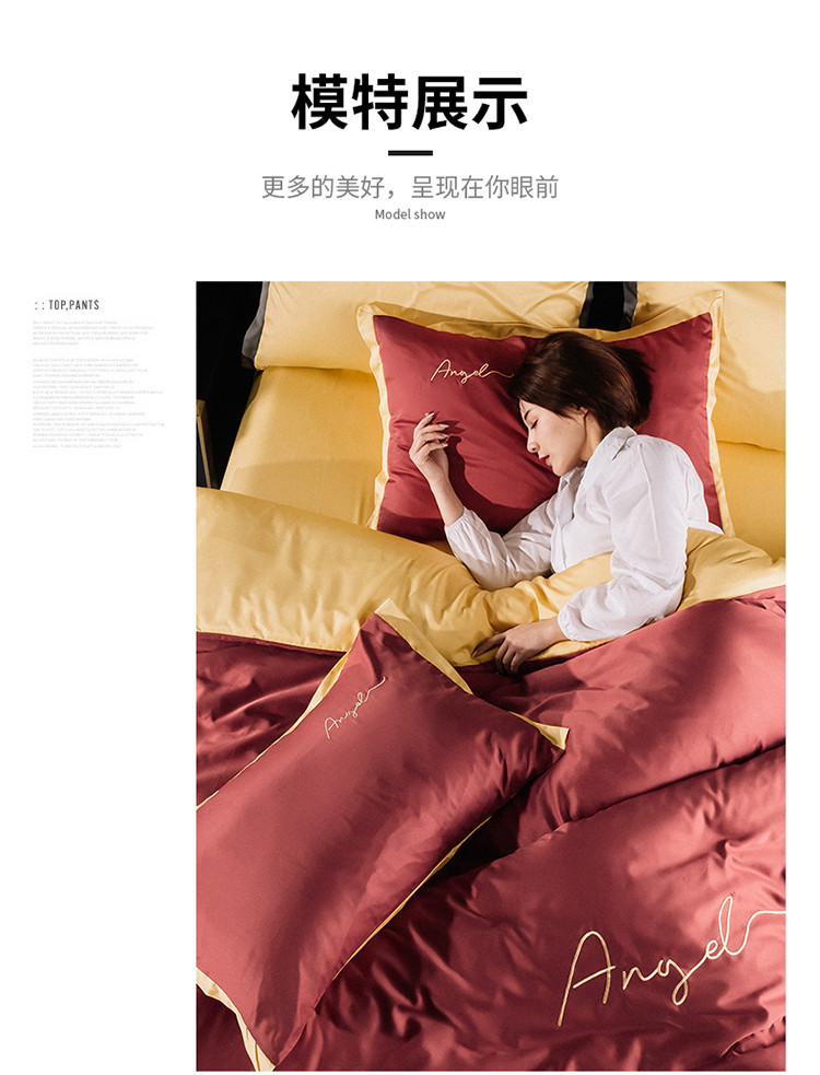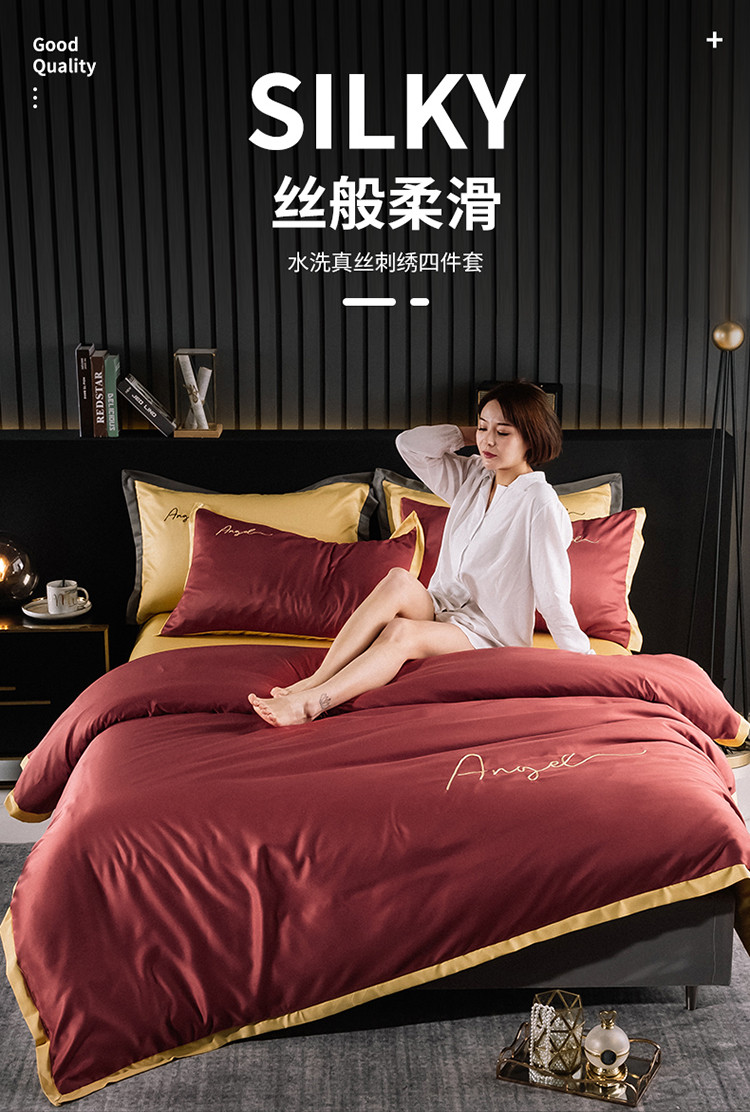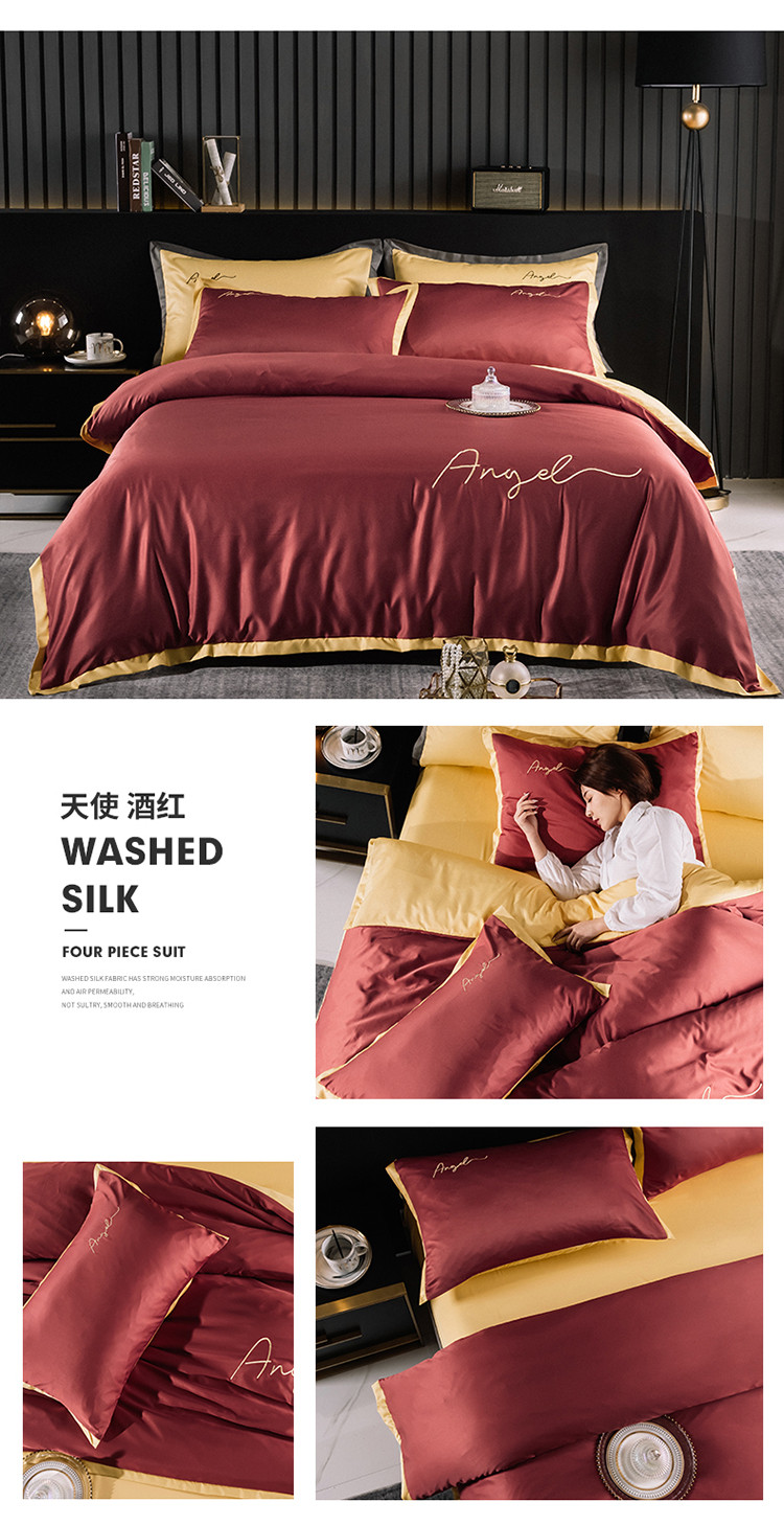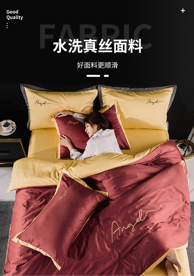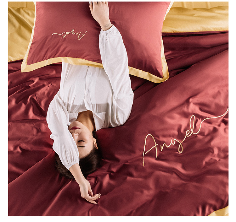 商品名称:芃成 2020新款水洗真丝天使宽边绣花四件套 天使-酒红