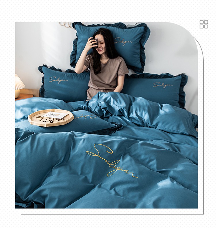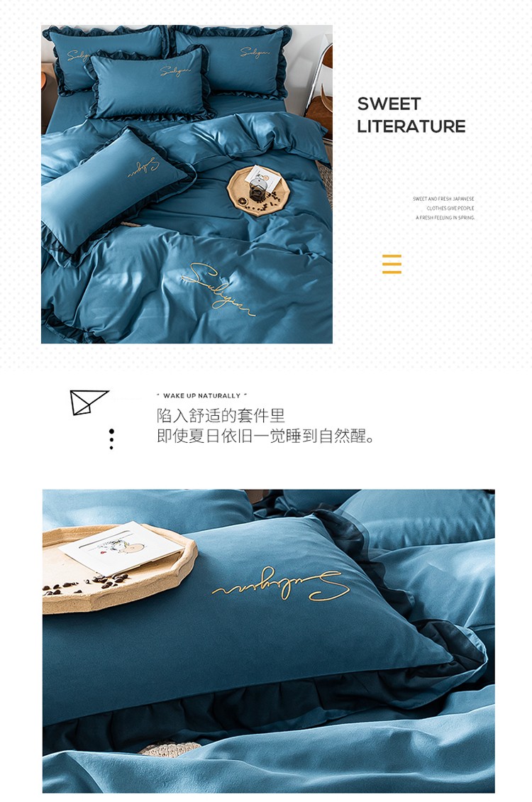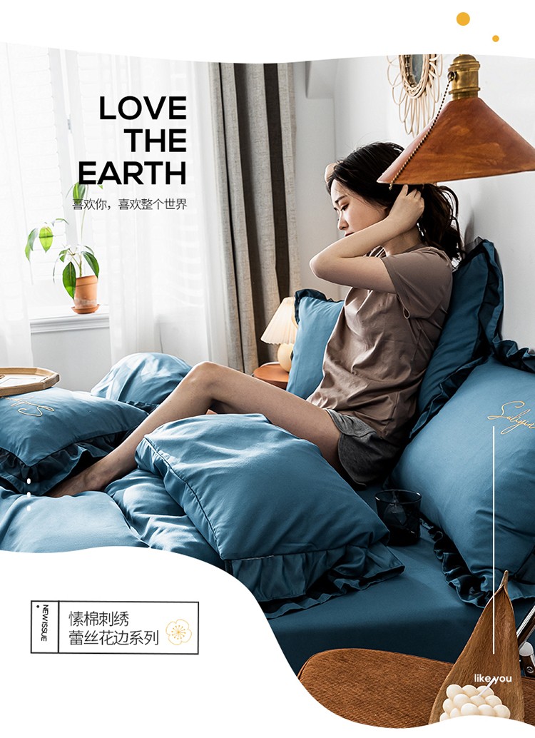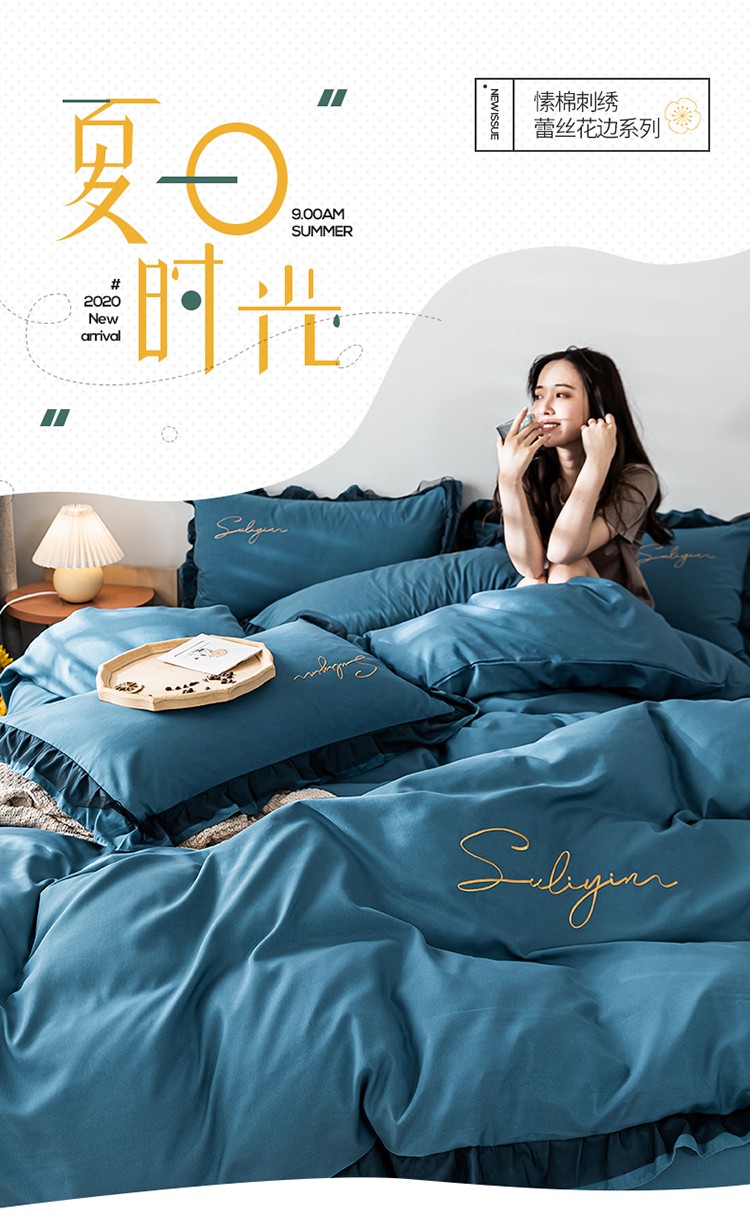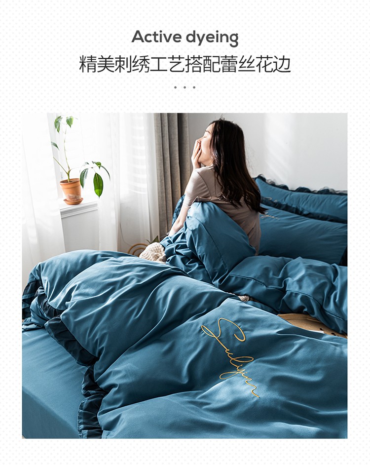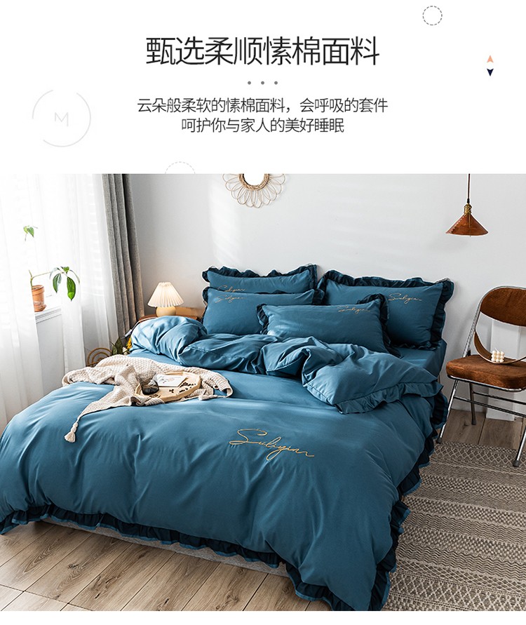 金麦家纺 2020新款愫棉刺绣蕾丝花边四件套 月光蓝