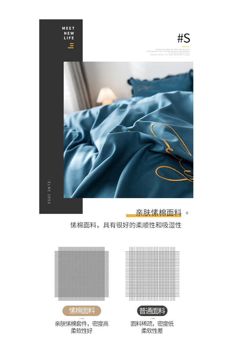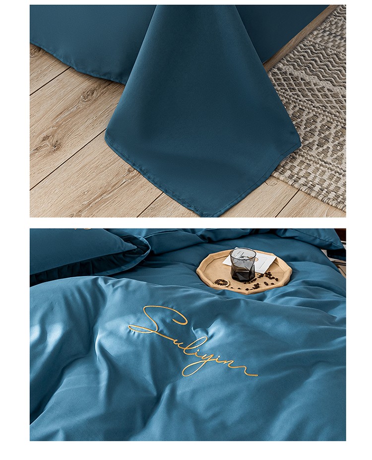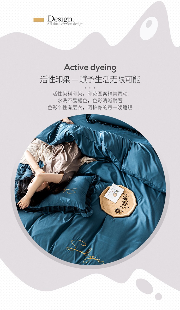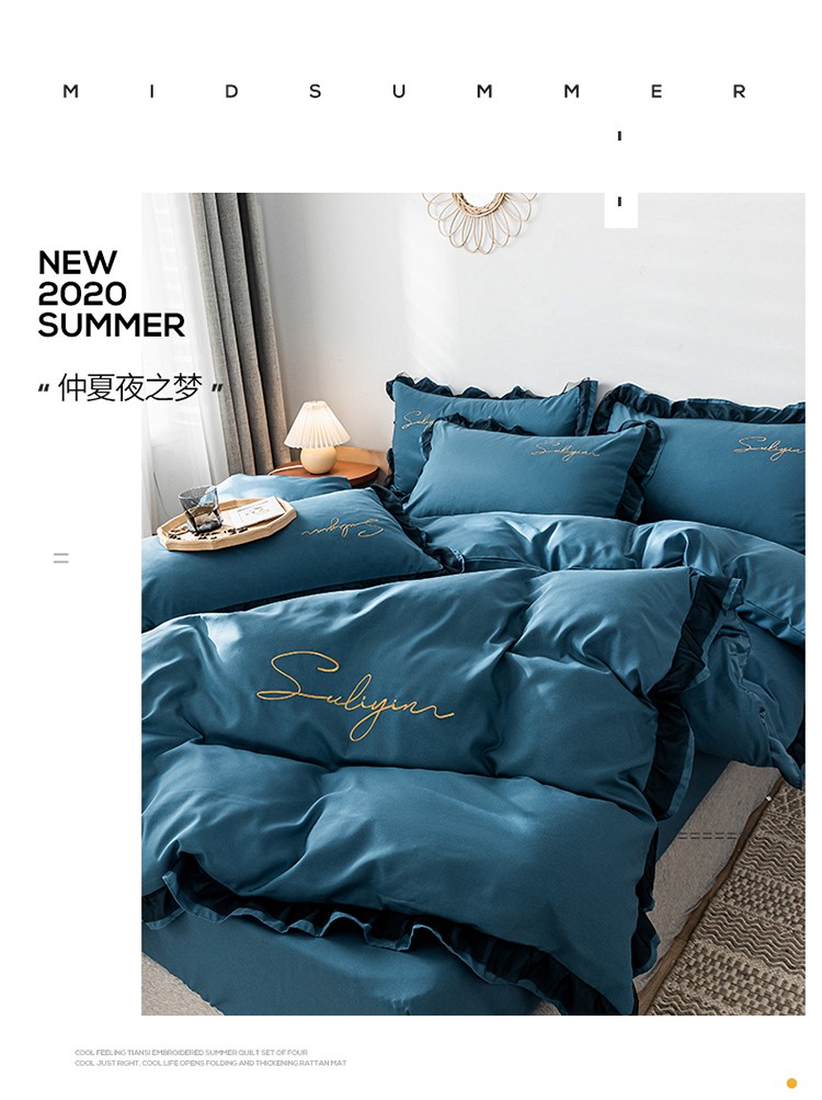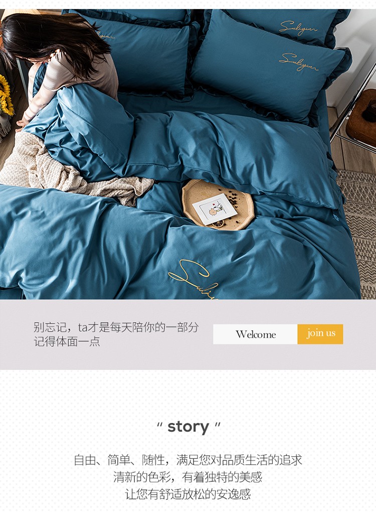 金麦家纺 2020新款愫棉刺绣蕾丝花边四件套 月光蓝