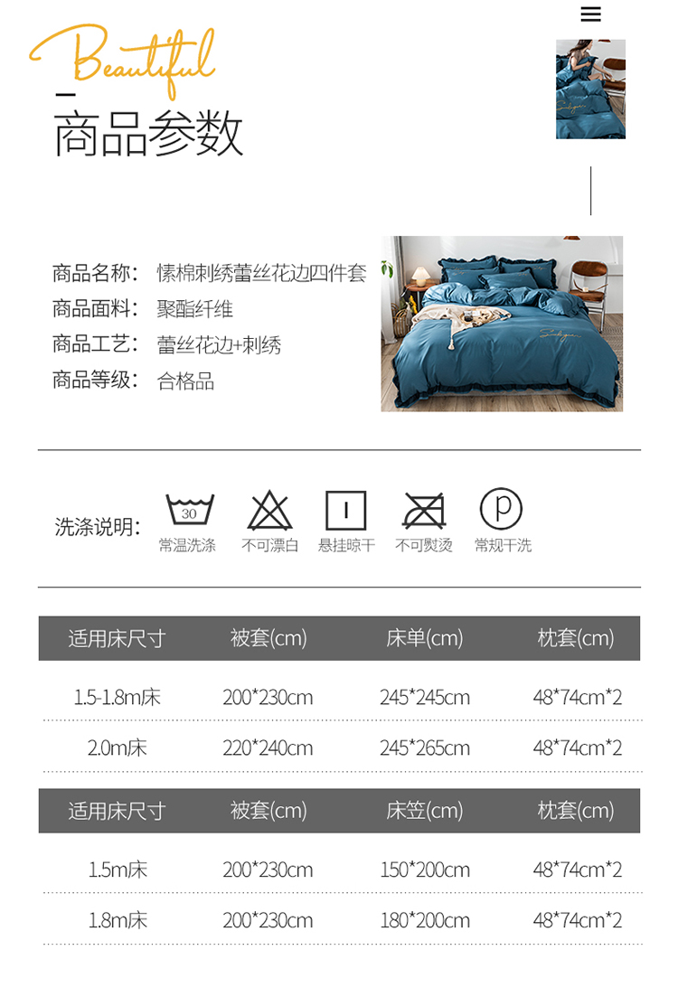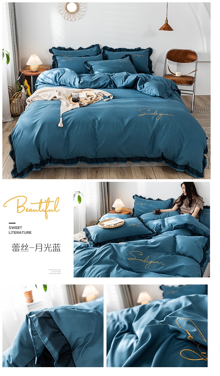 商品名称:金麦家纺 2020新款愫棉刺绣蕾丝花边四件套 月光蓝