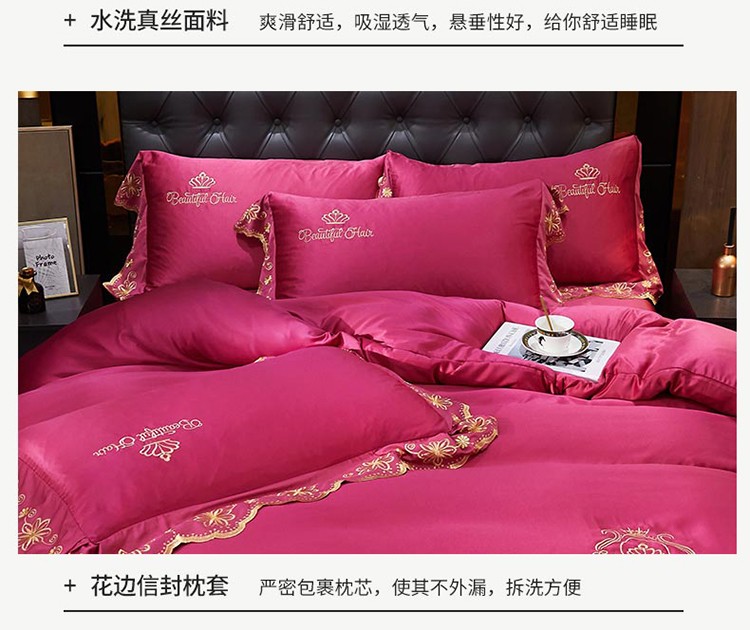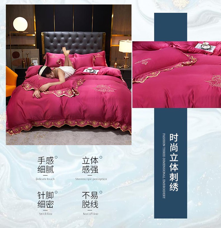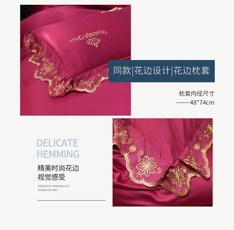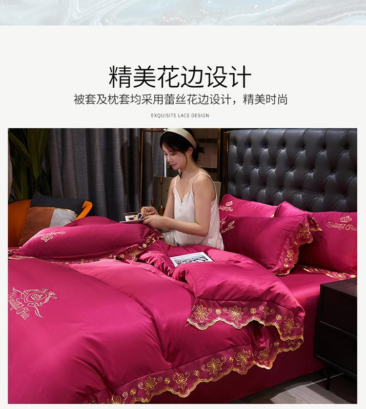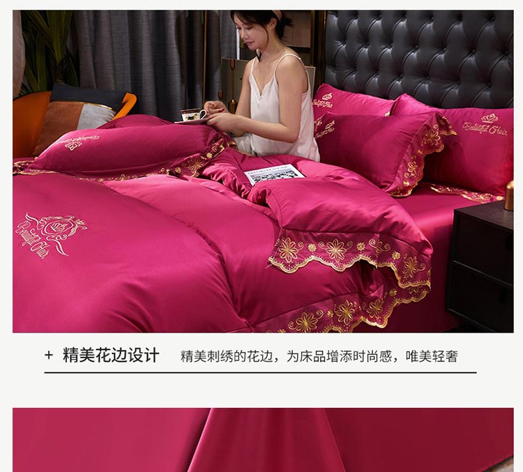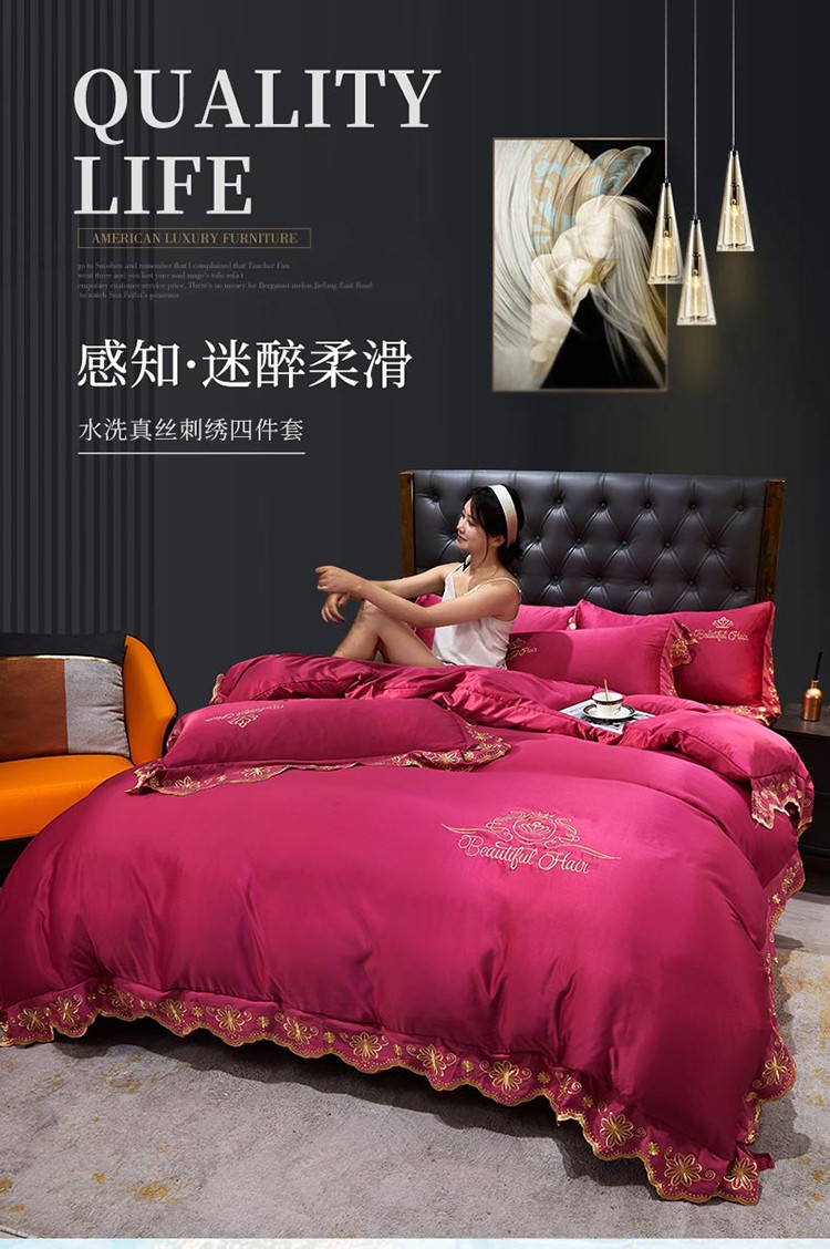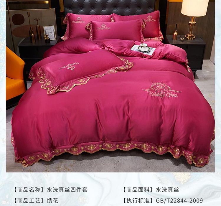 商品名称:铠畅 新款纳威轻奢绣花水洗真丝四件套春夏蕾丝刺绣床单款天丝四件套 枣红