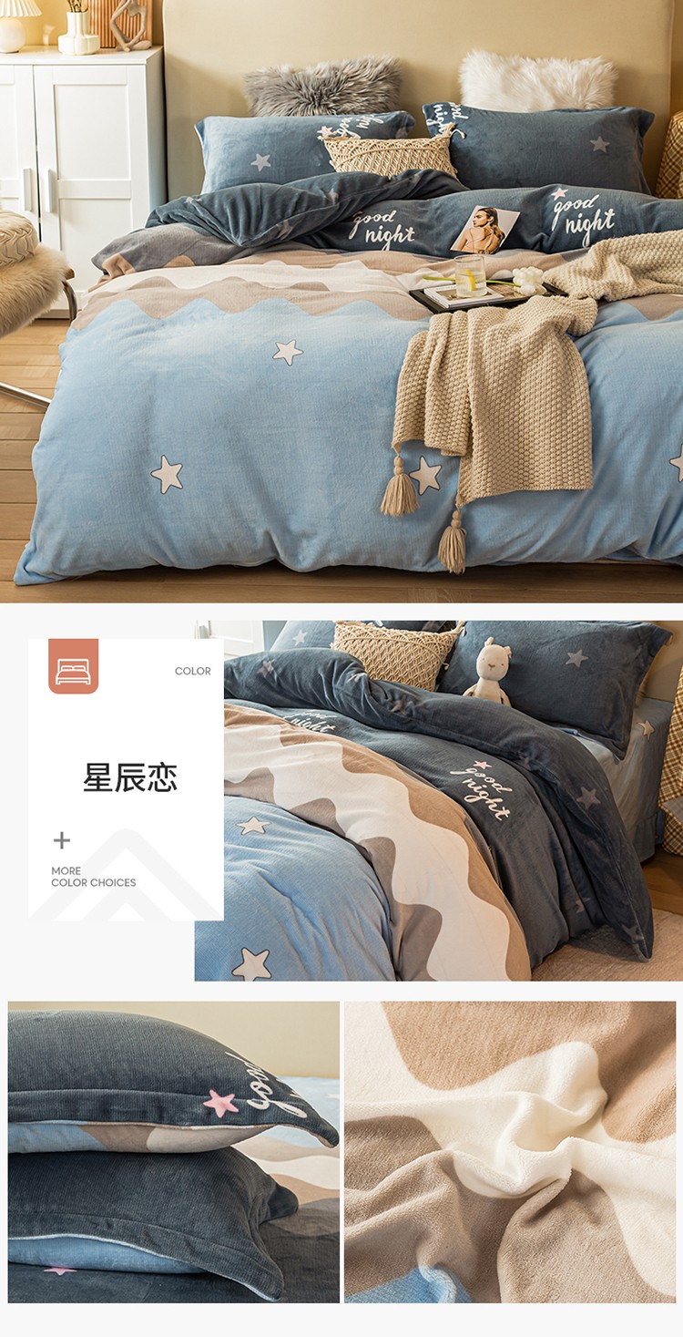 (总)凡客家居 2024新款高克重牛奶绒绣花拼角四件套,海洋蓝,奶油咖,深卡其,樱花粉
