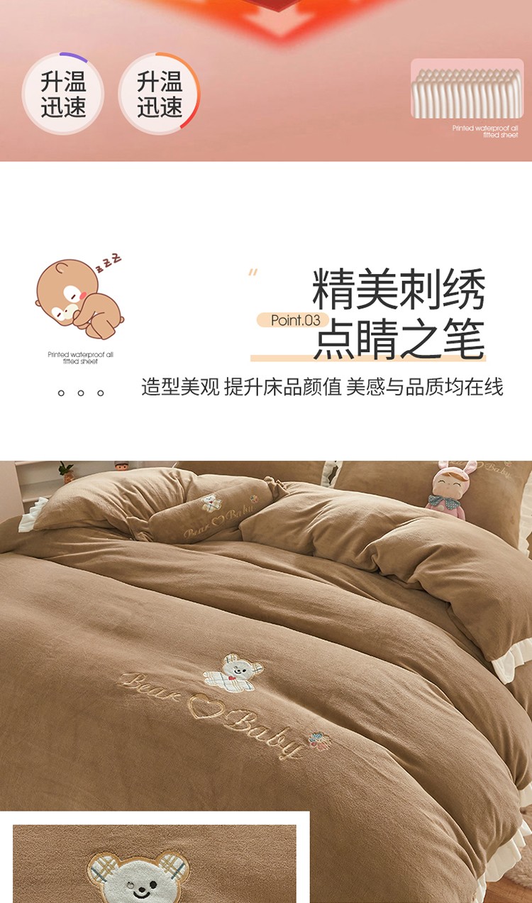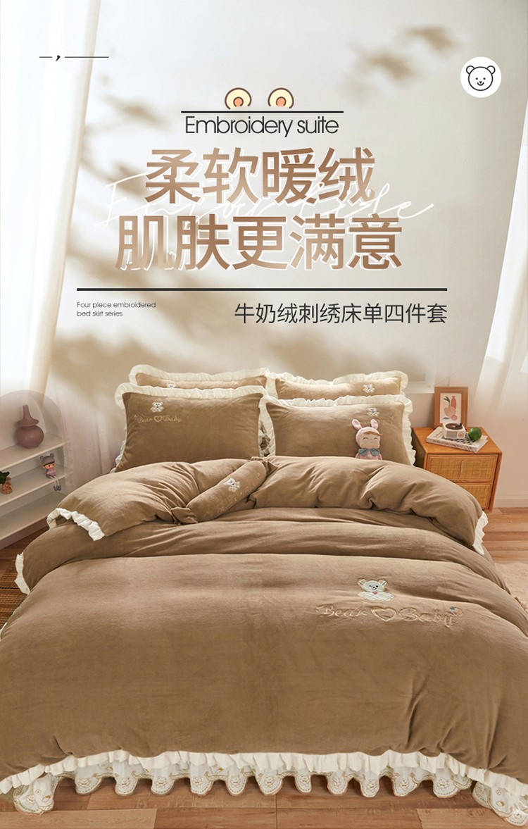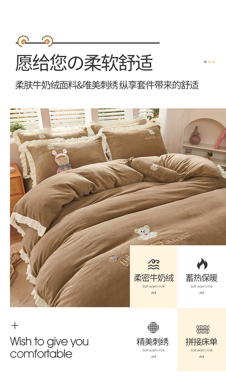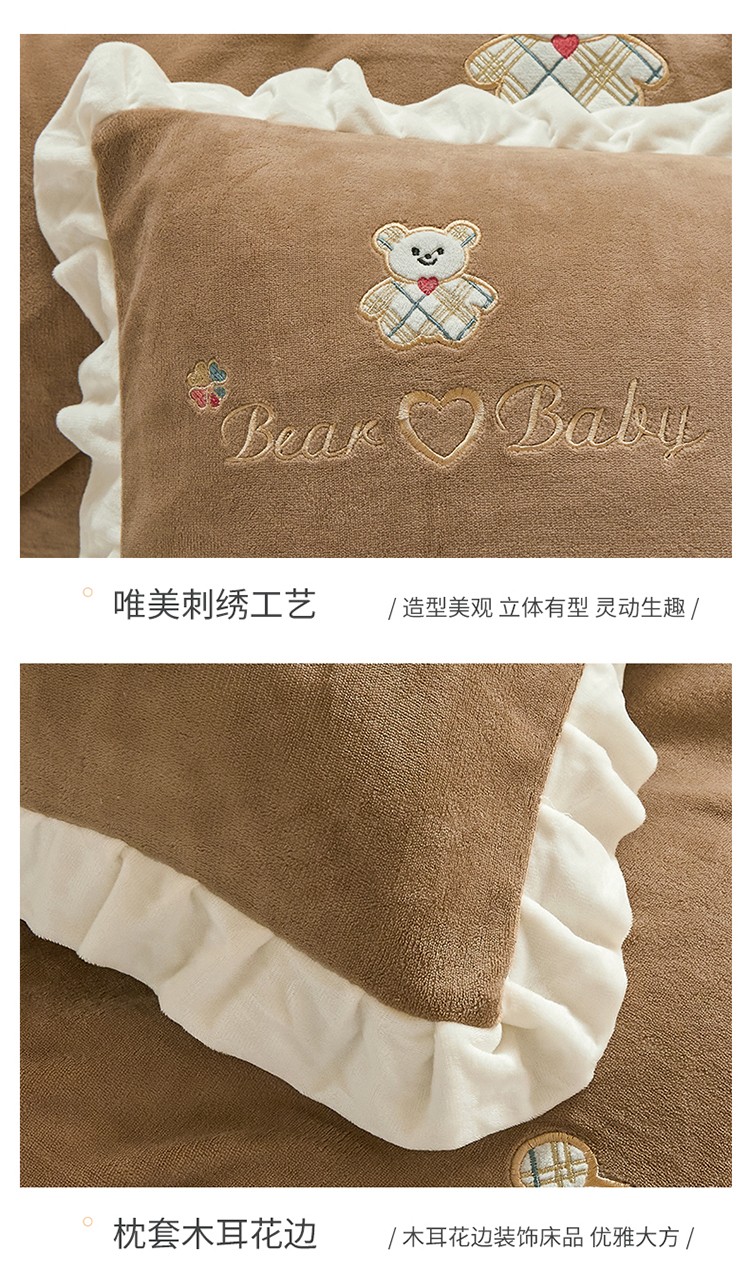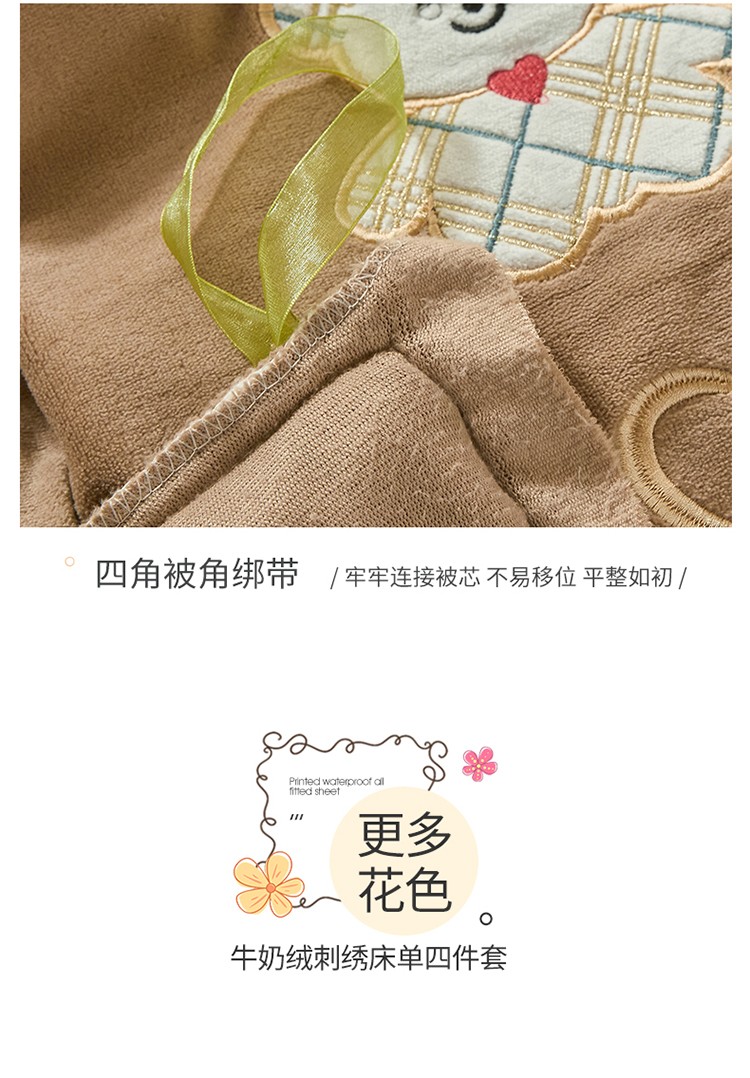 商品名称:宜凡家纺 2021新款牛奶绒绣花熊床单四件套 可爱熊-咖啡