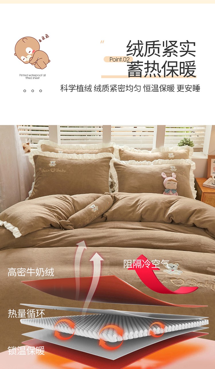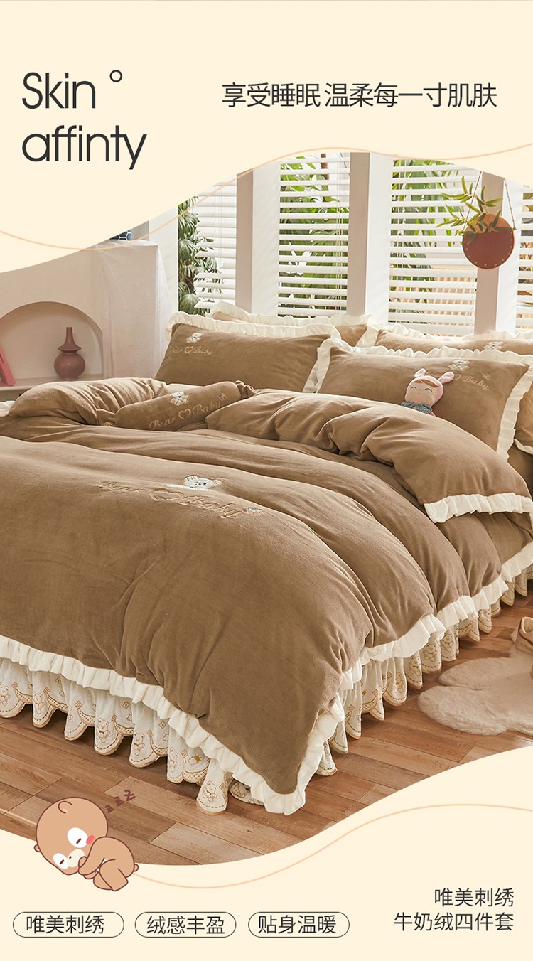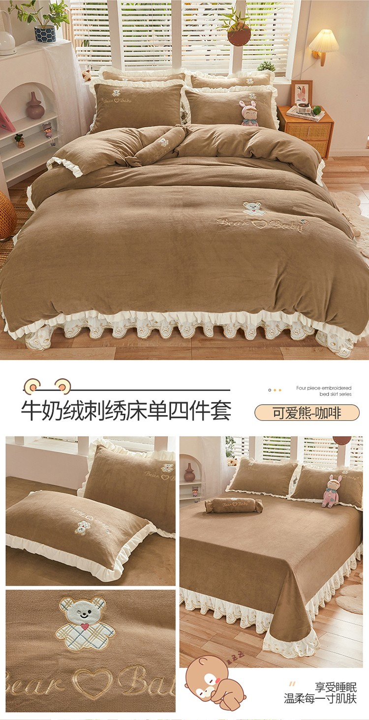 宜凡家纺 2021新款牛奶绒绣花熊床单四件套 可爱熊-咖啡