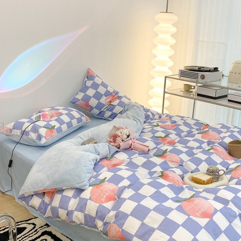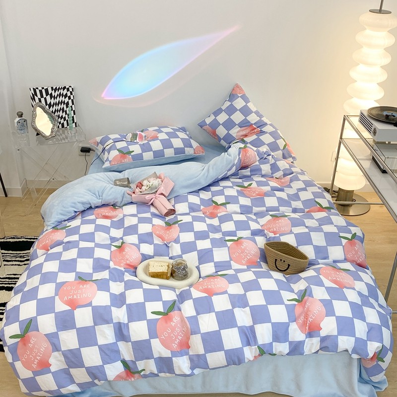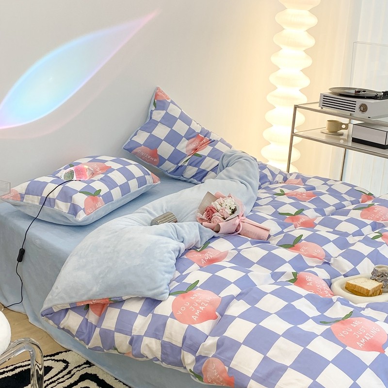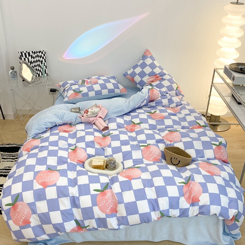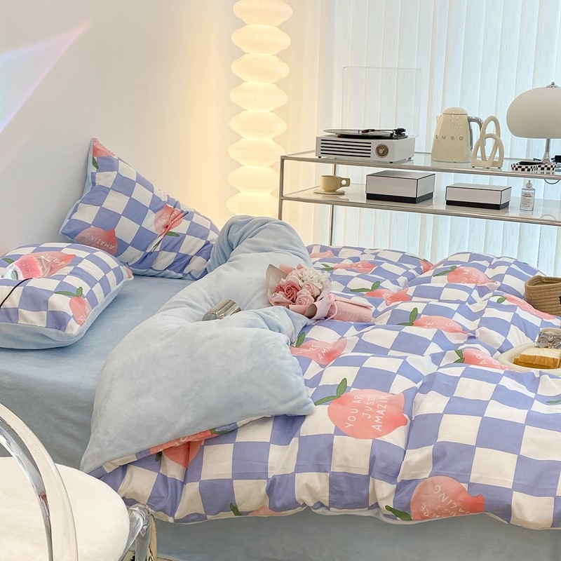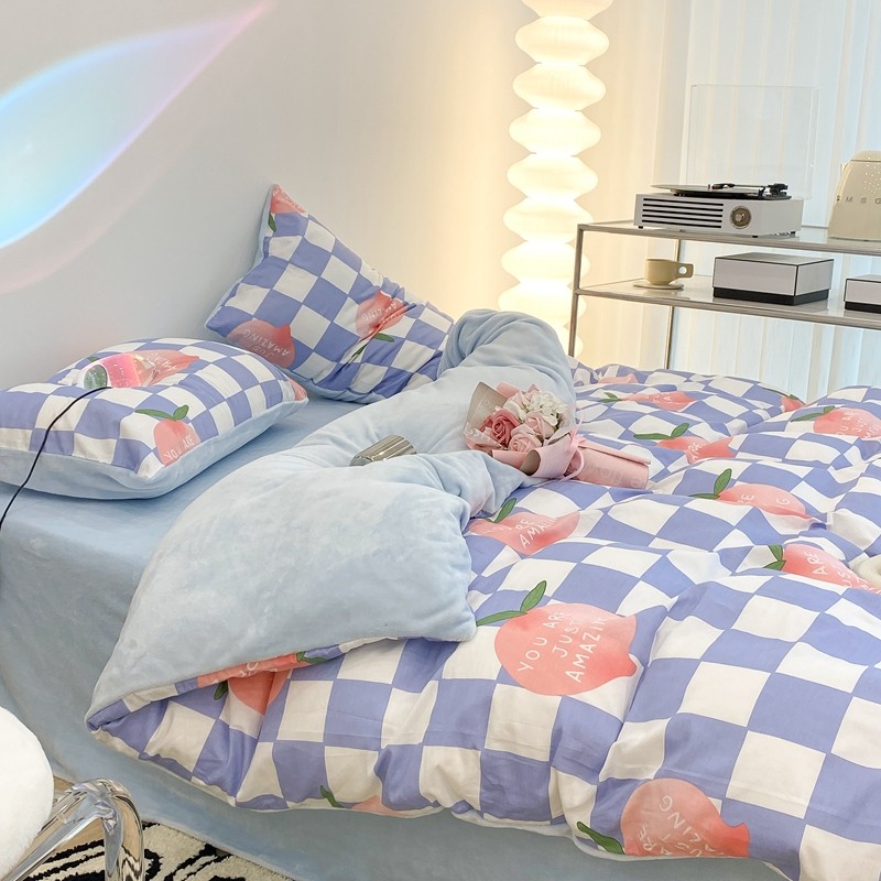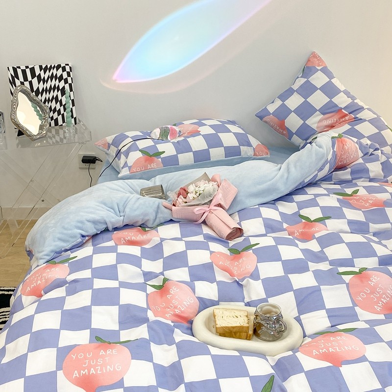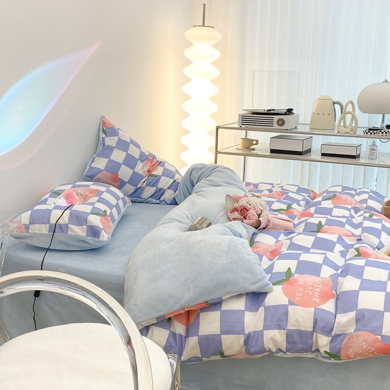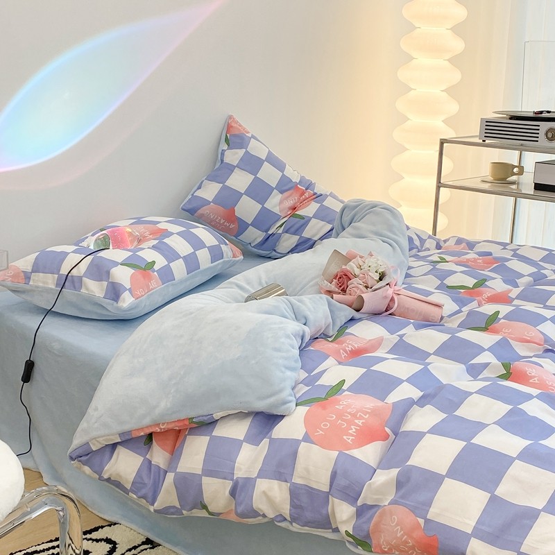 昔可家纺 2021新款棉加牛奶绒四件套 棋盘桃桃