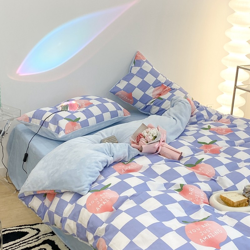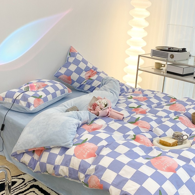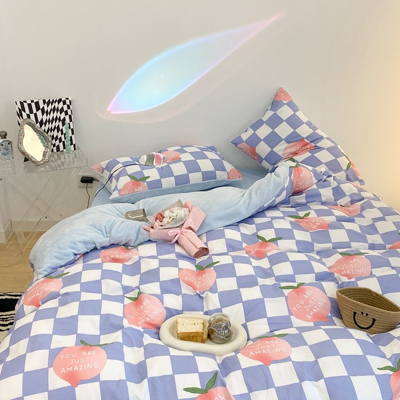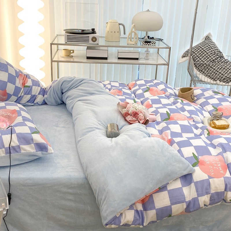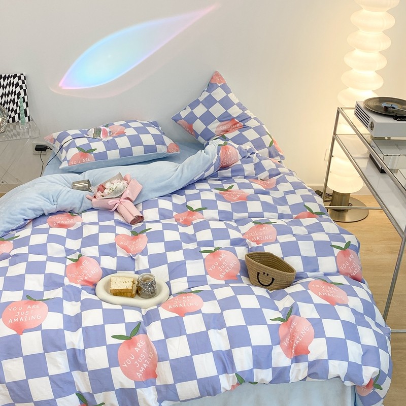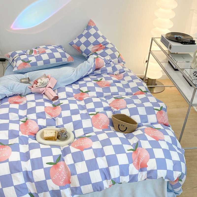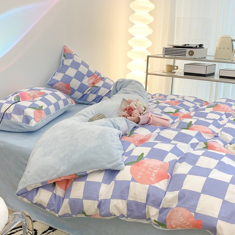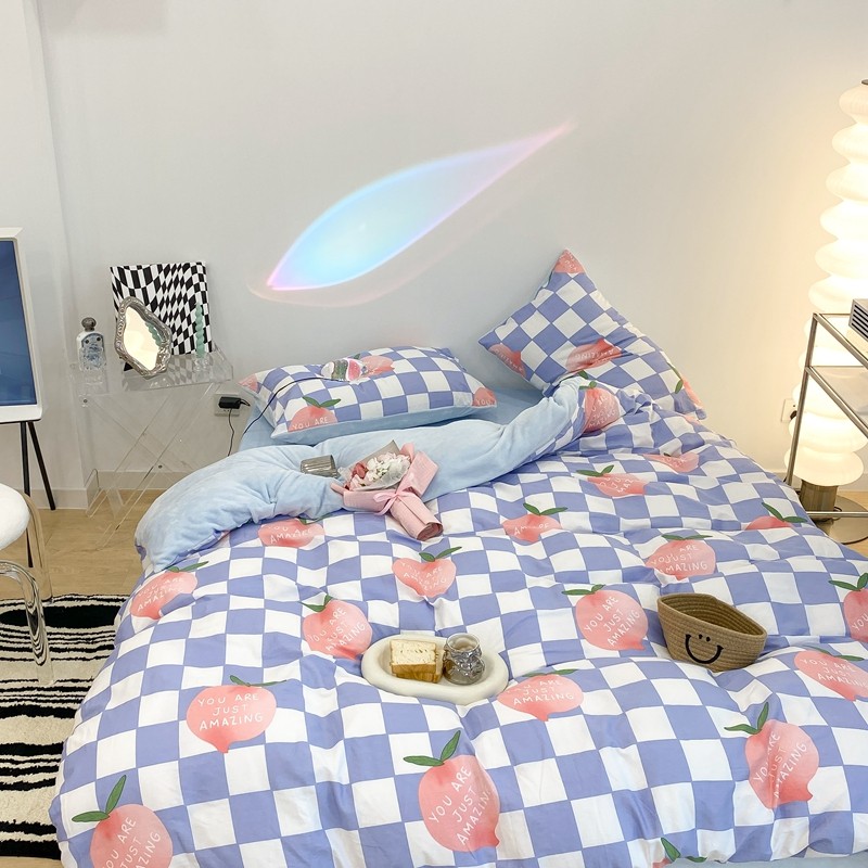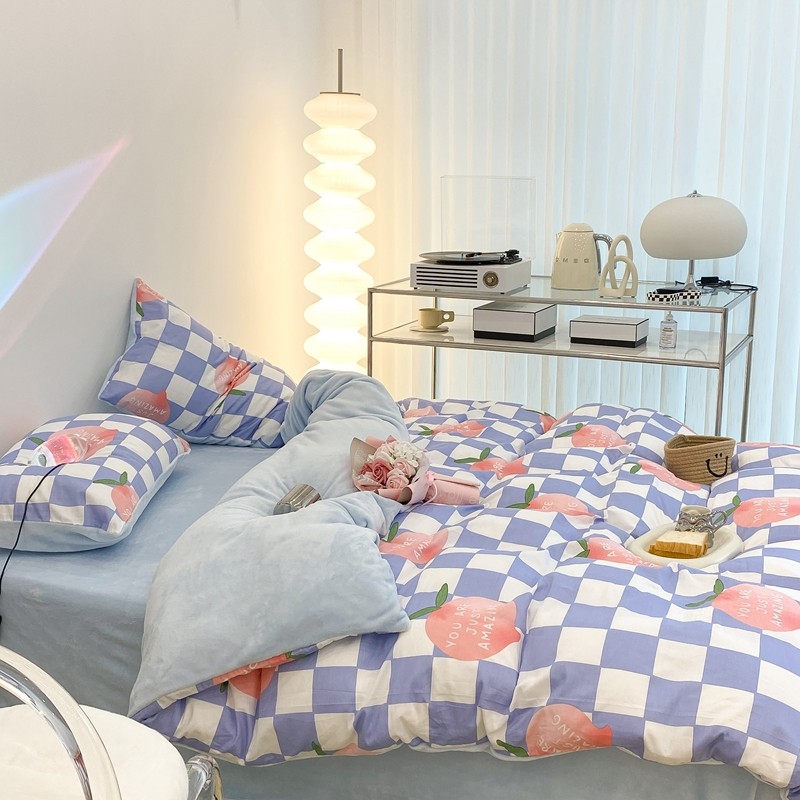 昔可家纺 2021新款棉加牛奶绒四件套 棋盘桃桃