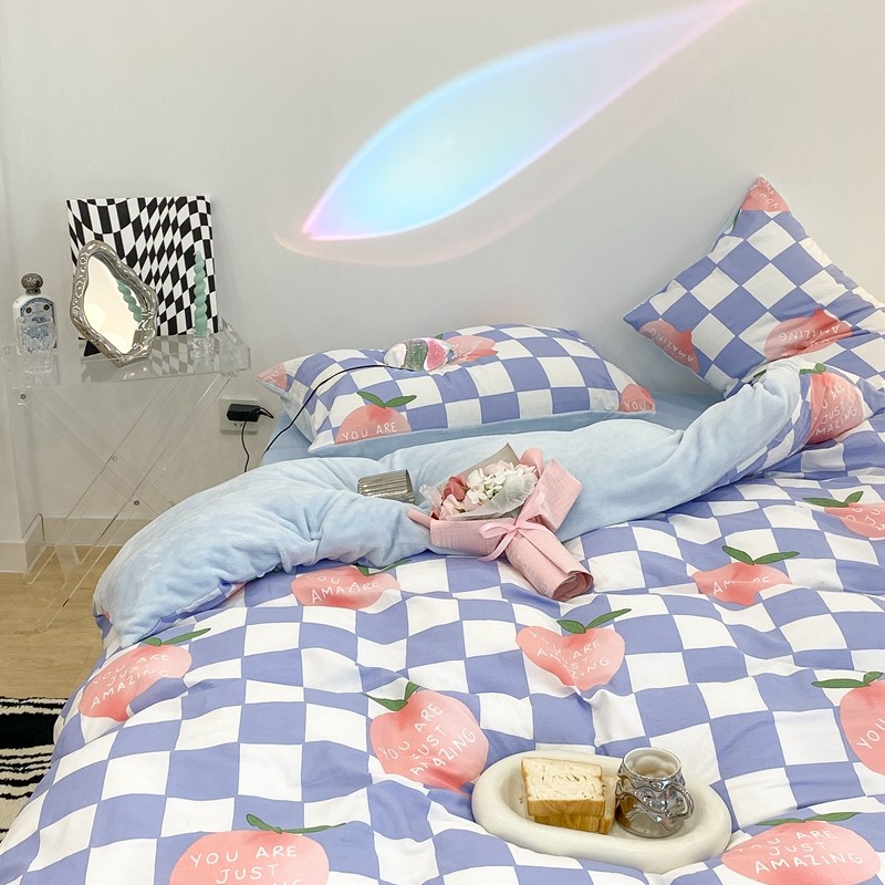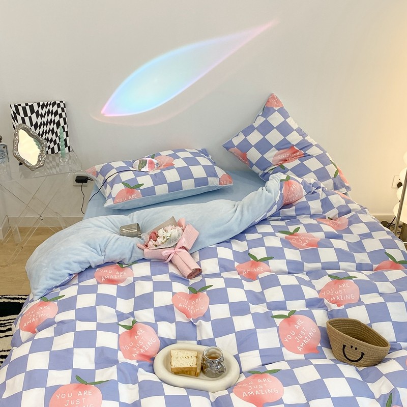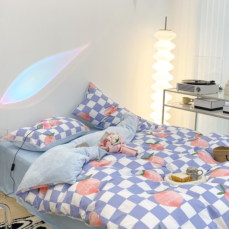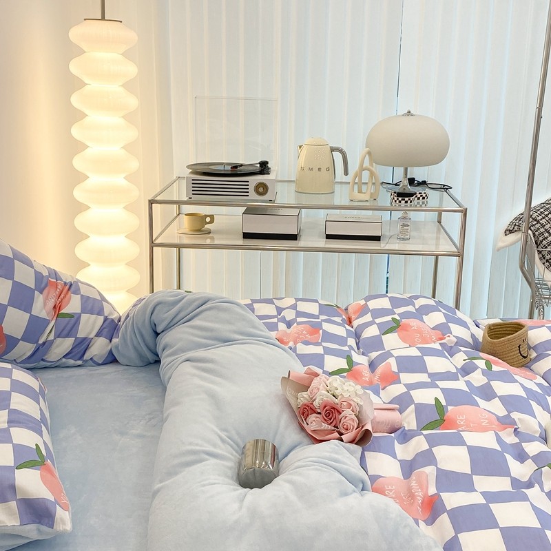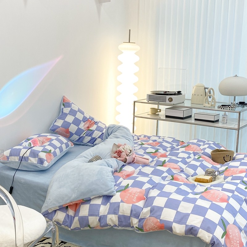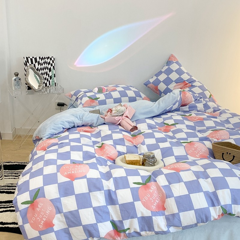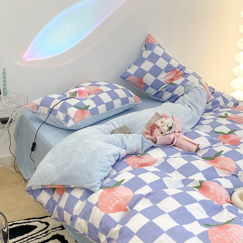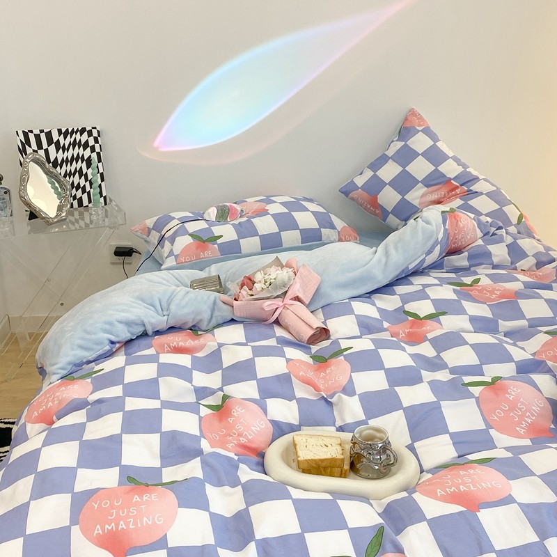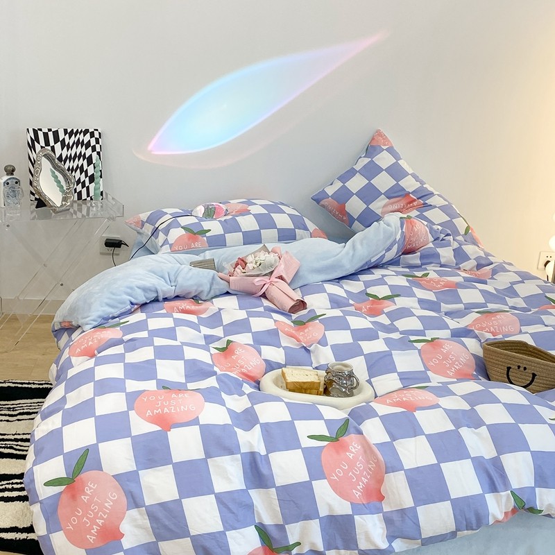 昔可家纺 2021新款棉加牛奶绒四件套 棋盘桃桃