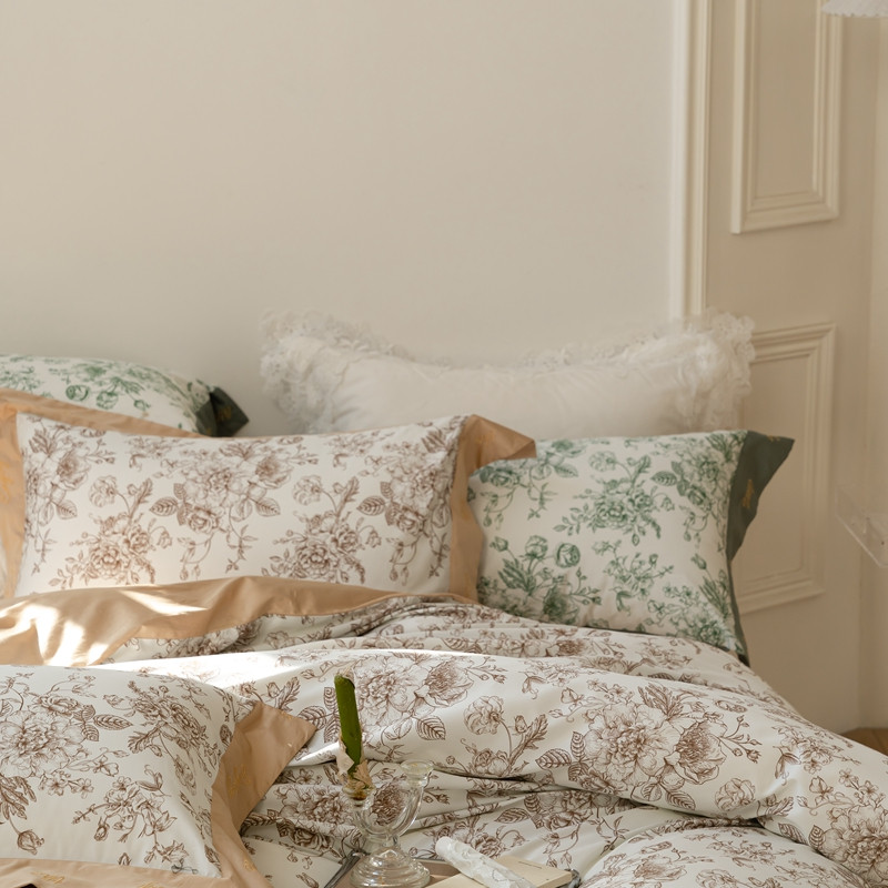 (总)优然居家纺 2025新款50支全棉纯棉印花法式双头木耳边四件套,觅棠,莫妮卡艾绿,莫妮卡罗兰,慕斯粉,薇薇安