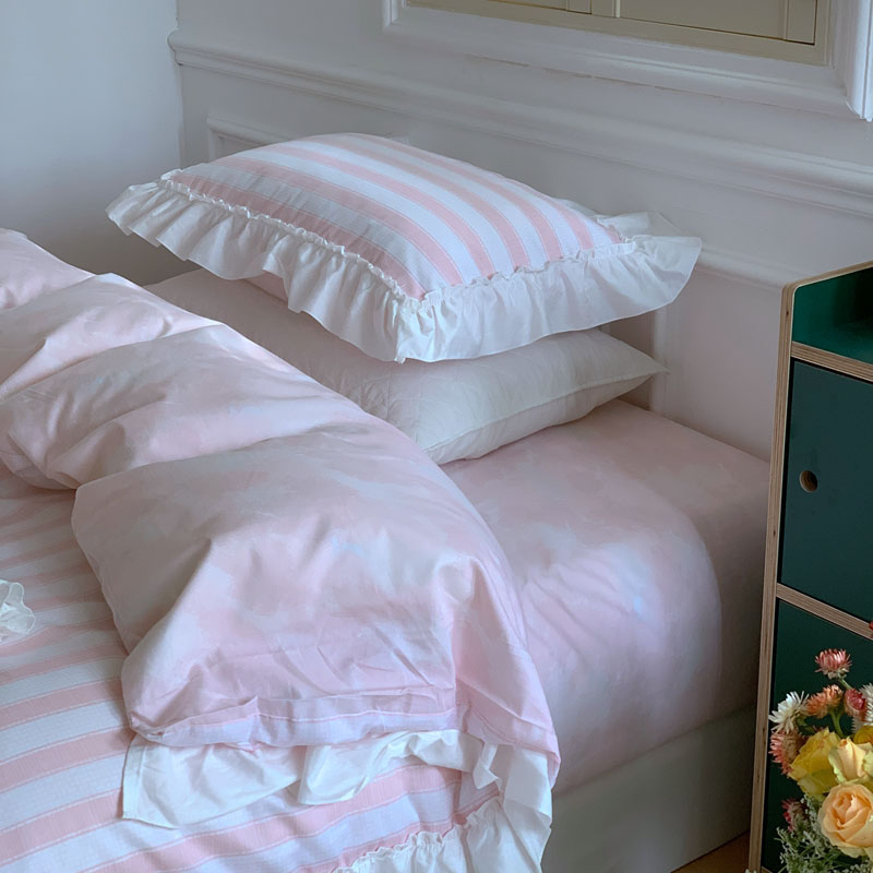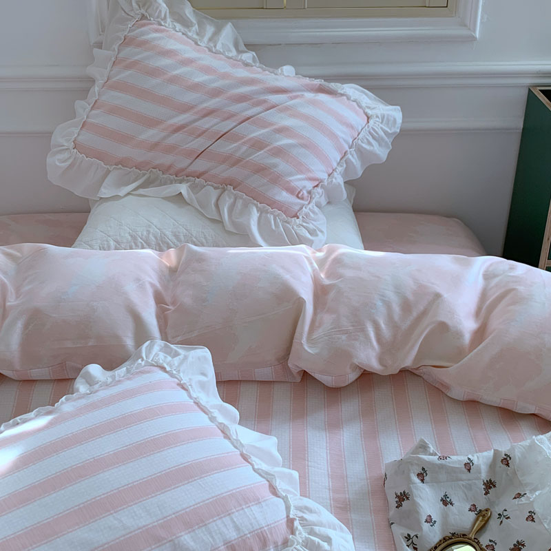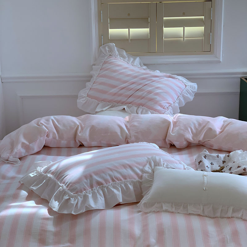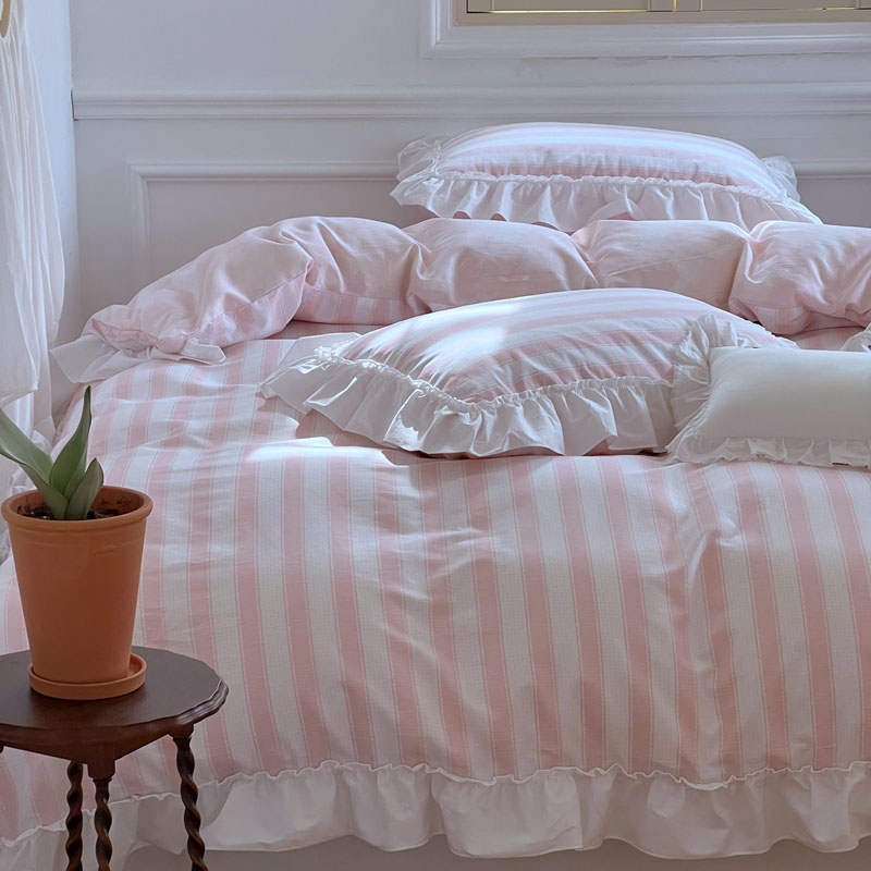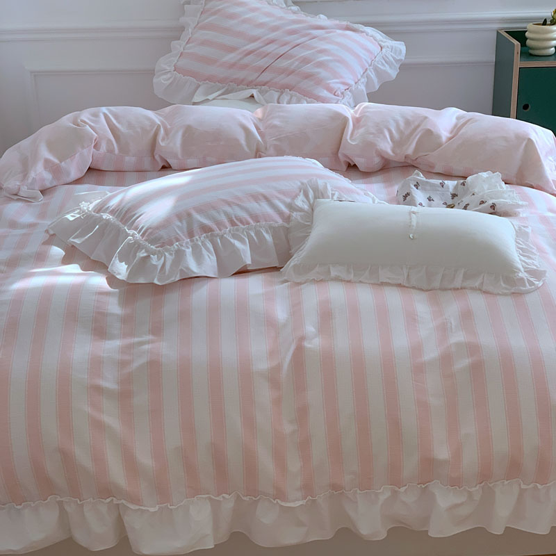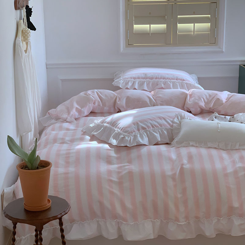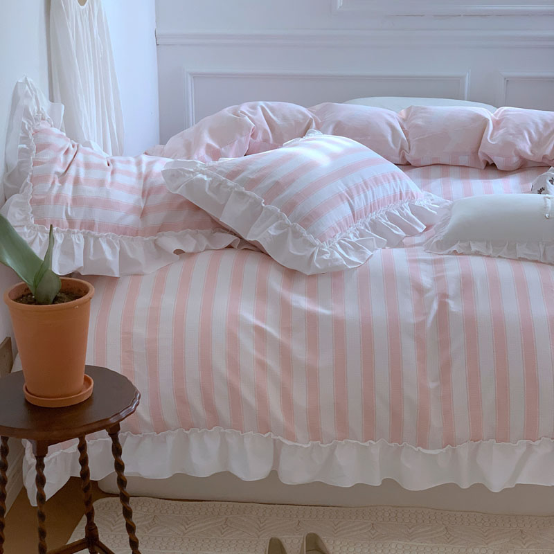 昔可2022新款花边条纹系列四件套 蔷薇粉条纹