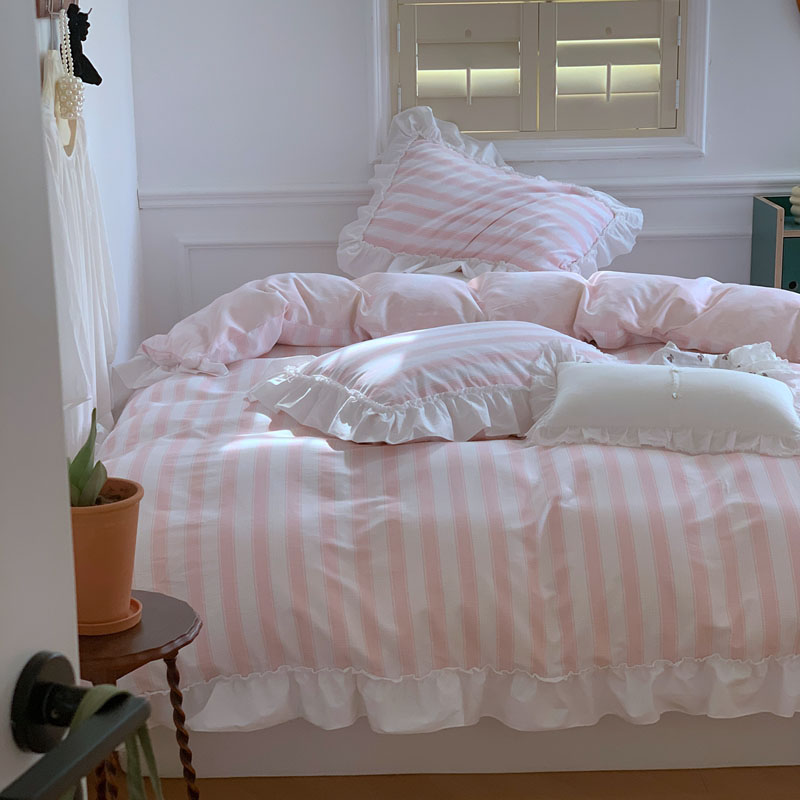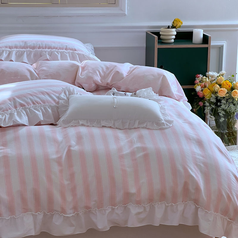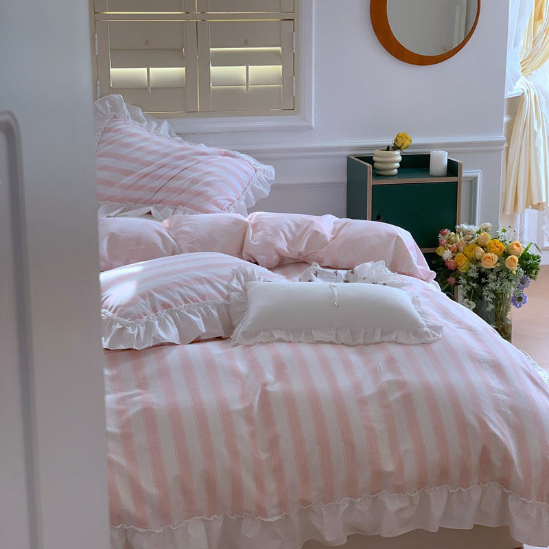 商品名称:昔可2022新款花边条纹系列四件套 蔷薇粉条纹