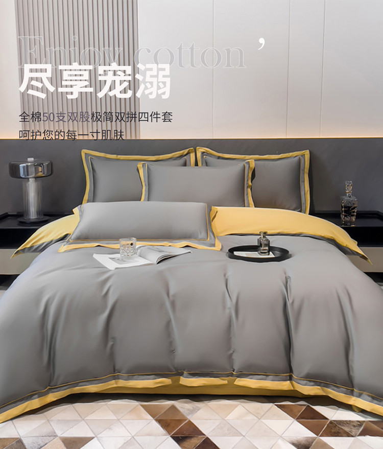 好阁 2023新款100支长绒棉双股全棉极简双拼四件套 灰黄