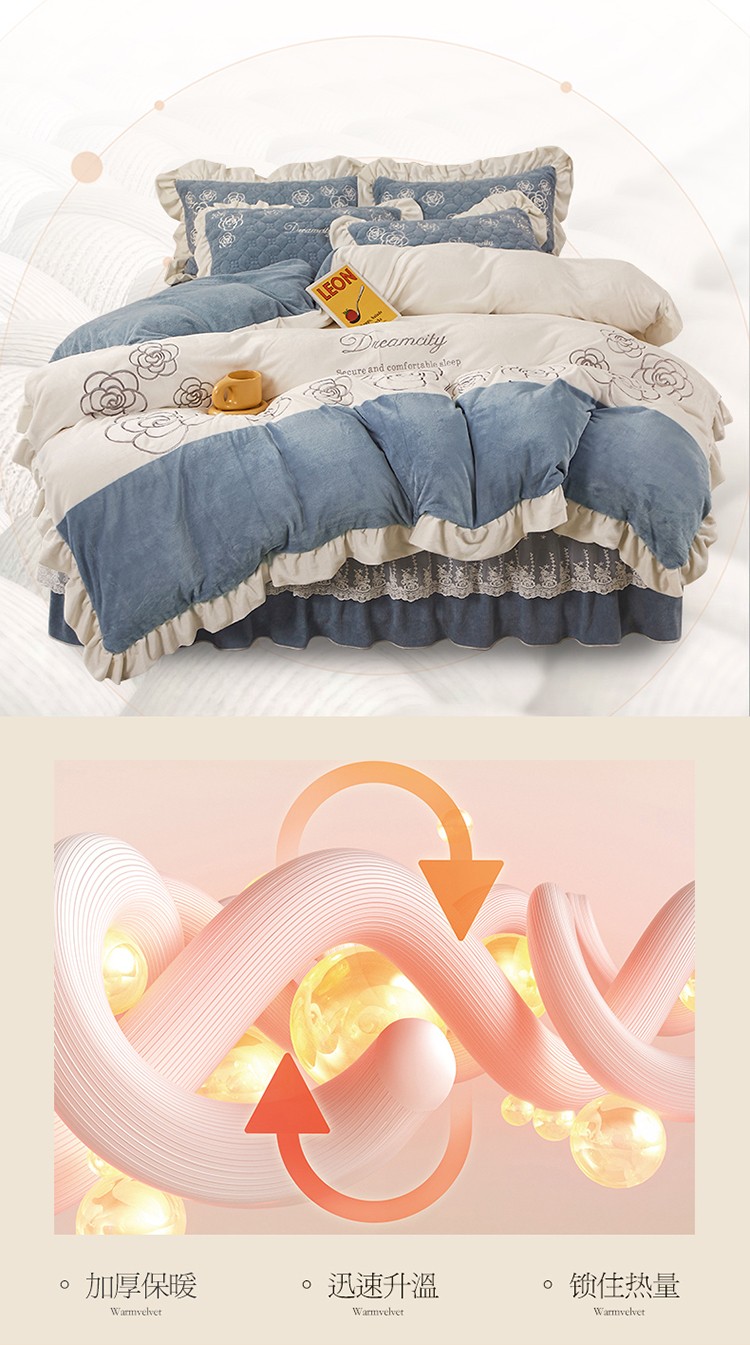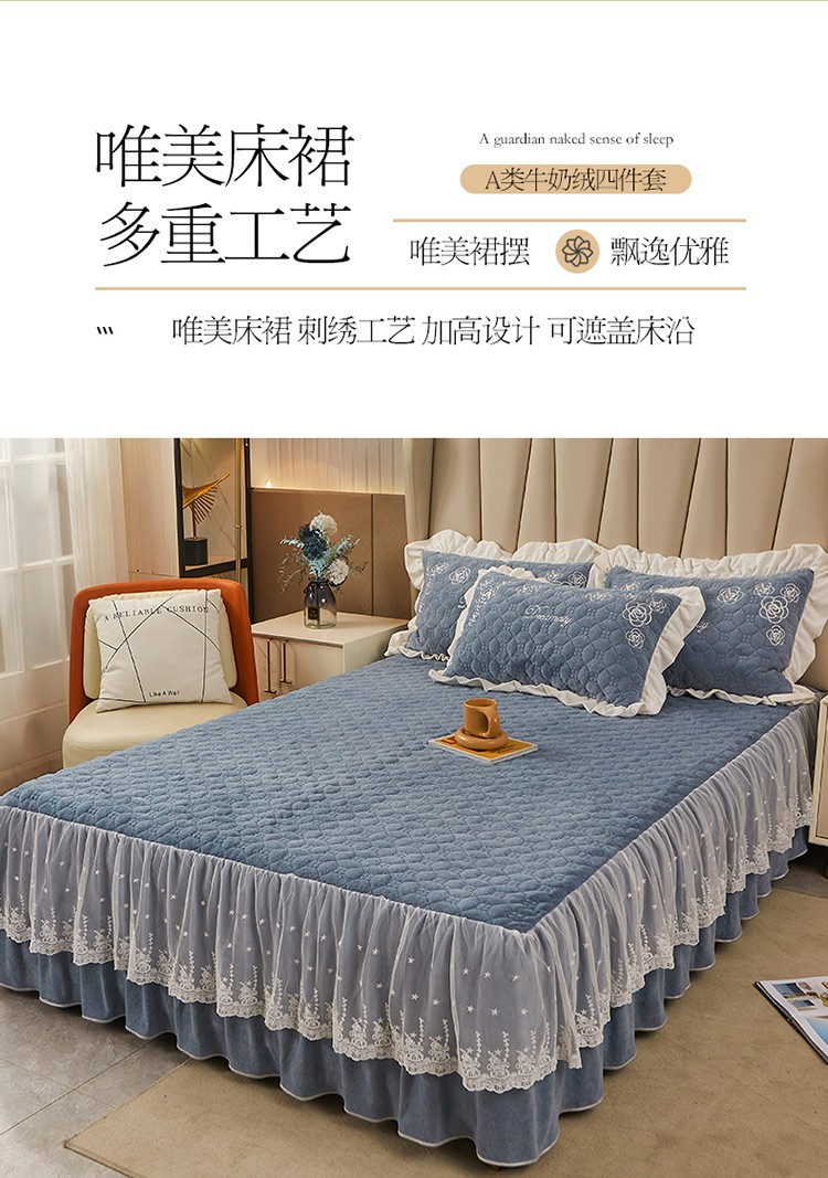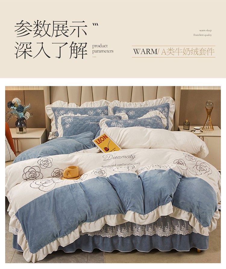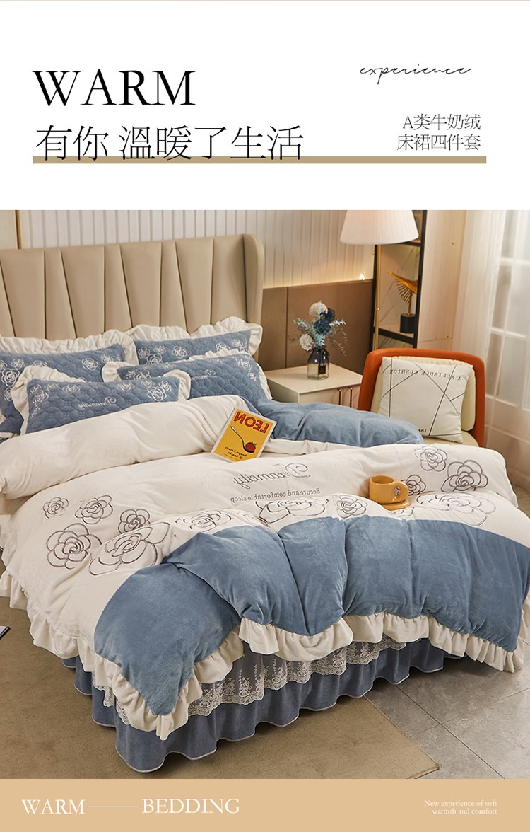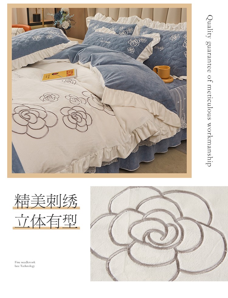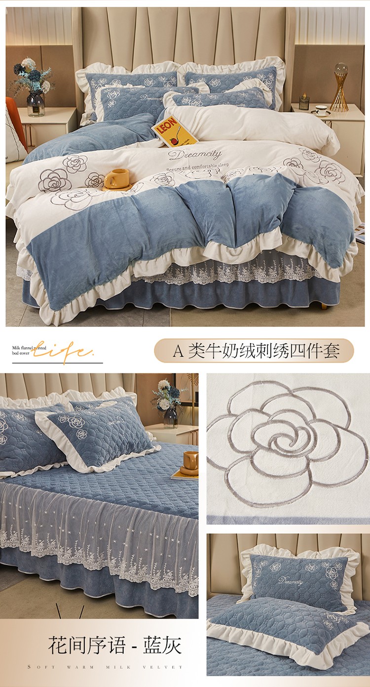 宜凡 2022新款A类牛奶绒绣花床裙三四件套 花间序语-蓝灰