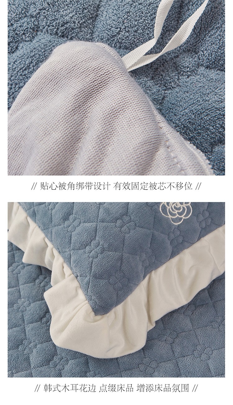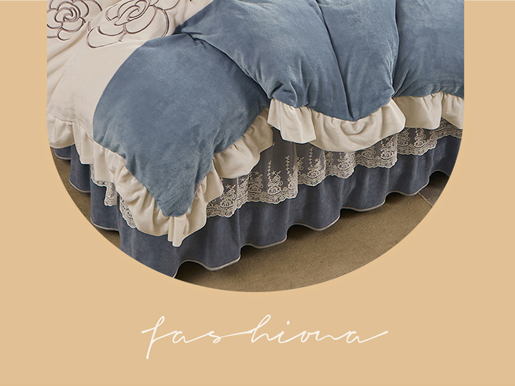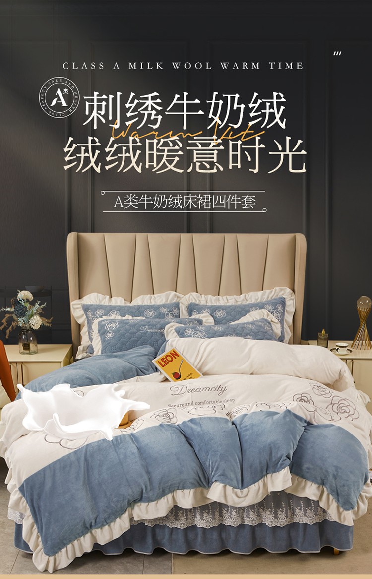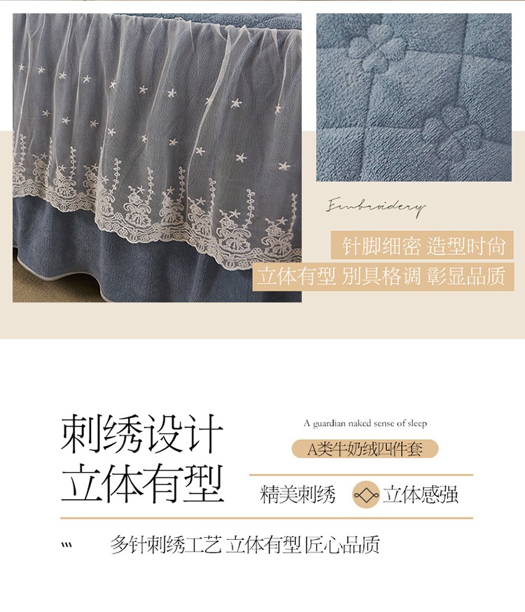 • 91家纺网 家纺一手货源 找家纺 宜凡 2022新款A类牛奶绒绣花床裙三四件套 花间序语-蓝灰