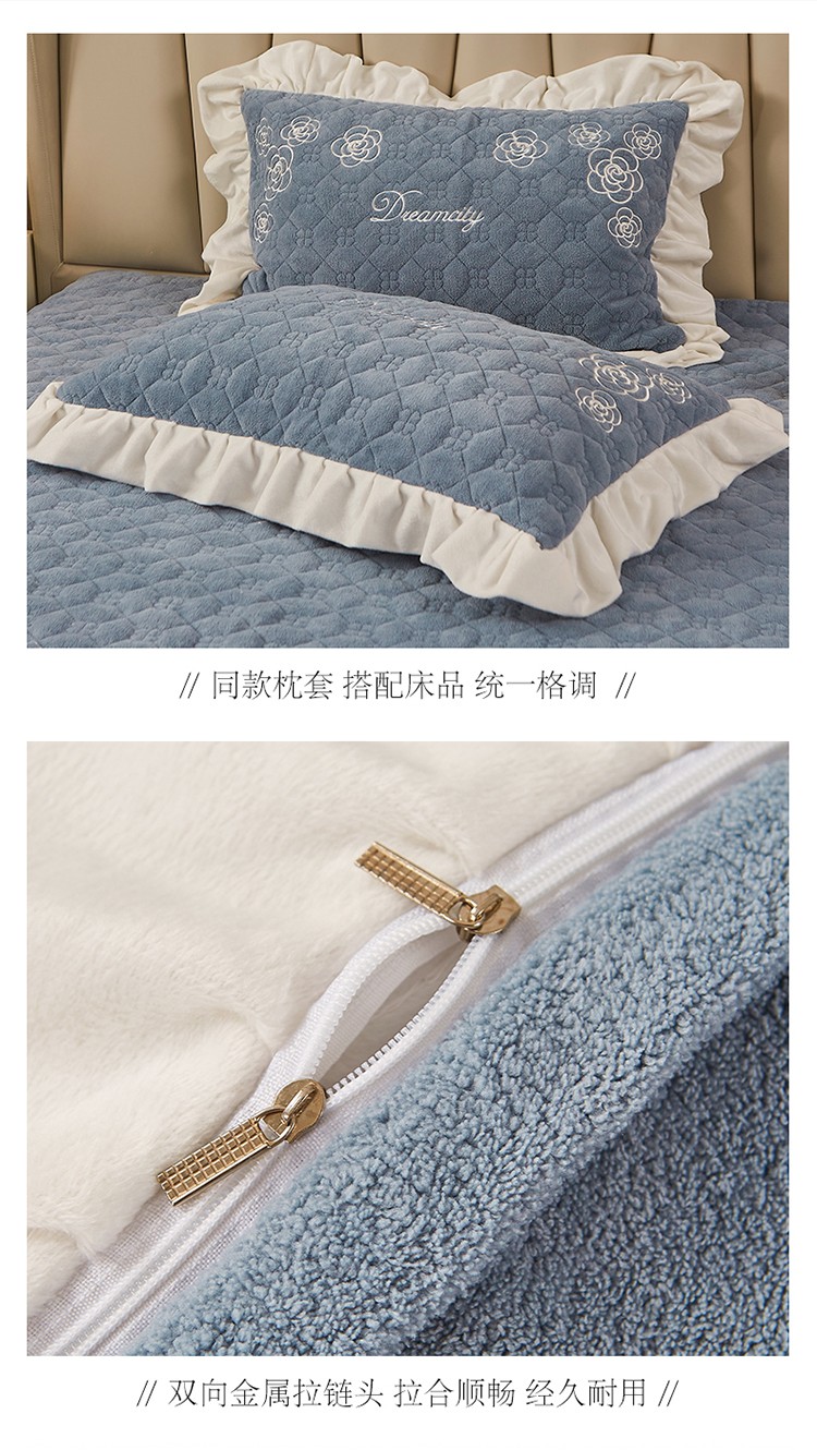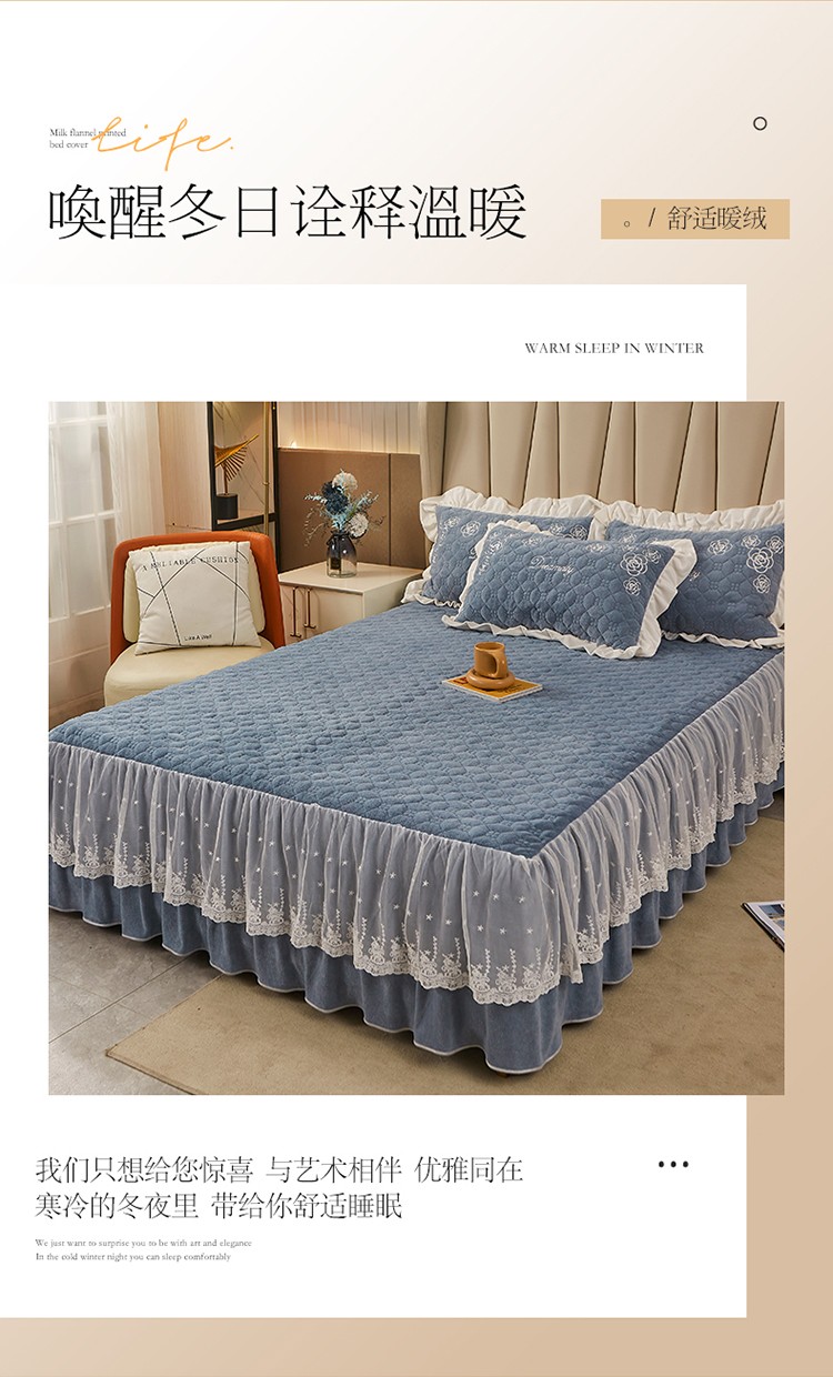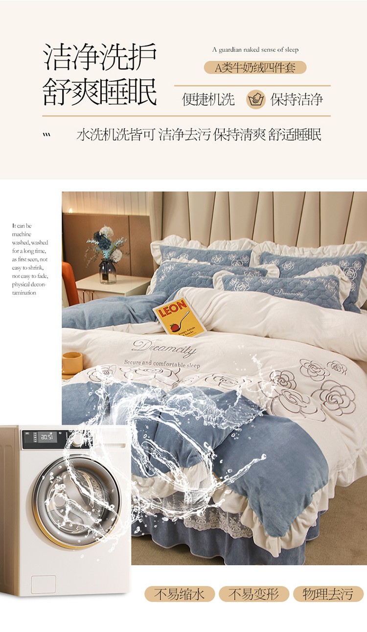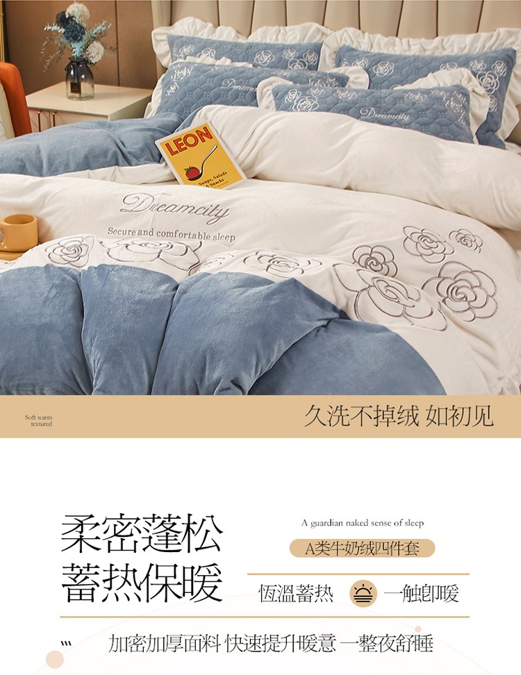 • 91家纺网 家纺一手货源 找家纺 宜凡 2022新款A类牛奶绒绣花床裙三四件套 花间序语-蓝灰