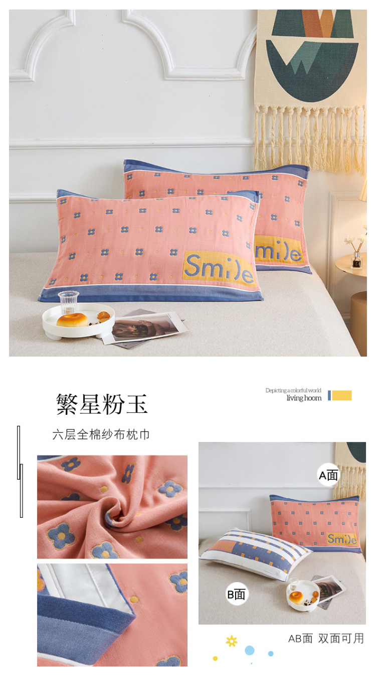 商品名称:棠薇 2023新款全棉6层纱布枕巾-简约系列 6层 繁星粉玉53*80cm/对