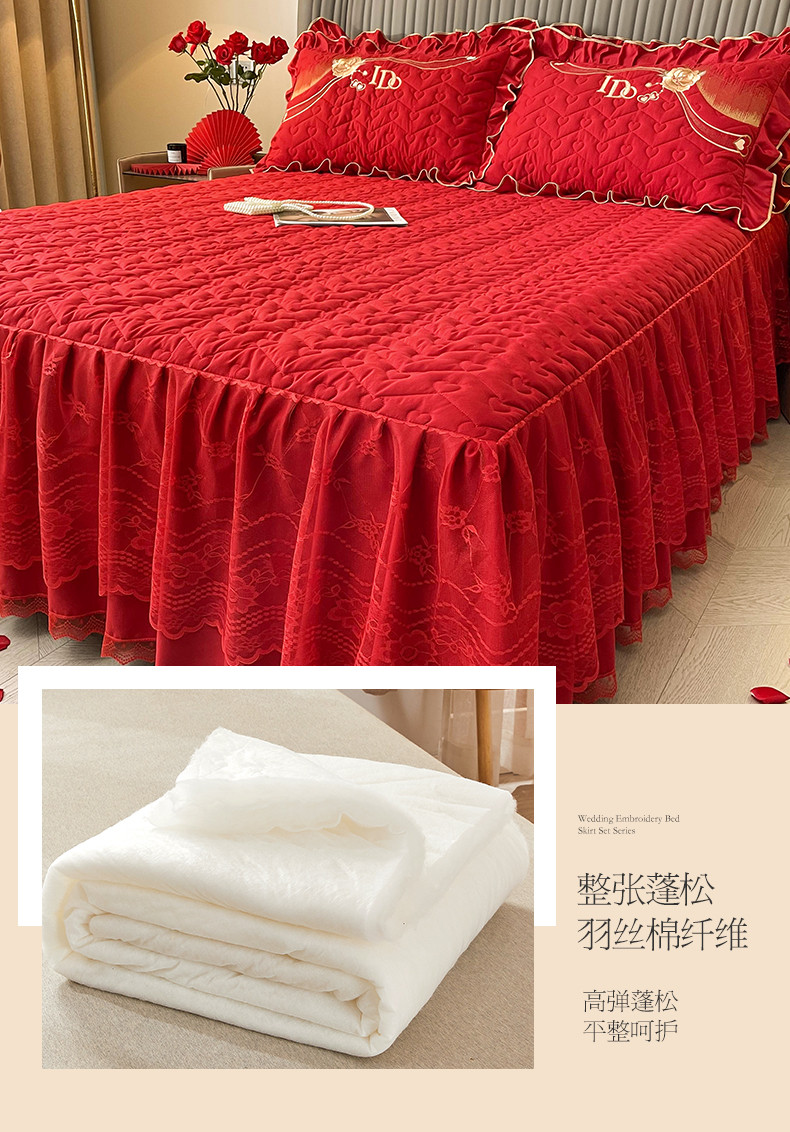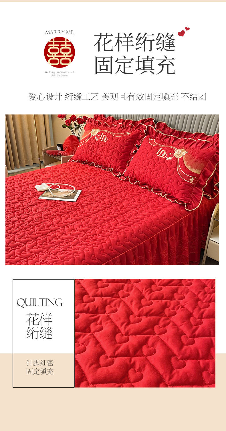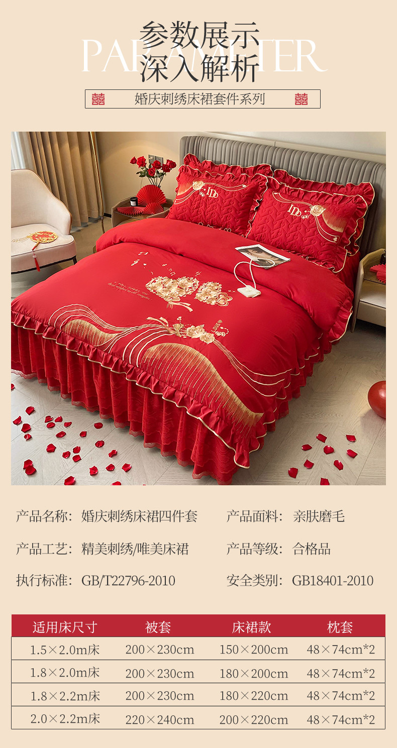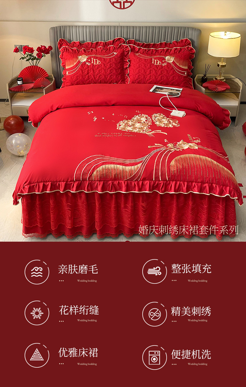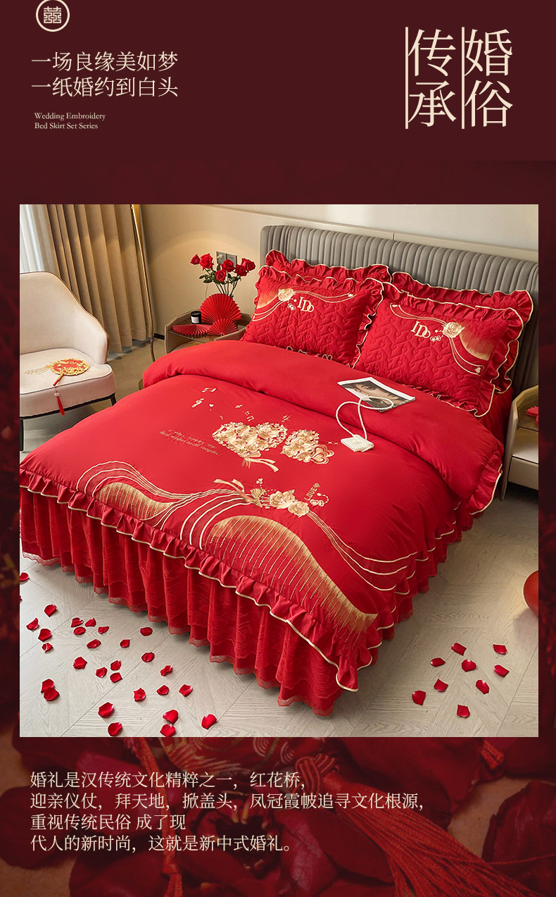 当前位置: 91家纺网 > 商品网购 > 床品套件 > 四件套 > 普通磨毛四件套 > 宜凡家纺 2023新款亲肤磨毛婚庆夹棉床裙四件套 心相印