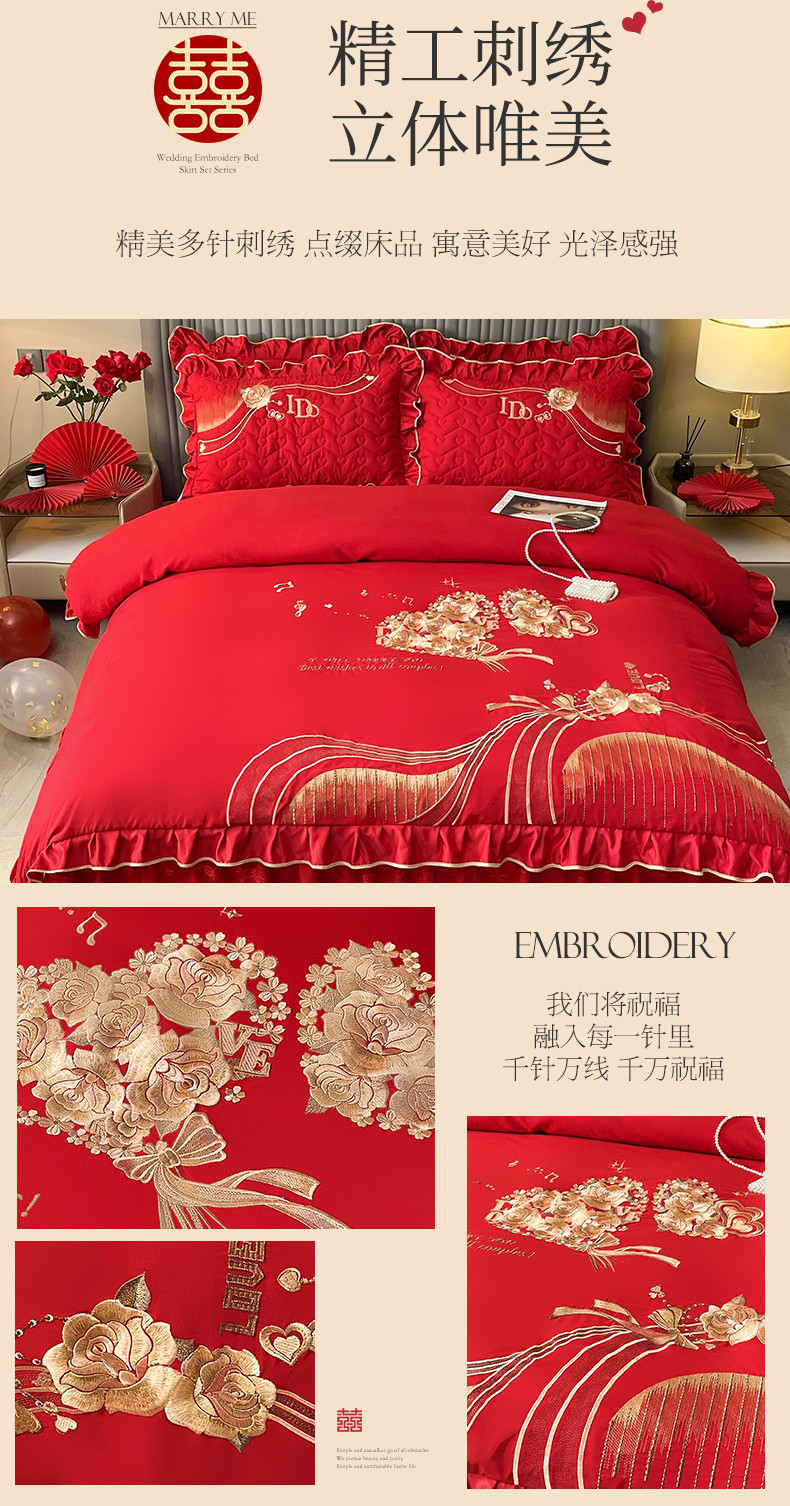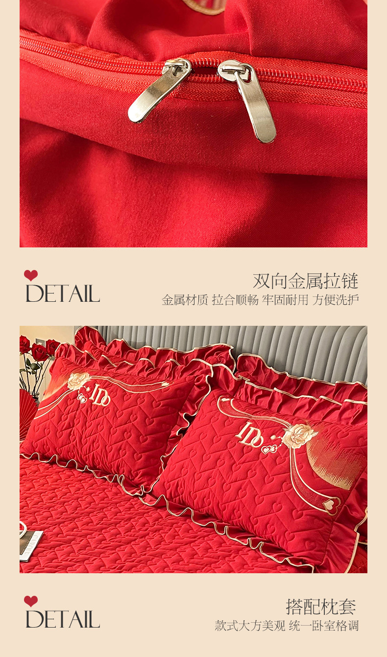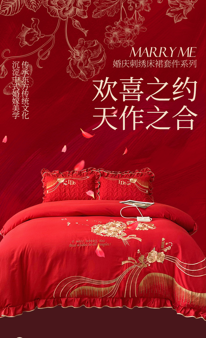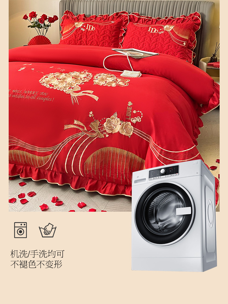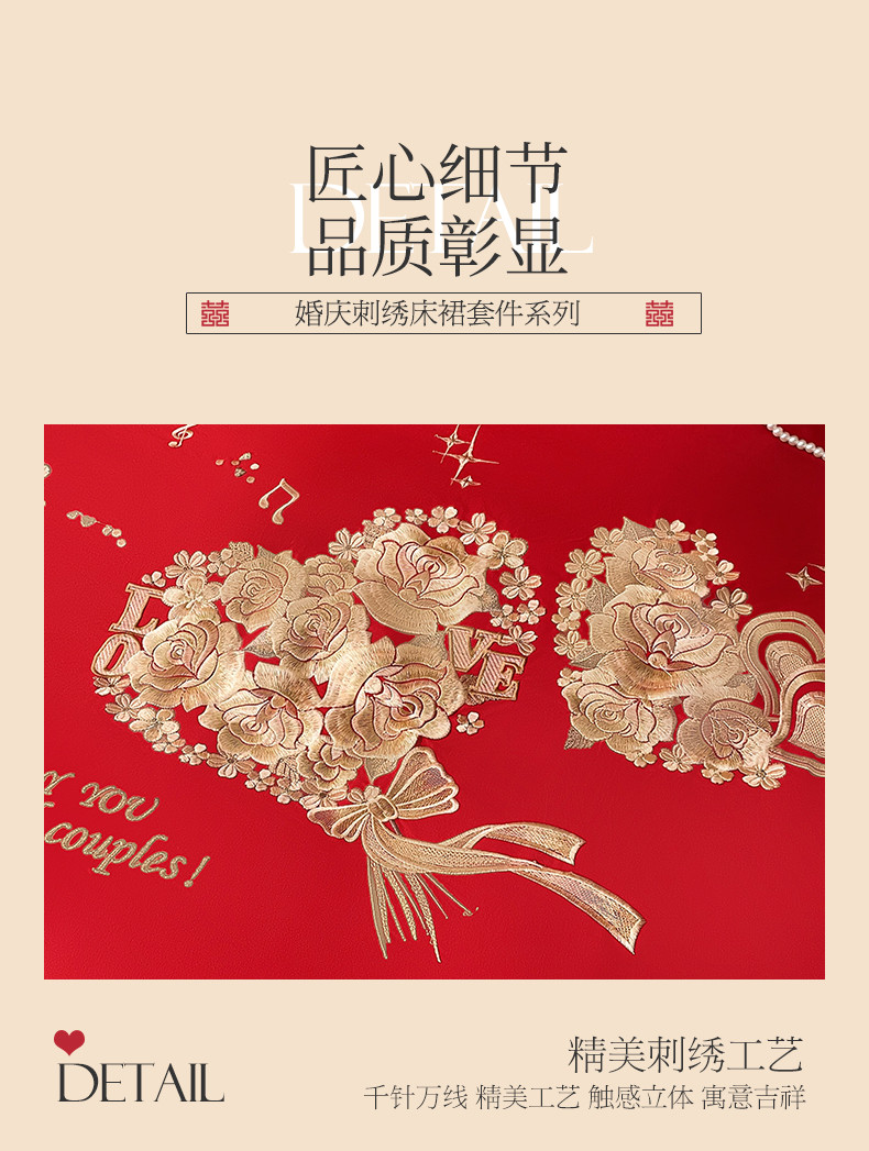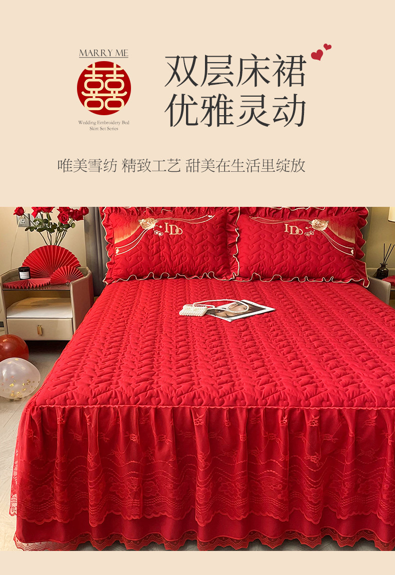 当前位置: 91家纺网 > 商品网购 > 床品套件 > 四件套 > 普通磨毛四件套 > 宜凡家纺 2023新款亲肤磨毛婚庆夹棉床裙四件套 心相印