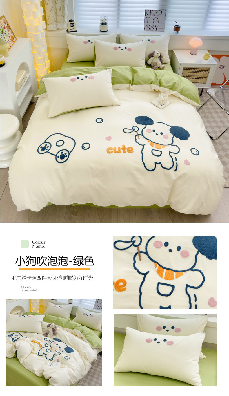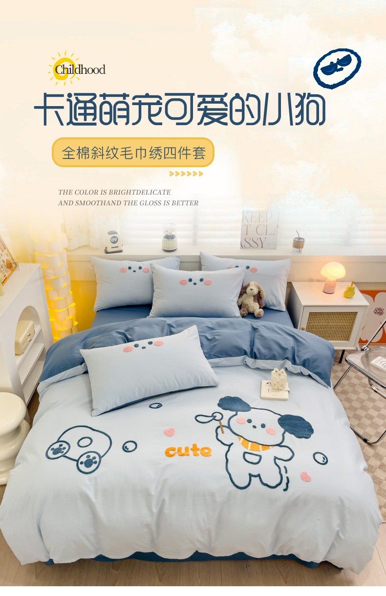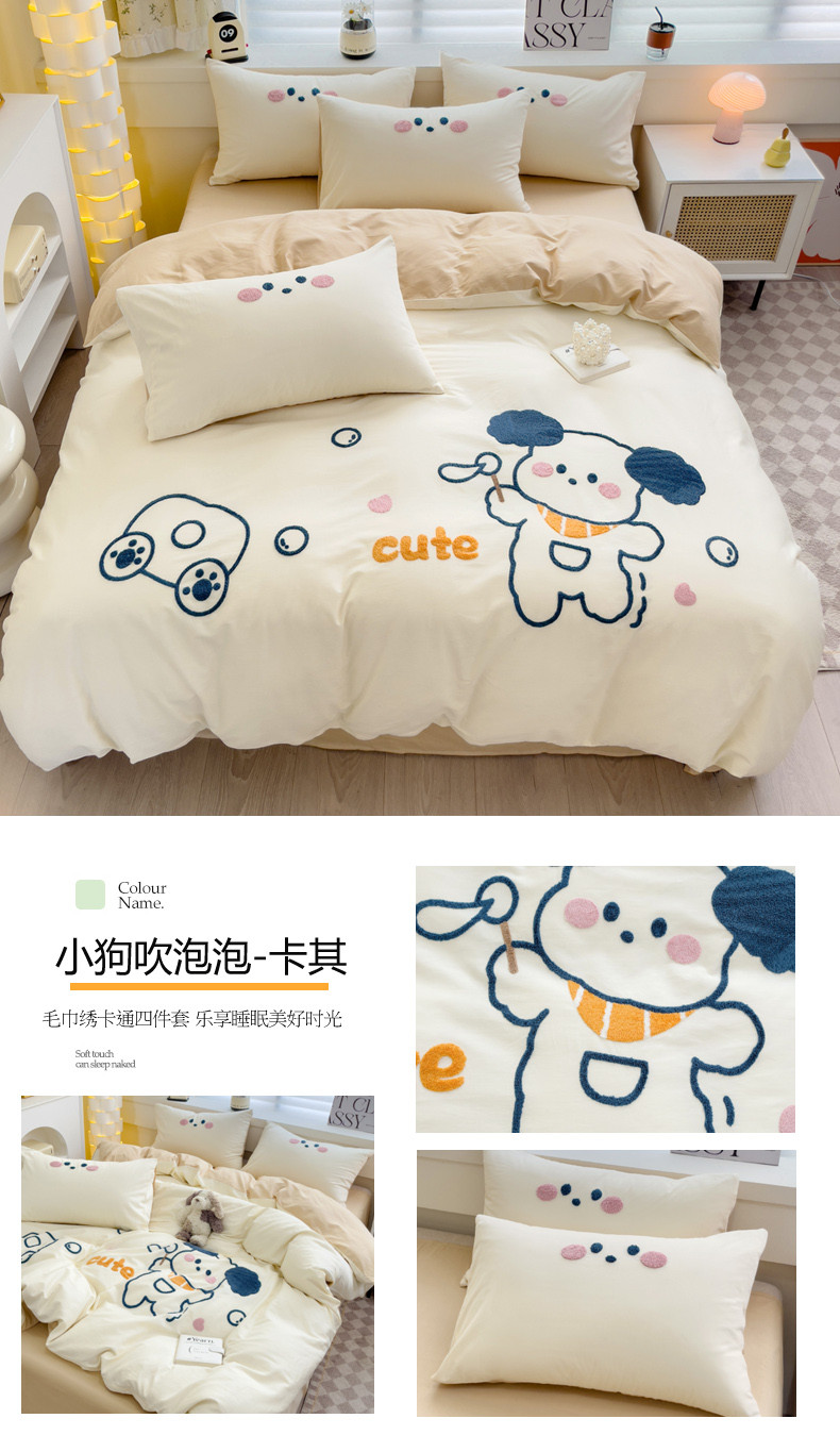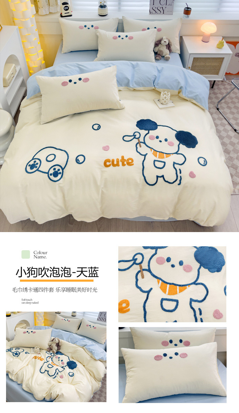 (总)丽涵家纺 2026新款50S全棉纯棉水洗棉毛巾绣花四件套幸运圣诞,动物乐园,可爱小狗-浅粉,小狗派对,幸运圣诞树,熊猫嘟嘟,可爱小狗-蓝