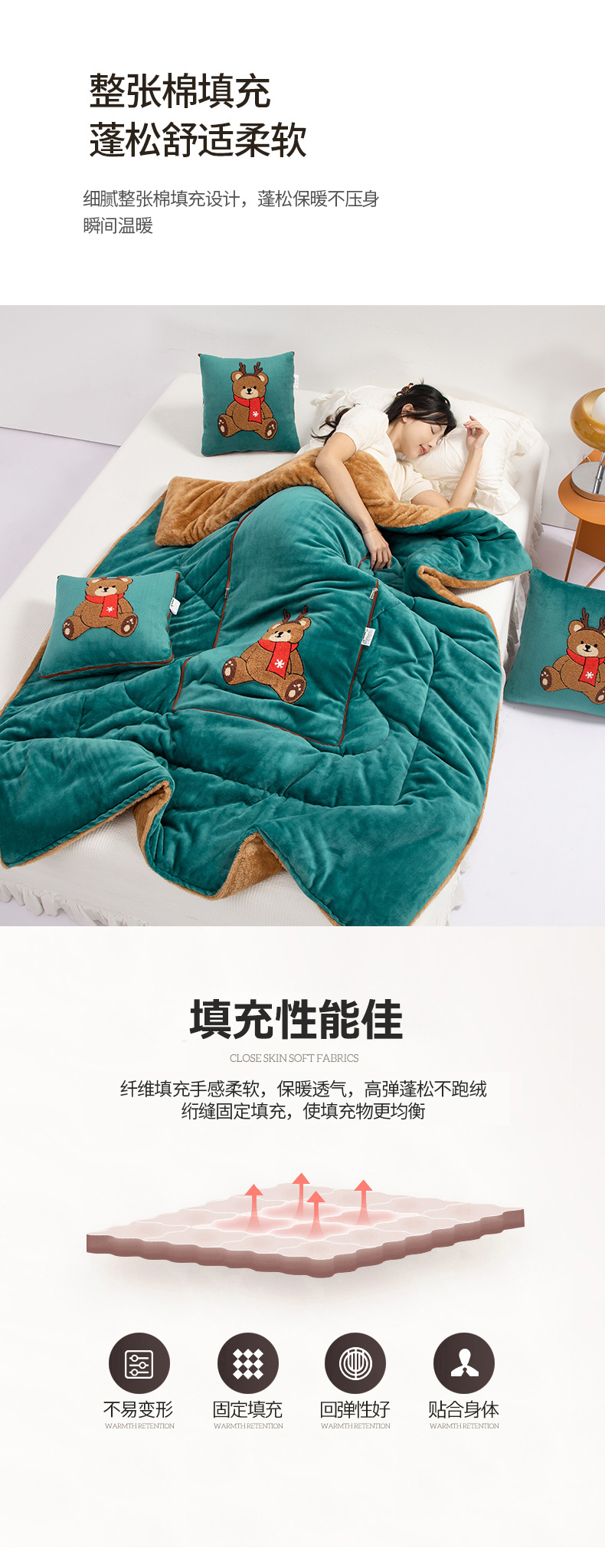 宝马家纺2023新款泰迪熊圣诞限量版毛巾绣抱枕被 水绿