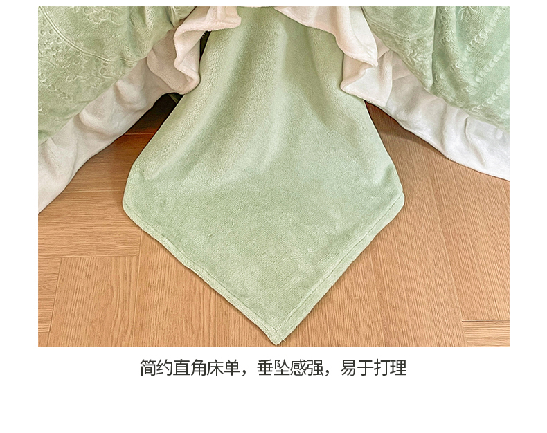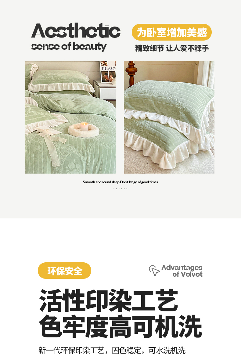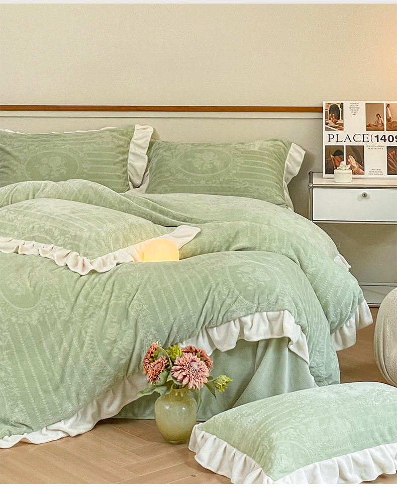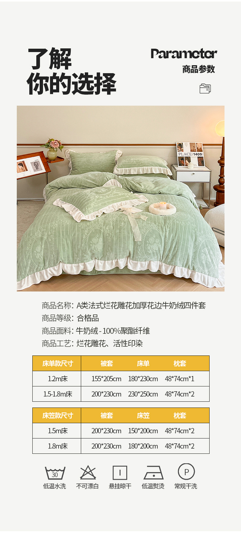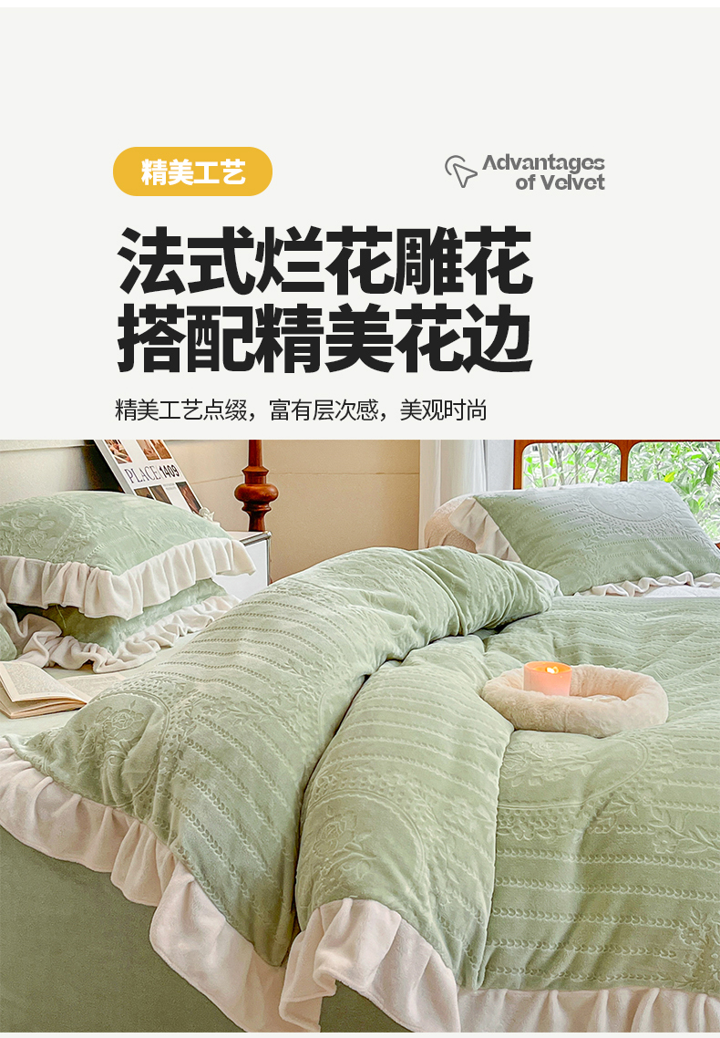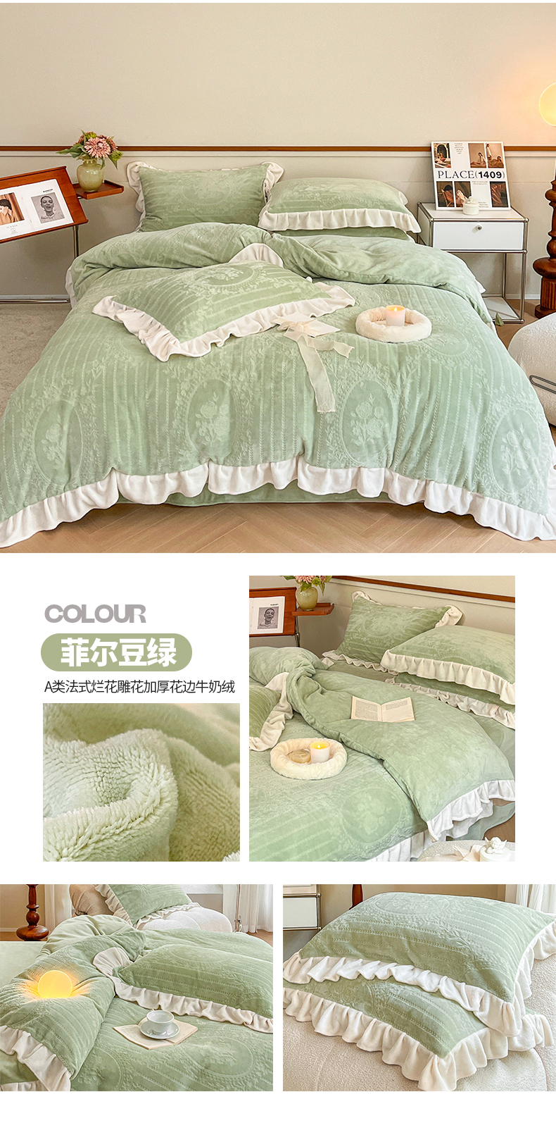 商品名称:桃子家居 2023新款A类高克重230克法式烂花雕花提花加厚韩版花边牛奶绒四件套 绒烂花-菲尔豆绿