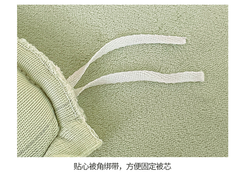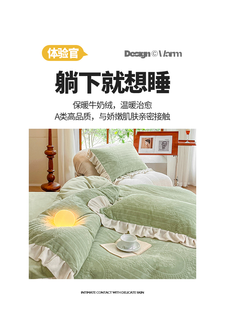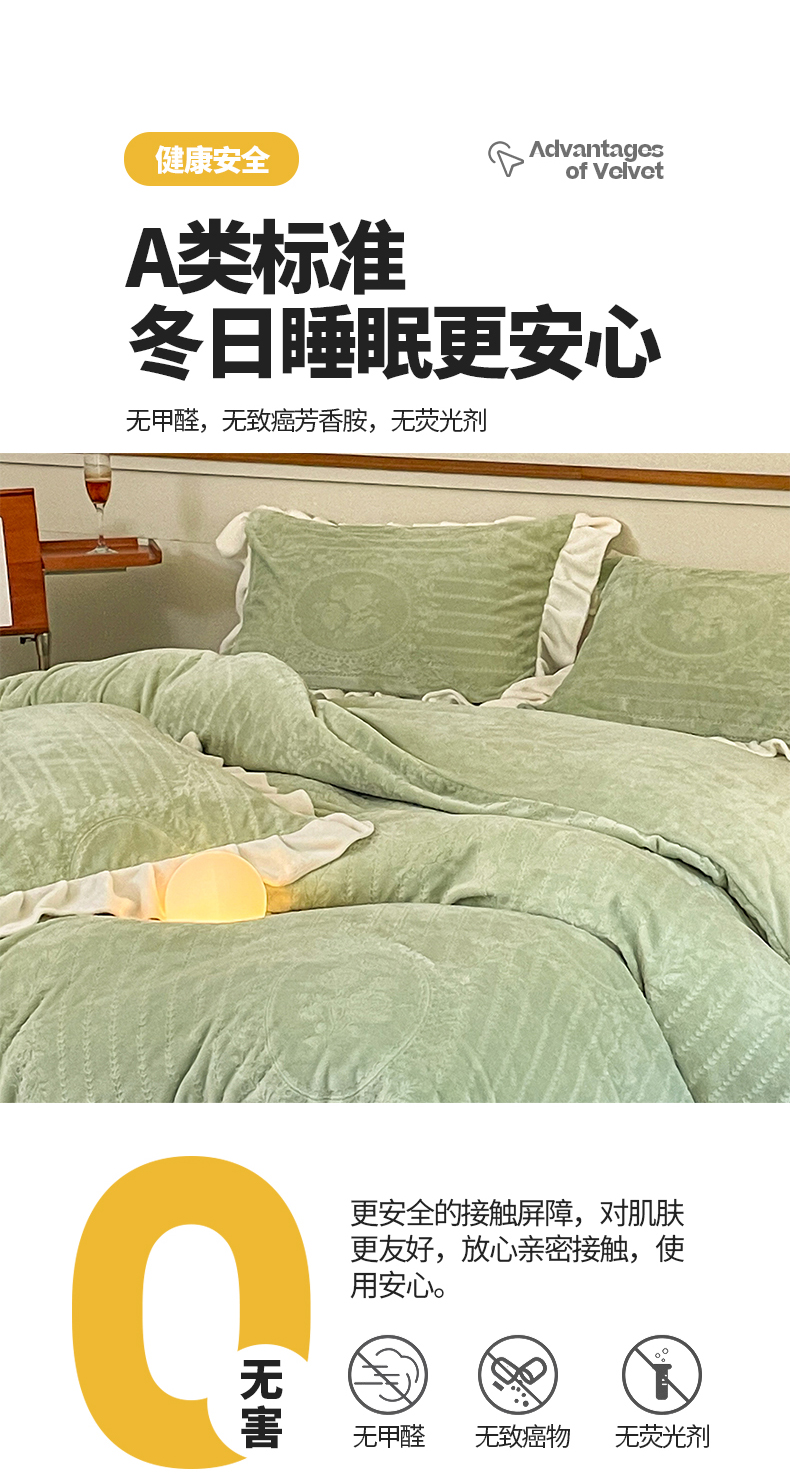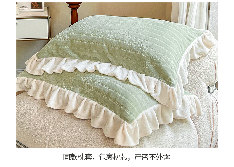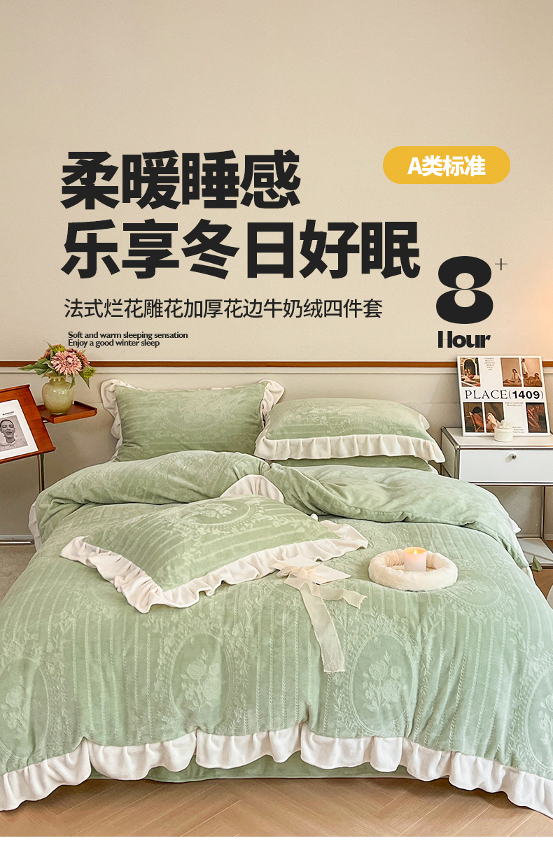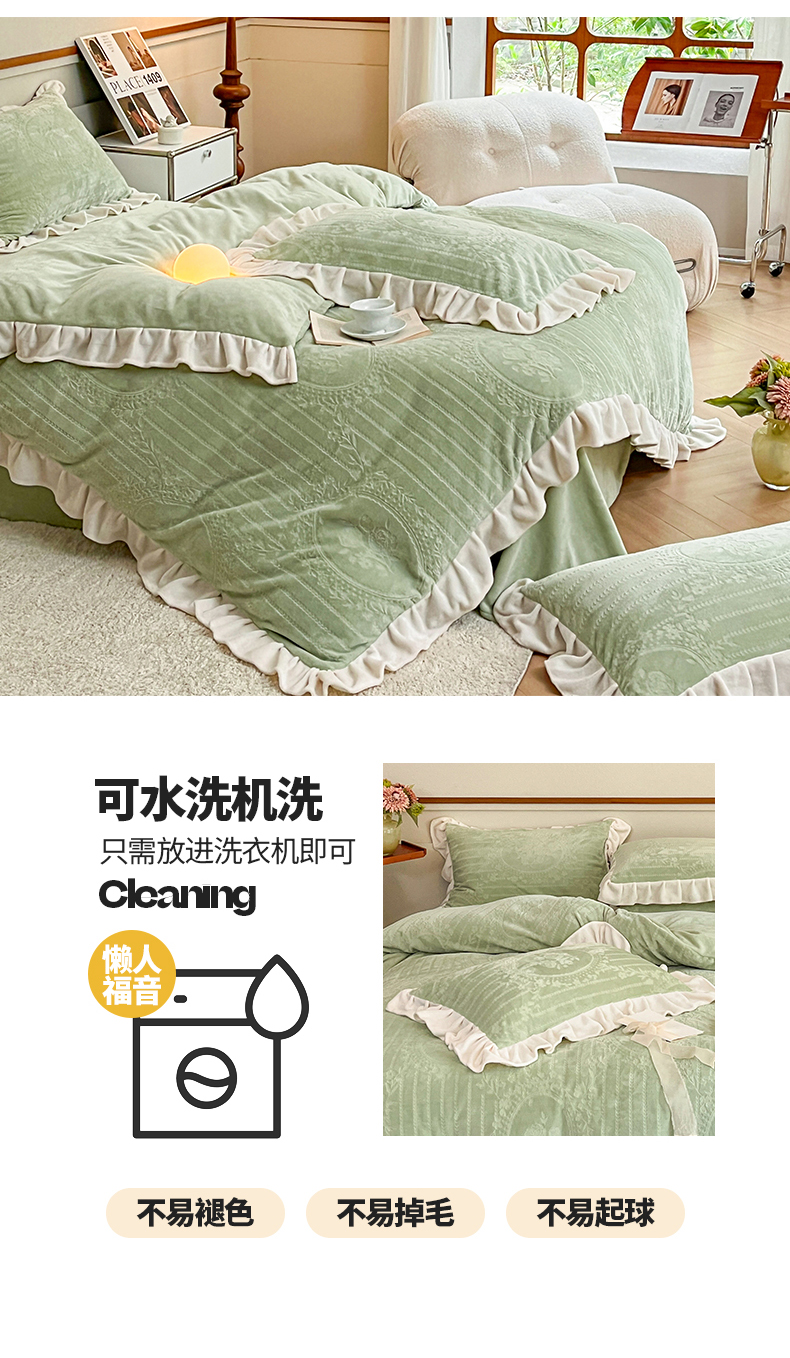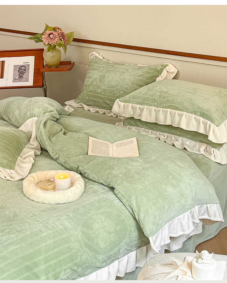 商品名称:桃子家居 2023新款A类高克重230克法式烂花雕花提花加厚韩版花边牛奶绒四件套 绒烂花-菲尔豆绿
