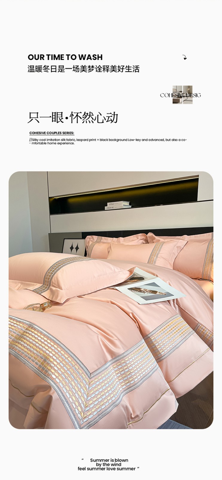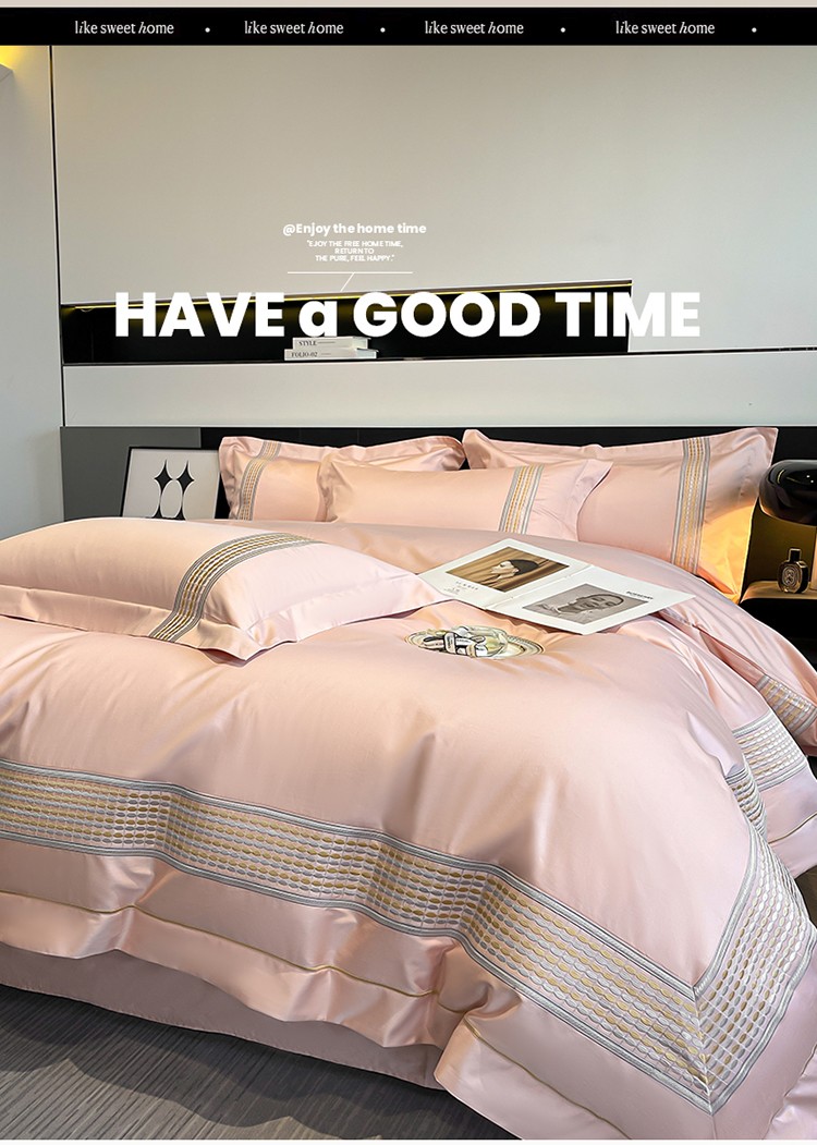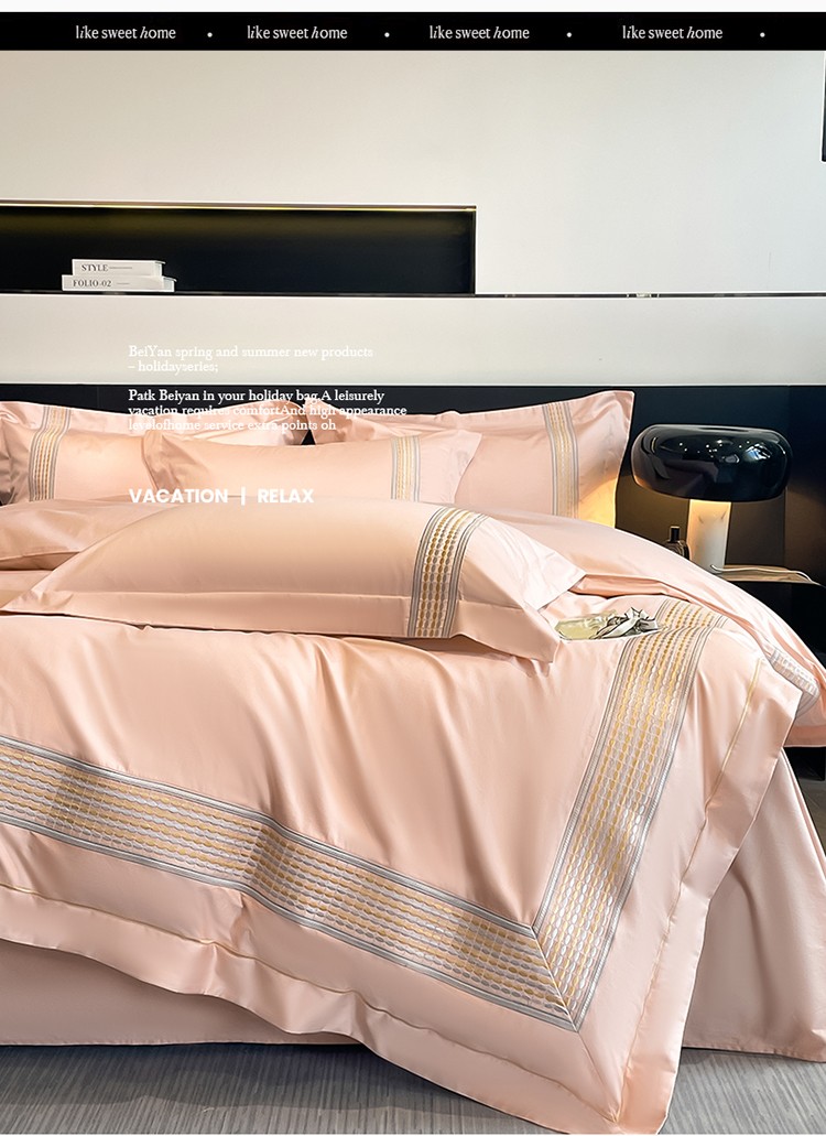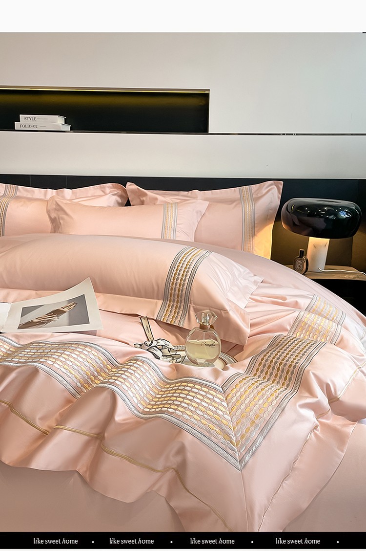 高档礼盒装七星级酒店风双面加密加厚100%纯棉全棉刺绣四件套长绒棉床笠 极光-粉