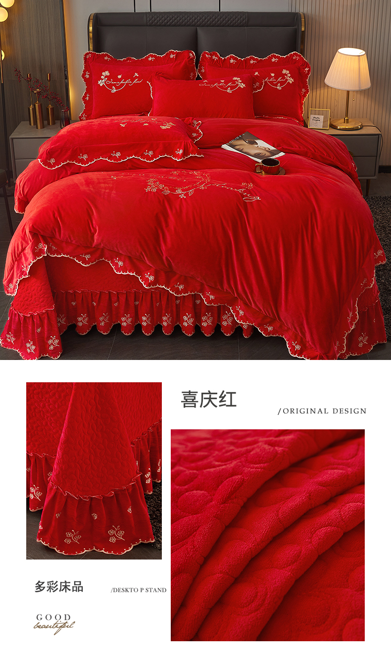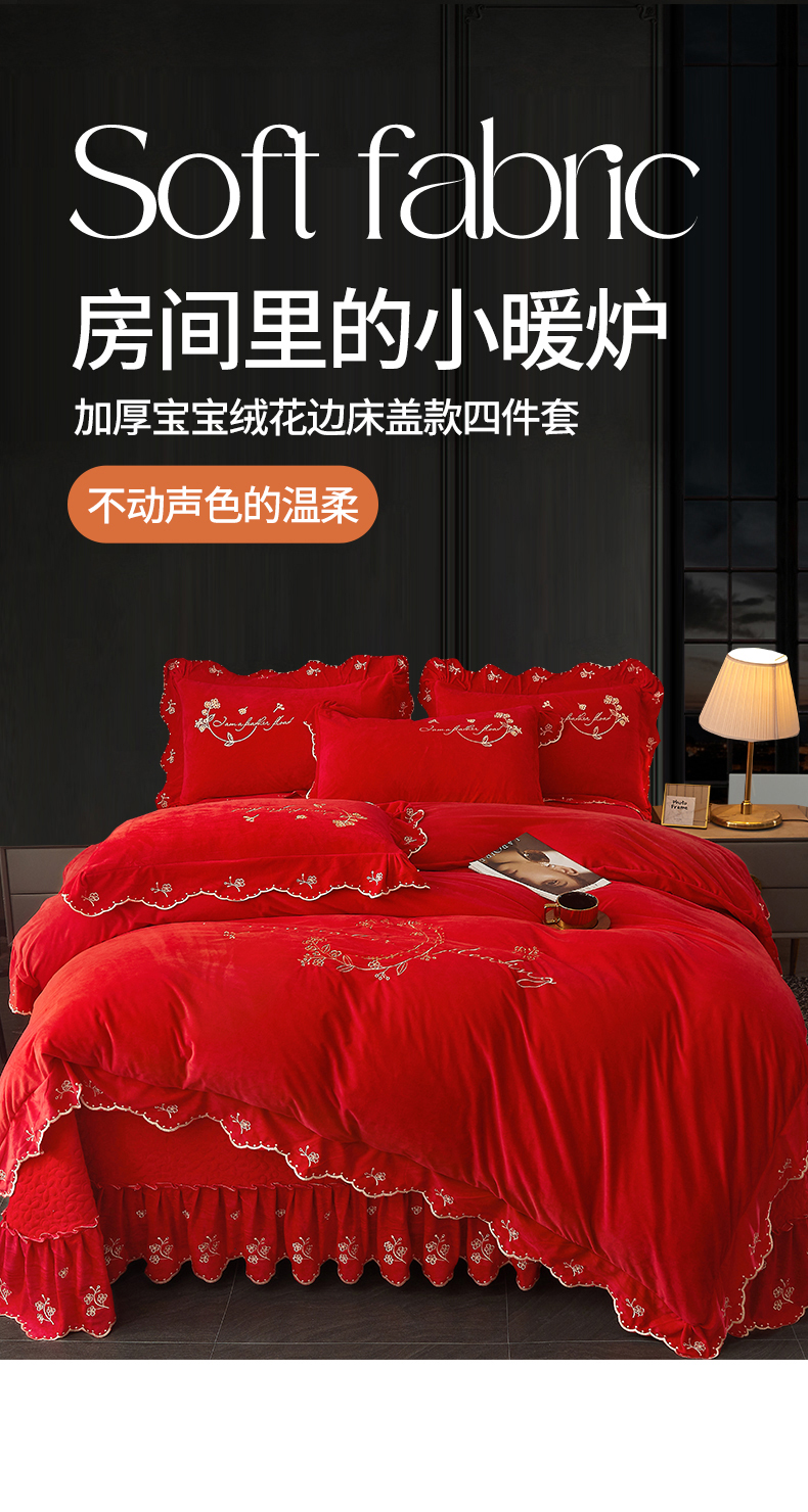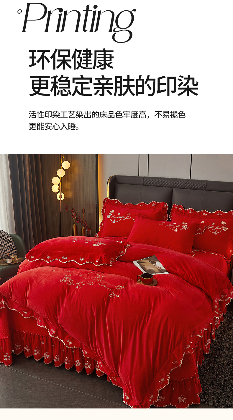(总)恒爱 2022秋冬水晶绒翩翩花舞夹棉床裙四件套,大红色,豆沙红,橄榄绿,公主粉,桔色,咖啡色,孔雀绿,拉菲红,罗兰紫,玫红色,美人玉,米白色,米驼色,抹茶绿,浅灰色,紫色