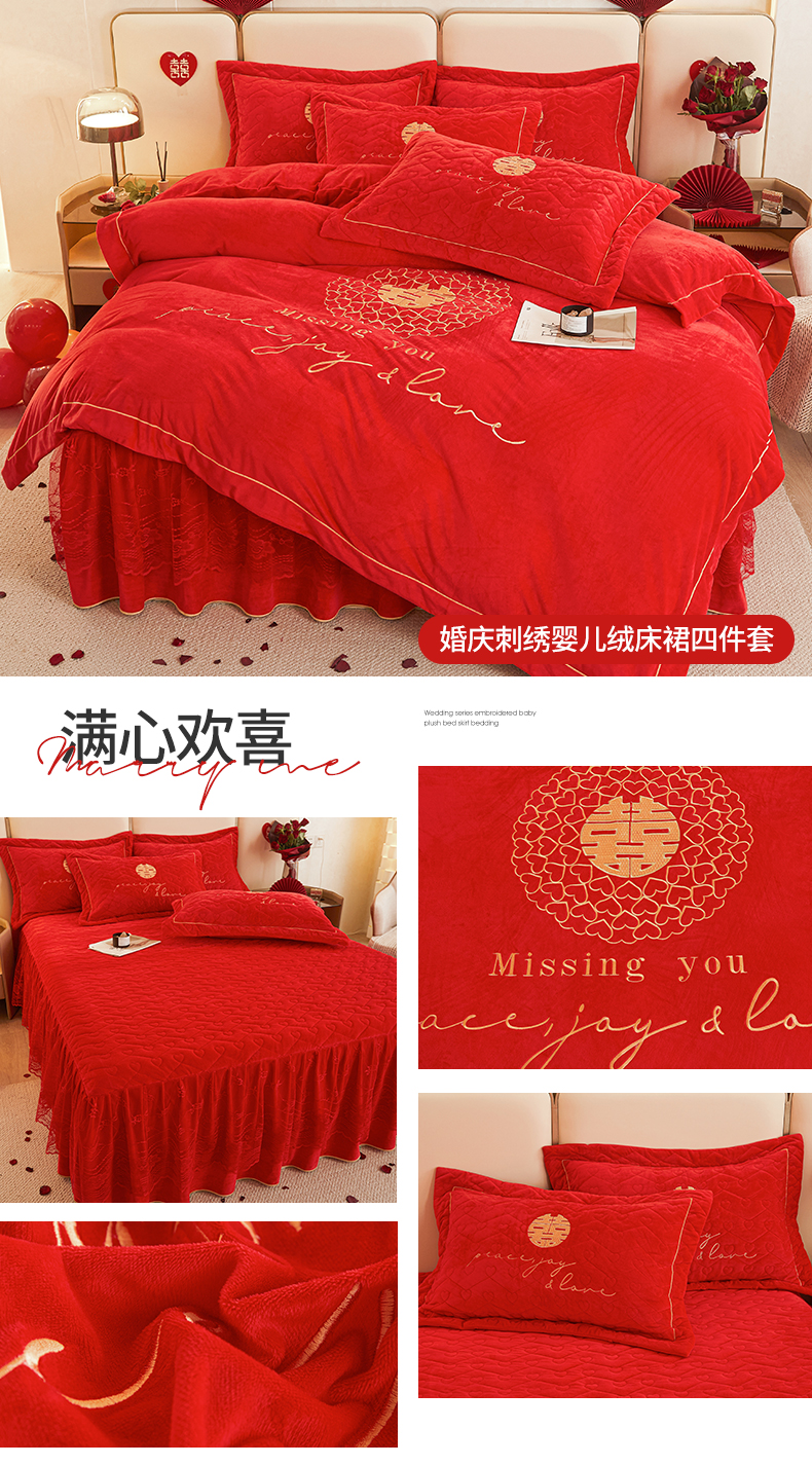 当前位置: 91家纺网 > 商品网购 > 床品套件 > 四件套 > 宜凡家纺 2023秋冬新品新品婴儿绒婚庆床裙四件套 满心欢喜