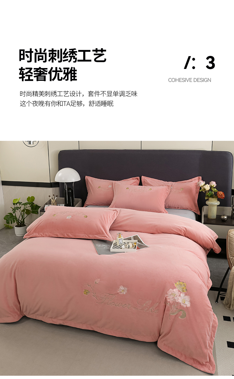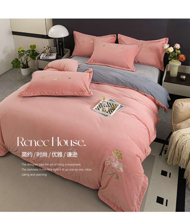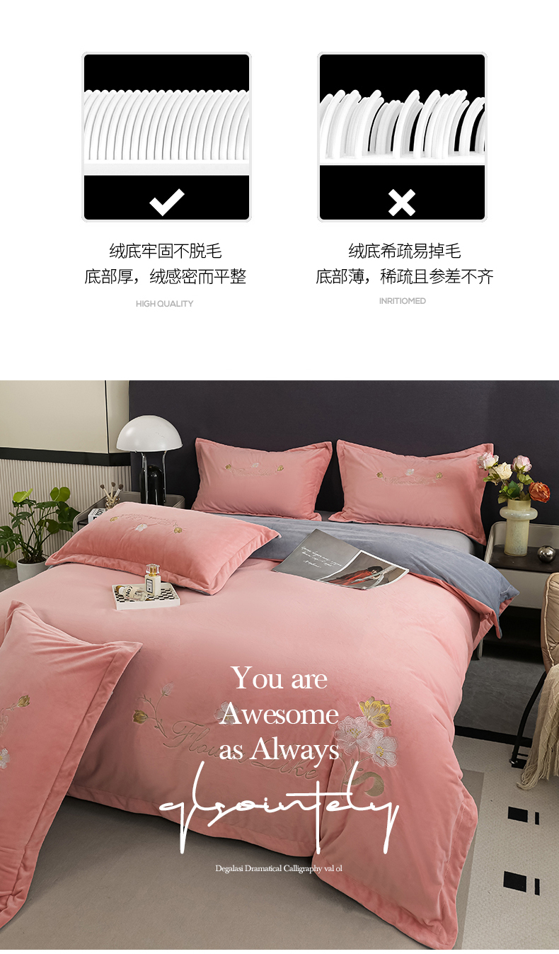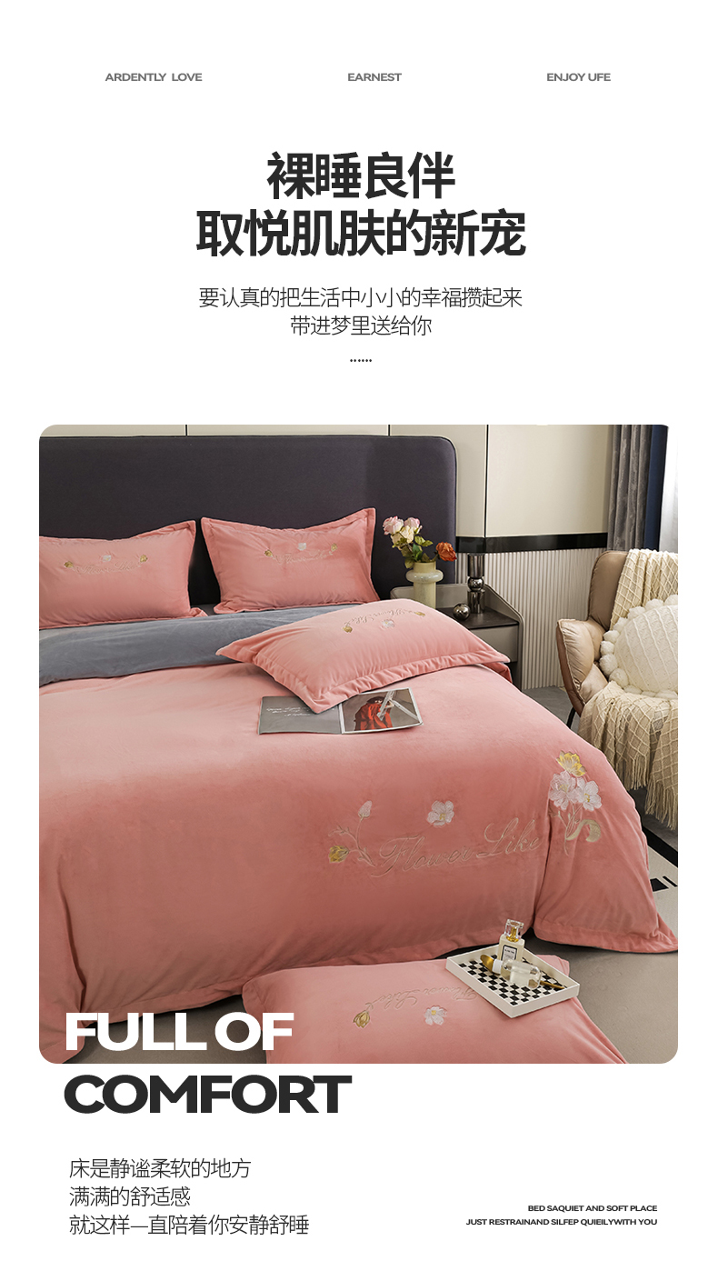 商品名称:银石 2023新款高克重婴儿绒宝宝绒轻奢绣花四件套 倾城 倾城(粉)