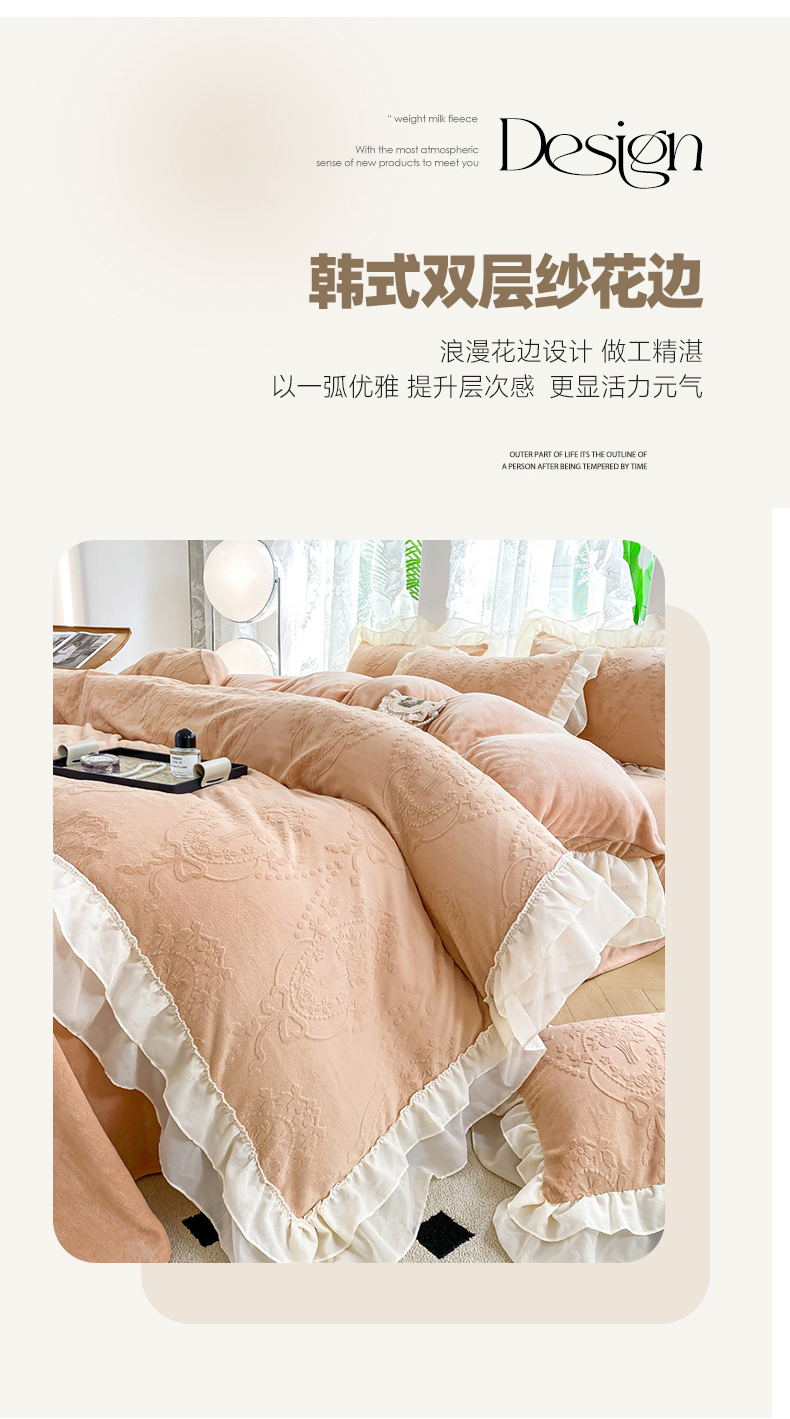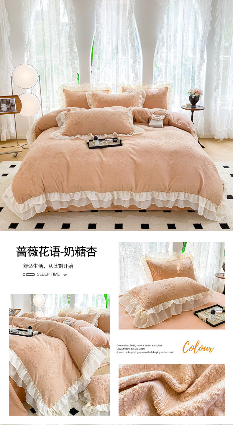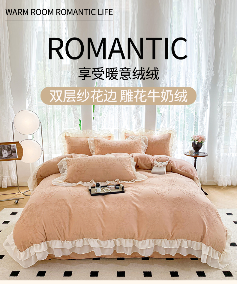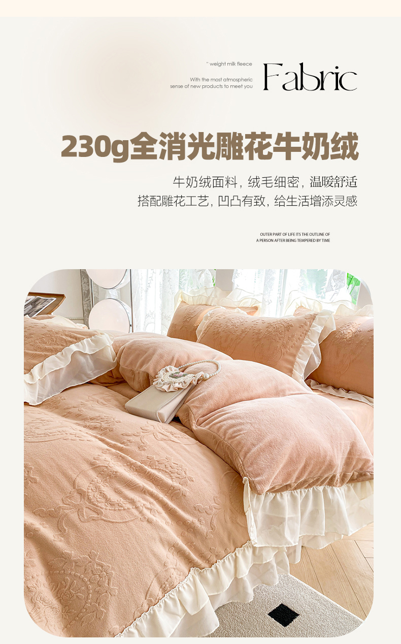 商品名称:大米家居 2023新款法式双层边230克雕花牛奶绒蔷薇花语系列四件套 蔷薇花语-奶糖杏