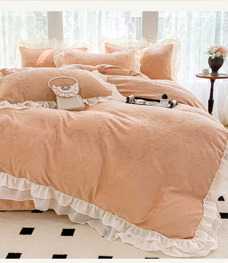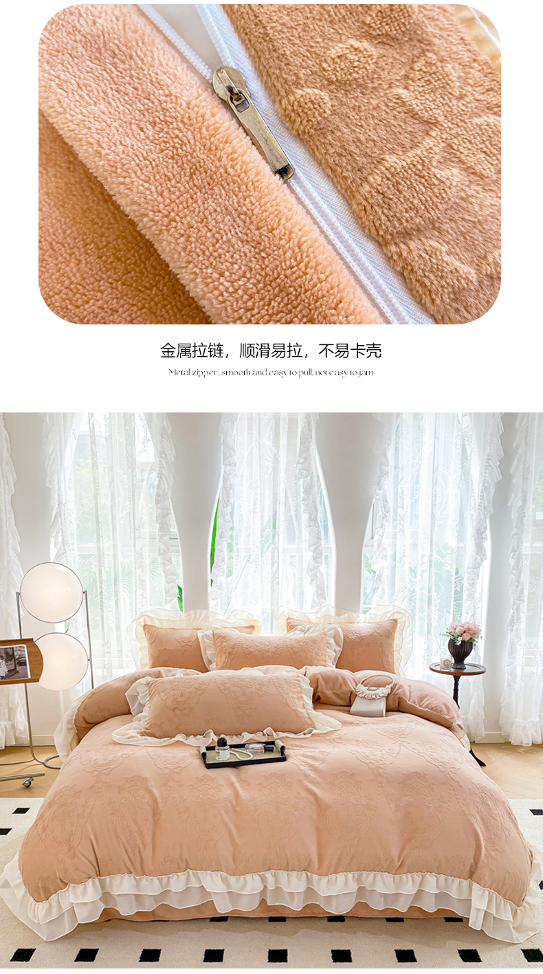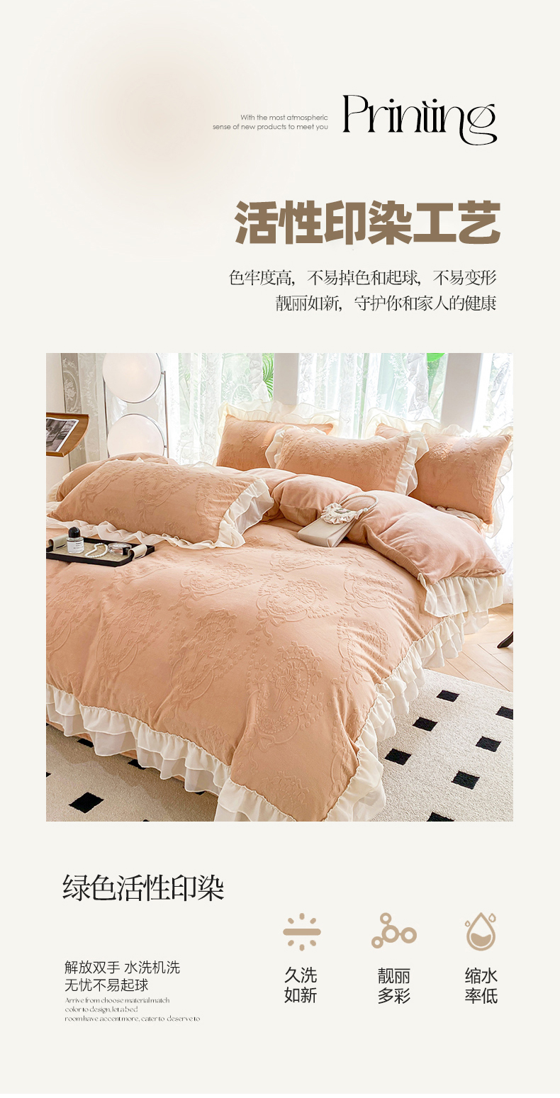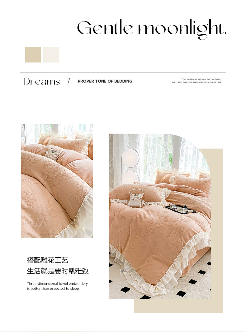 商品名称:大米家居 2023新款法式双层边230克雕花牛奶绒蔷薇花语系列四件套 蔷薇花语-奶糖杏