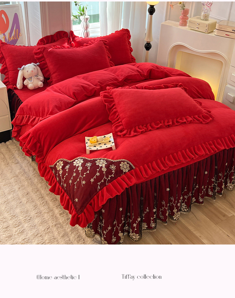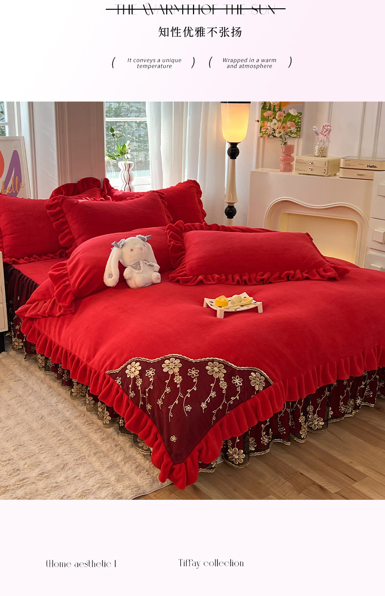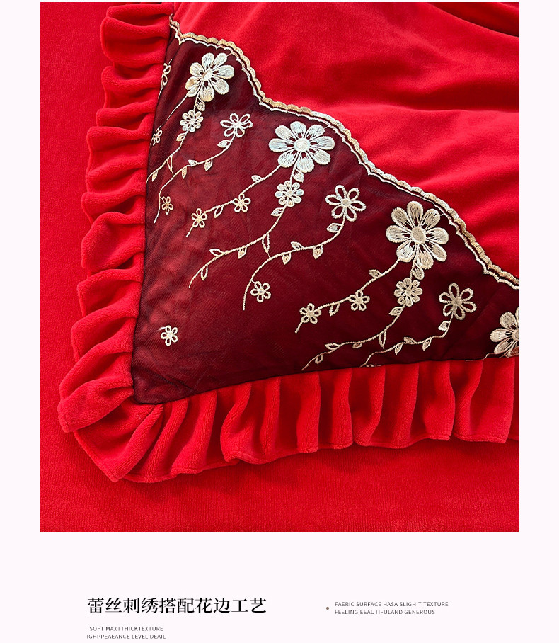 唐人居 2025新款加厚牛奶绒蕾丝花边四件套-花颜 花颜-玫瑰红