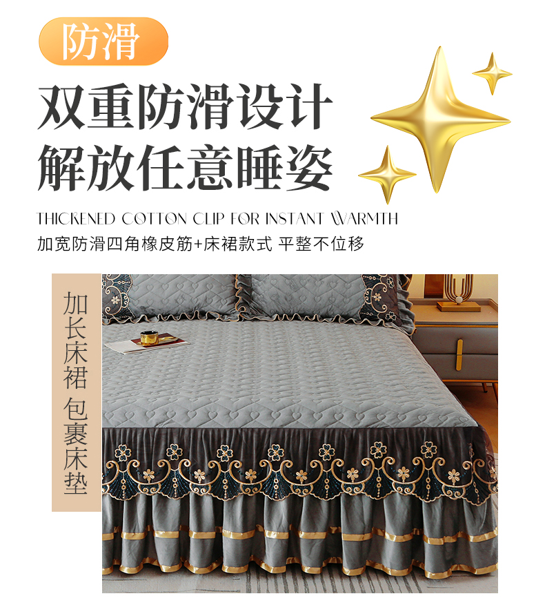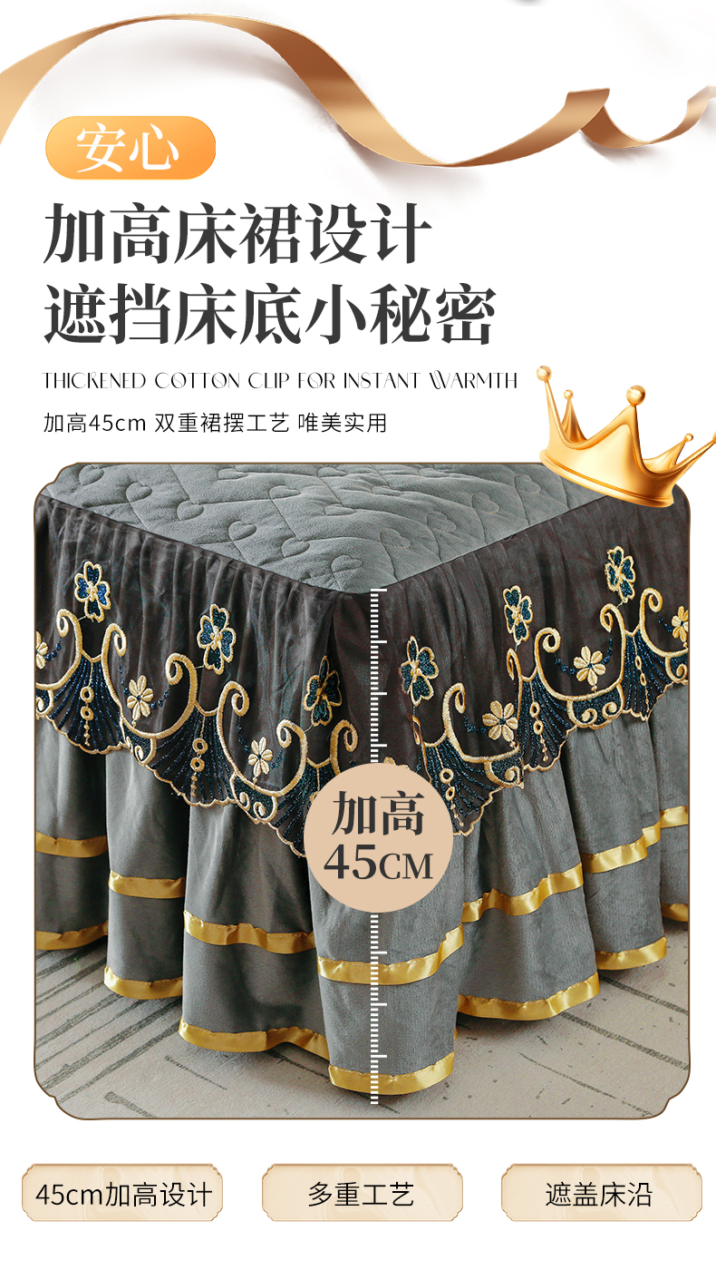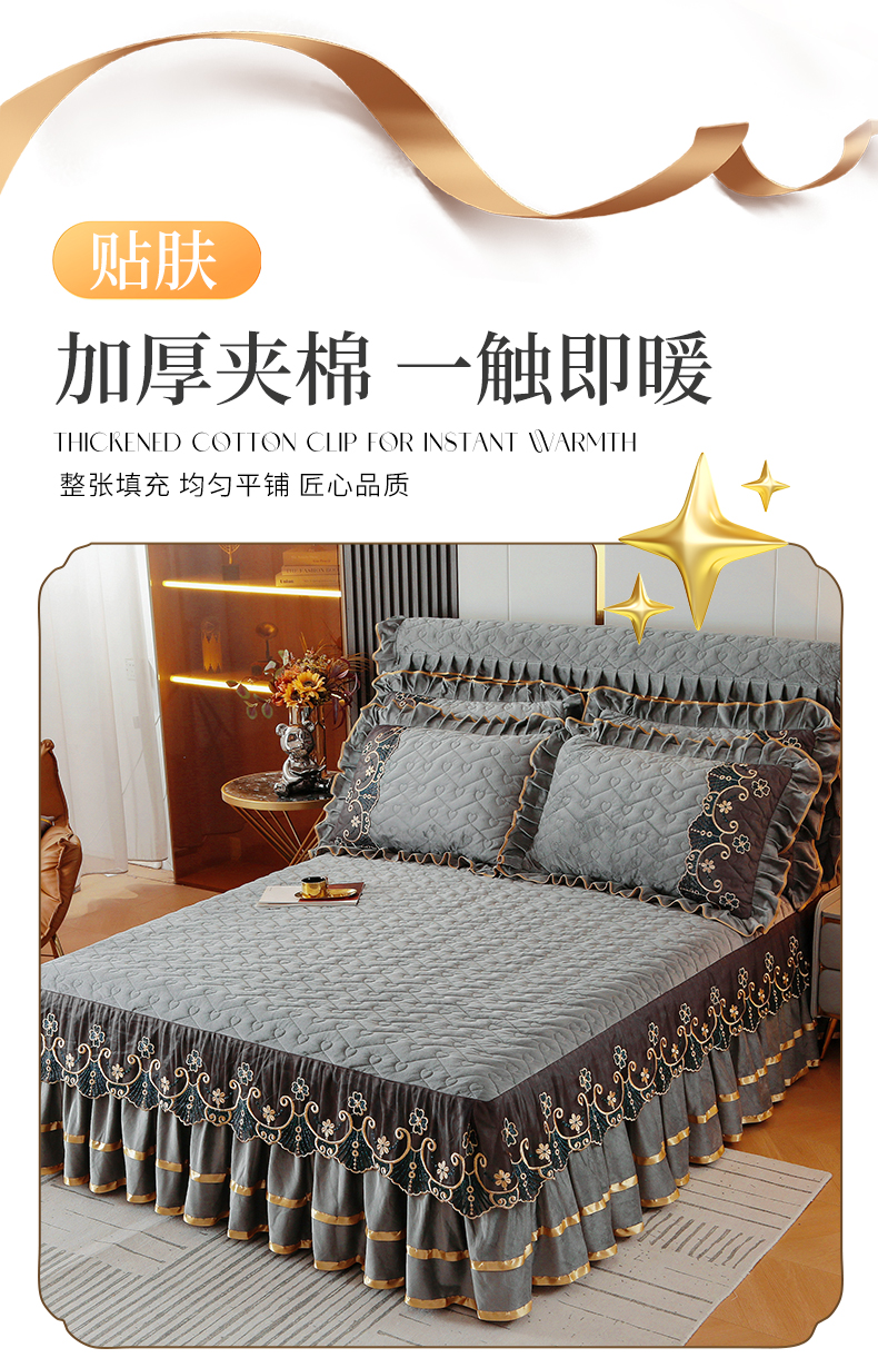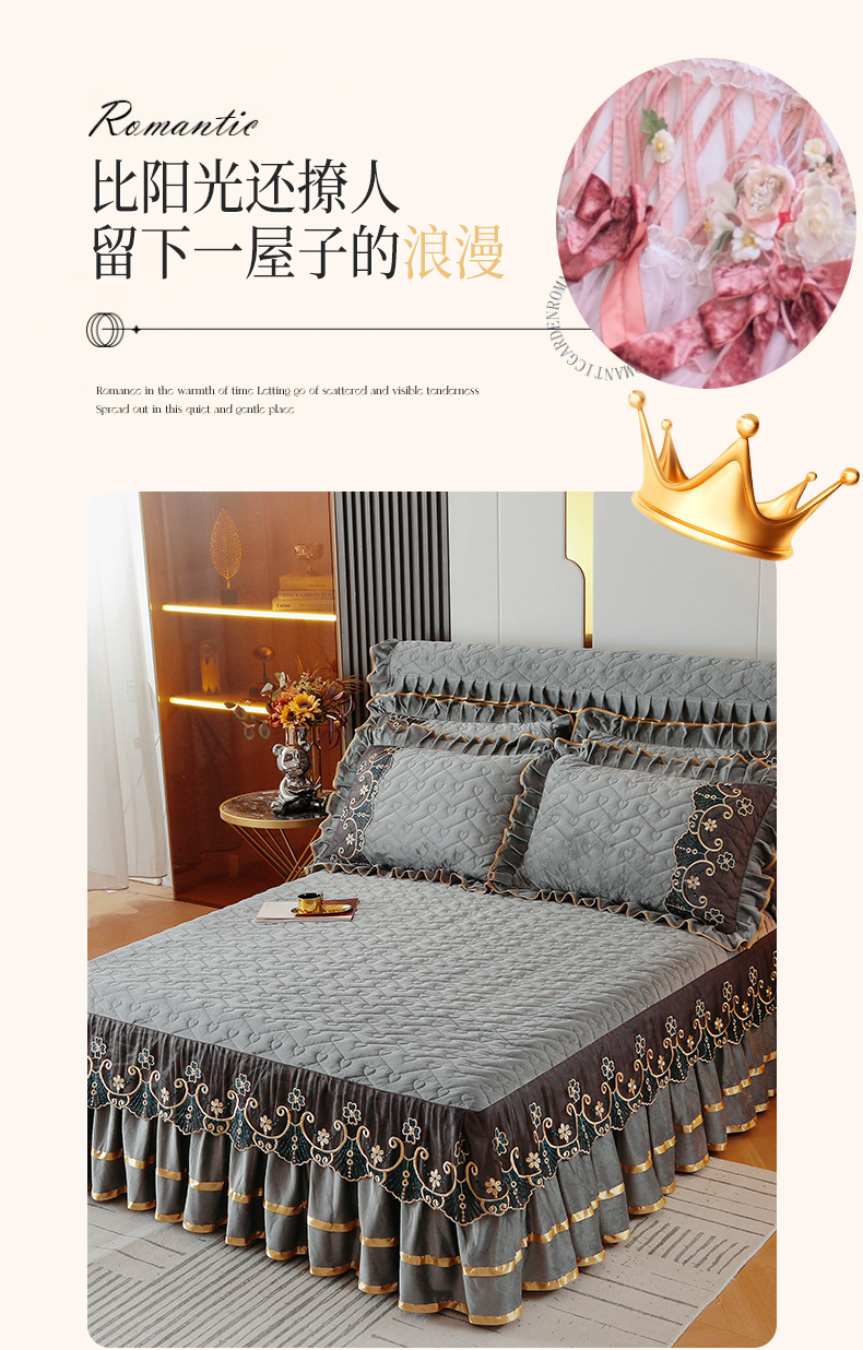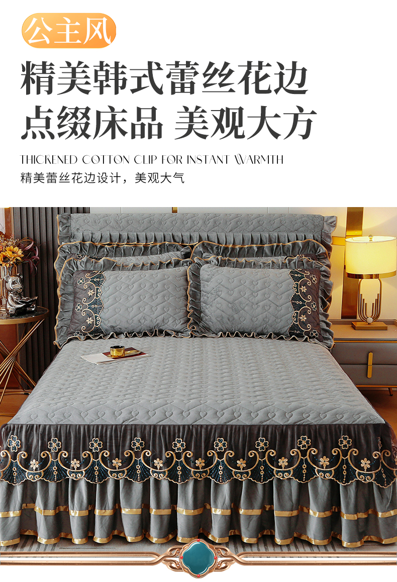 (总)屹成家纺2025新款水晶绒夹棉绗缝蕾丝床裙三件套(塞纳河畔)床裙单件起售价不低于105元,大红,豆沙,翡翠绿,粉玉,橄榄绿,蔚蓝,银灰