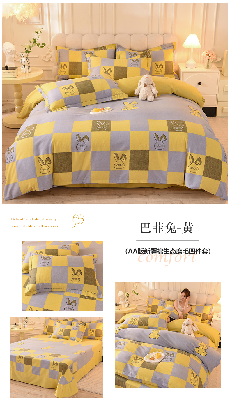 当前位置: 91家纺网 > 商品网购 > 床品套件 > 四件套 > 全棉普通四件套 > 巧玲珑 2023新款高支高密A版生态四件套 巴菲兔-黄